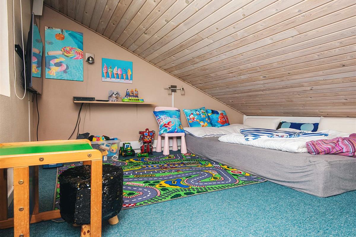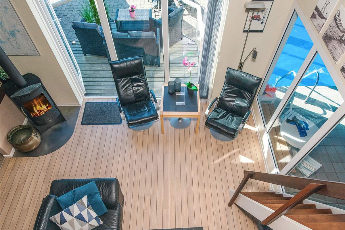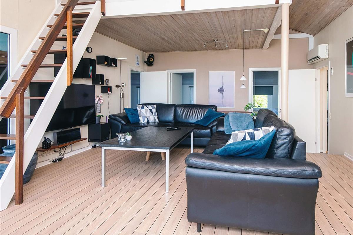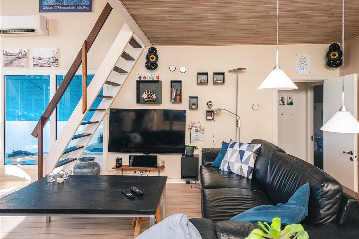 Im Wohnzimmer gibt es einen Flachbildfernseher mit Satellitenschüssel, DVD/Radio und Soundsystem, das an den Fernseher angeschlossen ist. Gemütliche Beleuchtung. Vom Wohnzimmer führt zudem eine Treppe (mit Schutzgitter) hinauf zum Hems mit zwei Schlafplätzen, Fernseher mit DVD-Spieler und einem Fenster, das geöffnet werden kann.