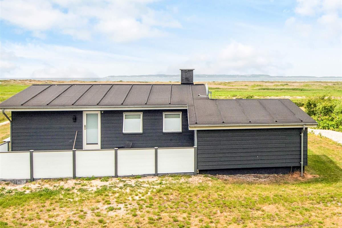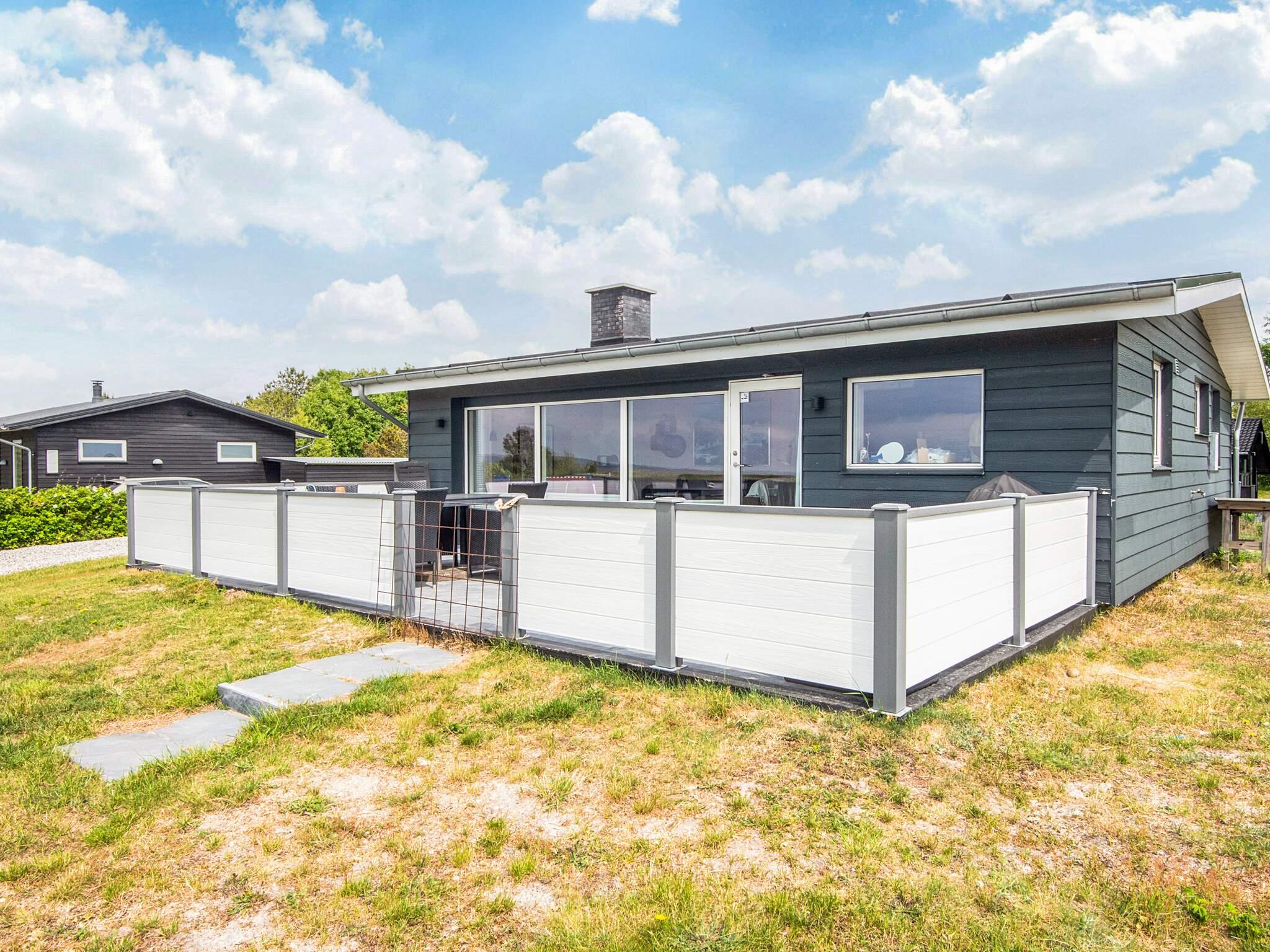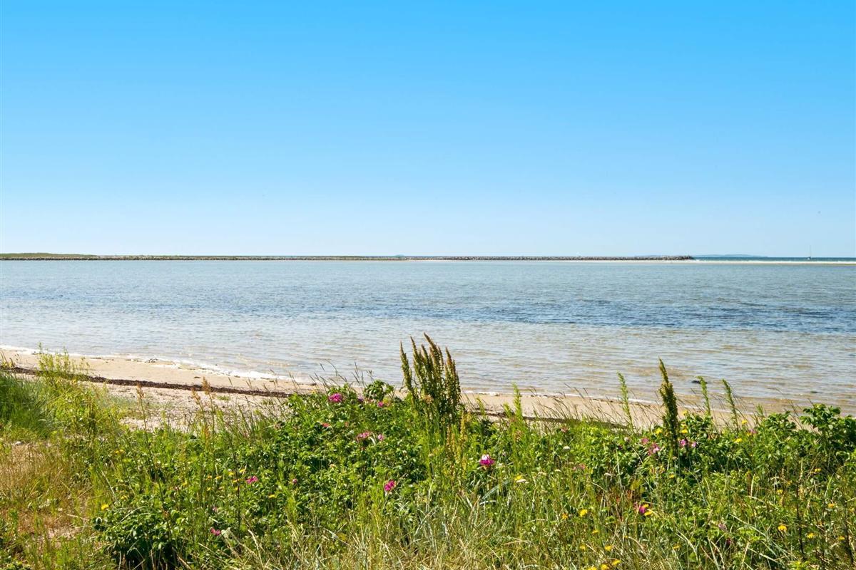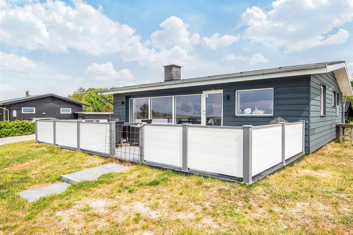 Das Ferienhaus liegt leicht erhöht im Vergleich zu den anderen Häusern der Gegend und bietet daher uneingeschränkten Panoramaausblick zur Küstenlandschaft und zum Wasser am Horizont. Dort sind an klaren Tagen u.a. auch die Insel Hjelm, der Ort Helgenæs, Schiffe und Fähren sowie einige Kite-Surfer zu beobachten. Das Haus hat auf beiden Seiten Terrassenflächen, die je nach Tageszeit Sonne bieten.