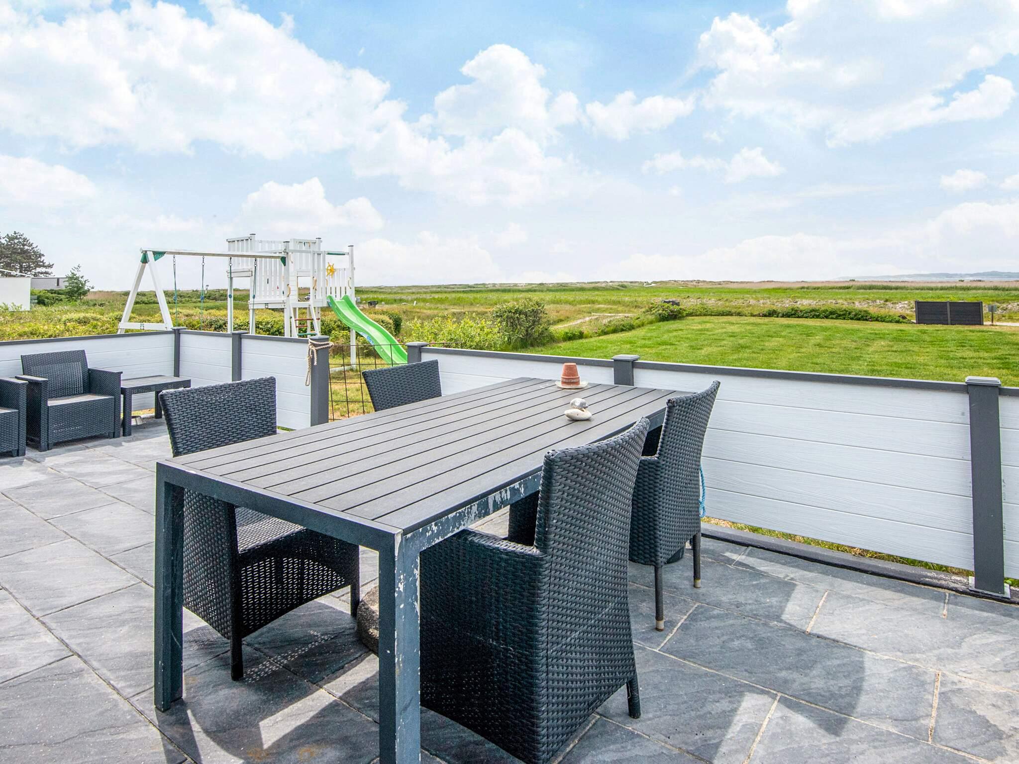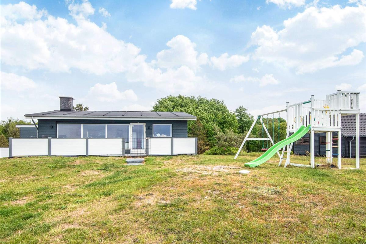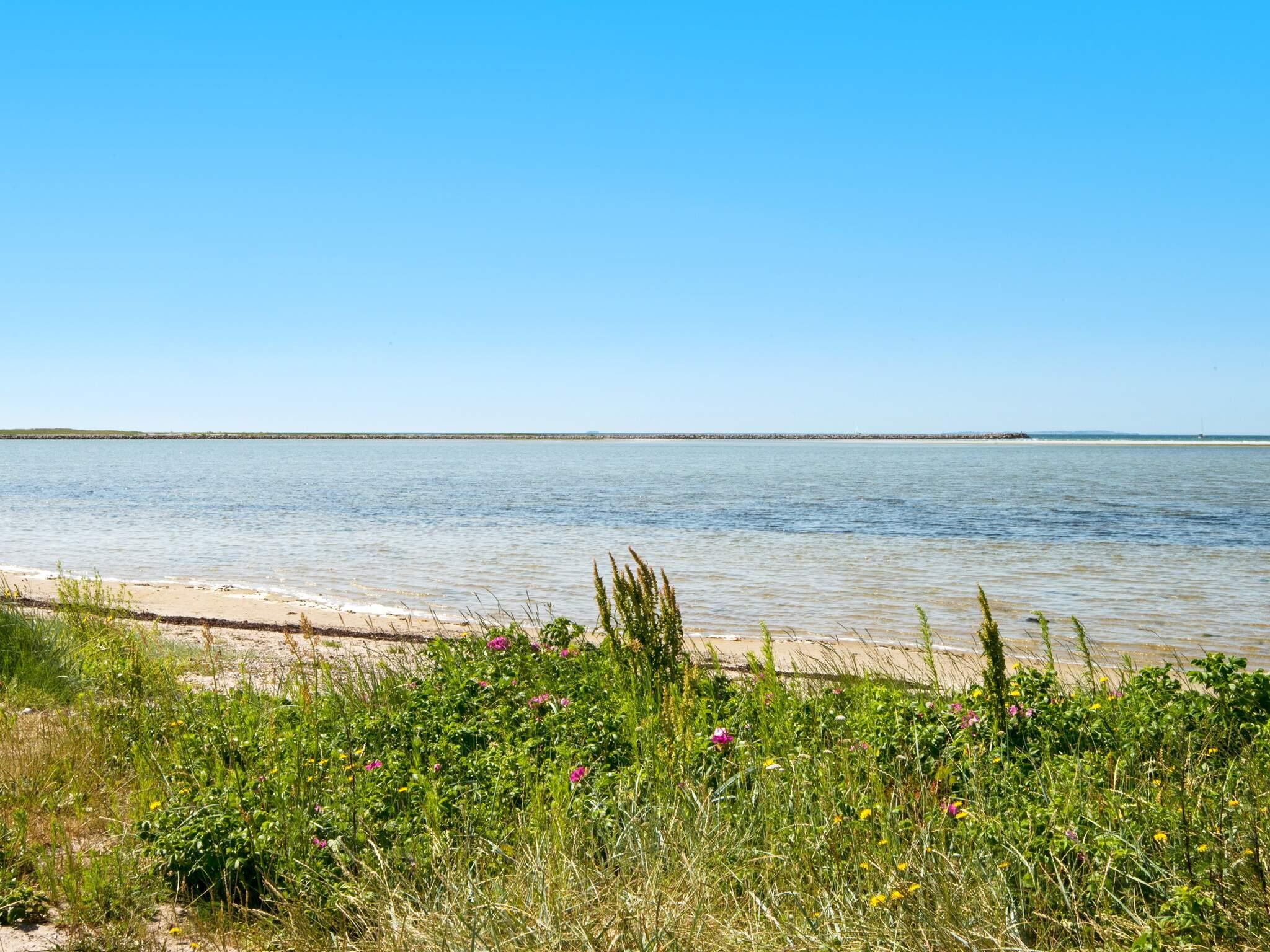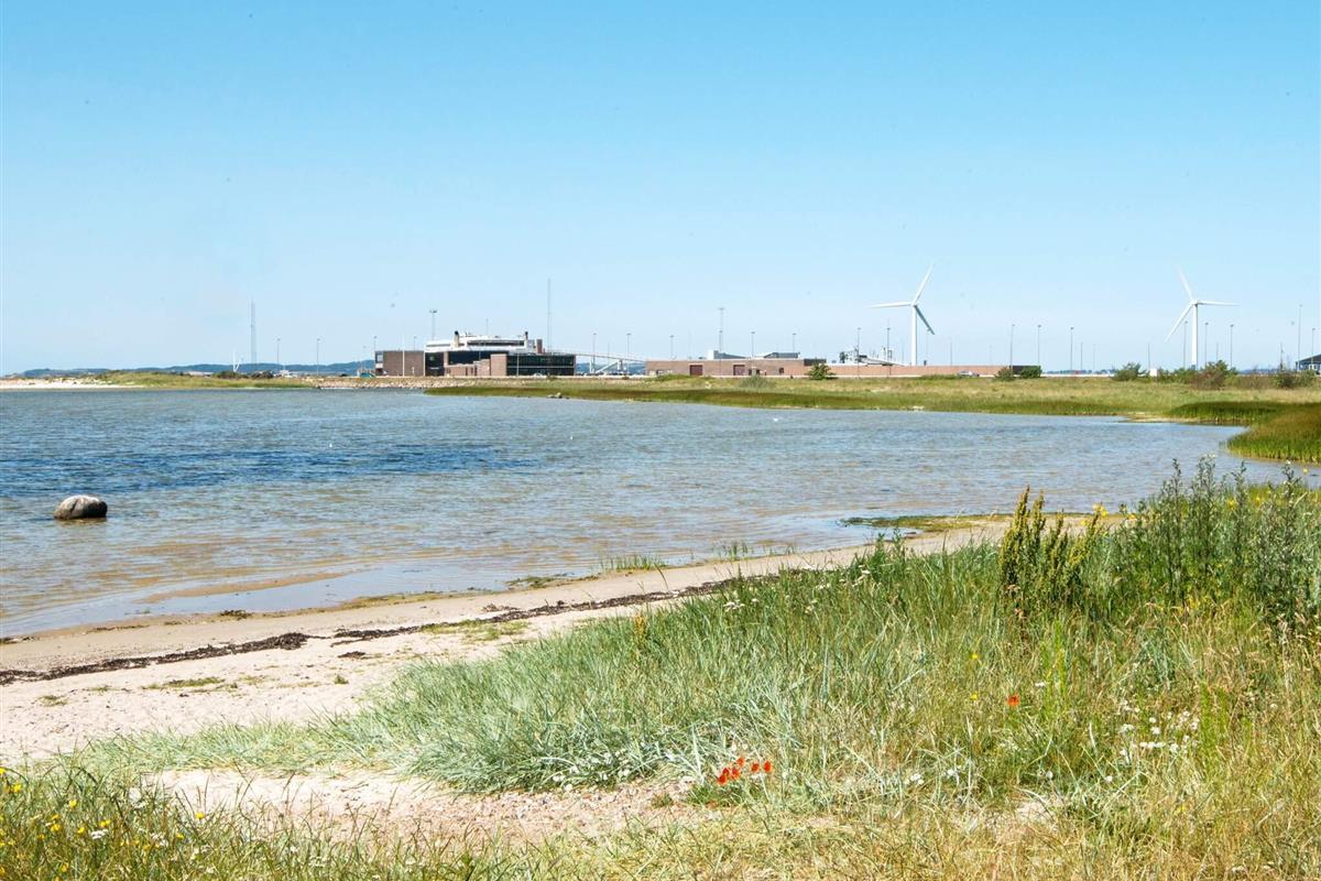 Das Ferienhaus liegt leicht erhöht im Vergleich zu den anderen Häusern der Gegend und bietet daher uneingeschränkten Panoramaausblick zur Küstenlandschaft und zum Wasser am Horizont. Dort sind an klaren Tagen u.a. auch die Insel Hjelm, der Ort Helgenæs, Schiffe und Fähren sowie einige Kite-Surfer zu beobachten. Das Haus hat auf beiden Seiten Terrassenflächen, die je nach Tageszeit Sonne bieten.