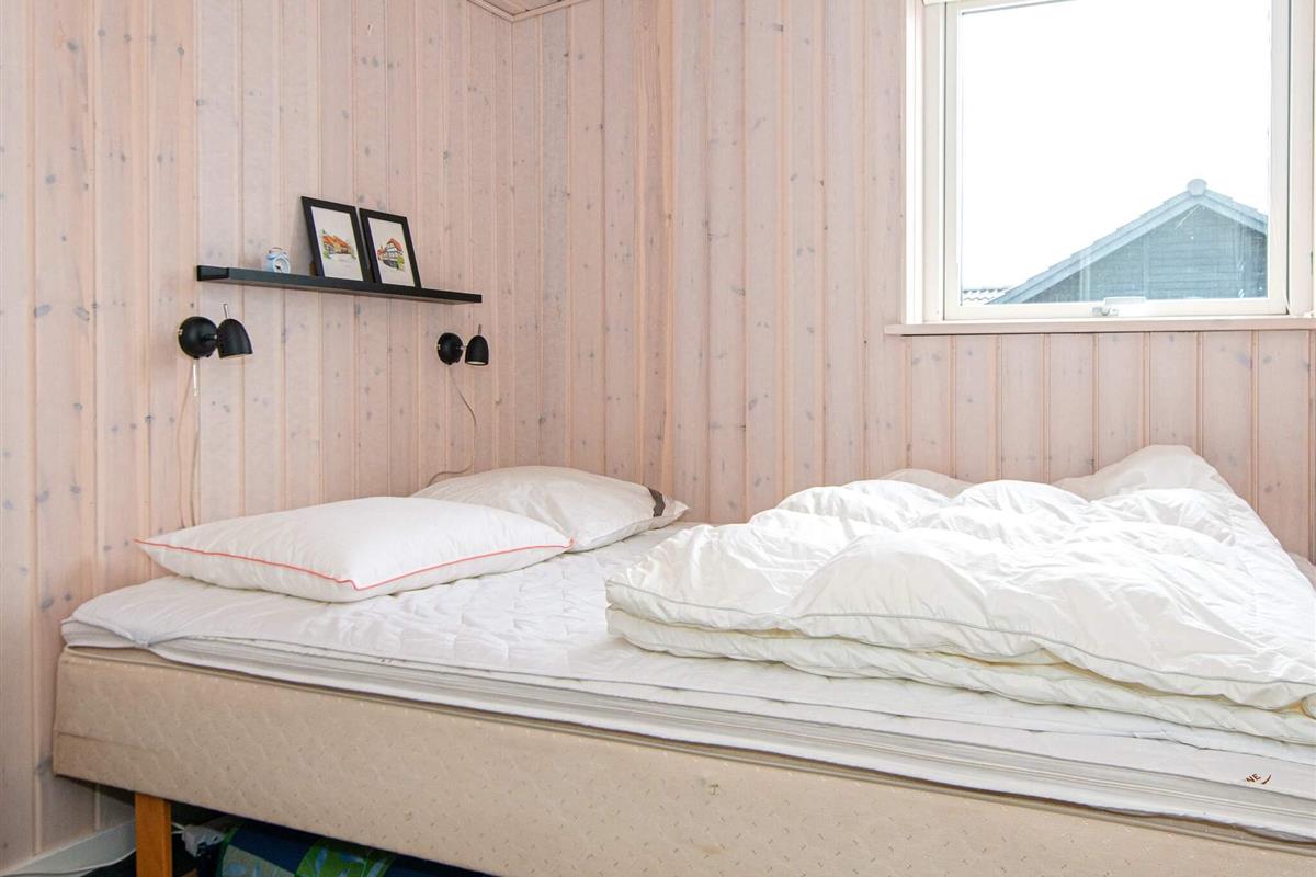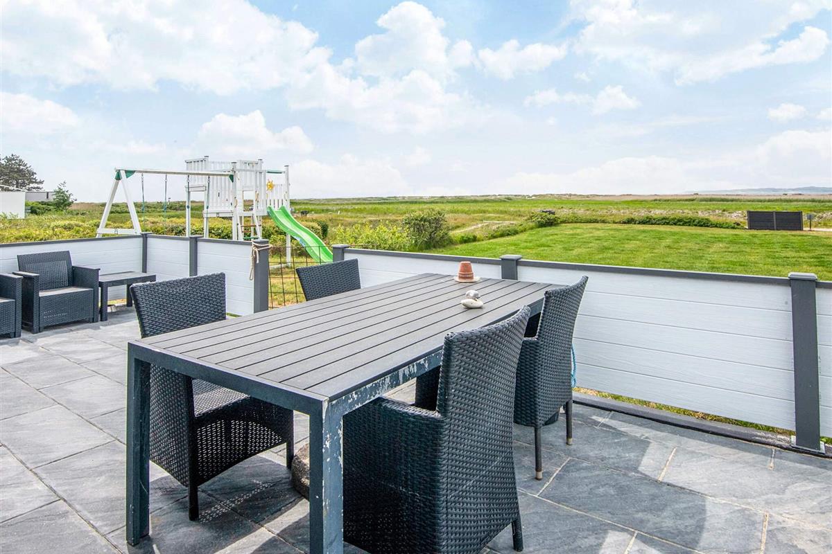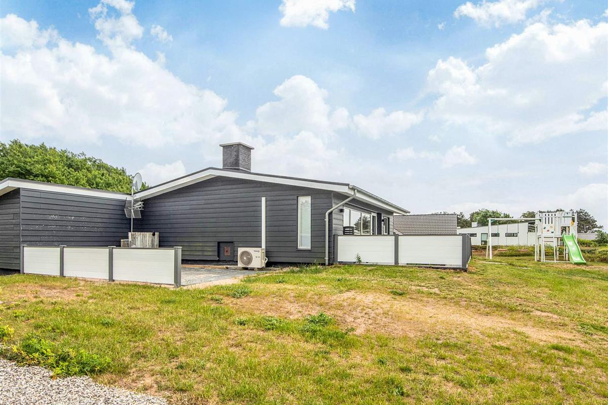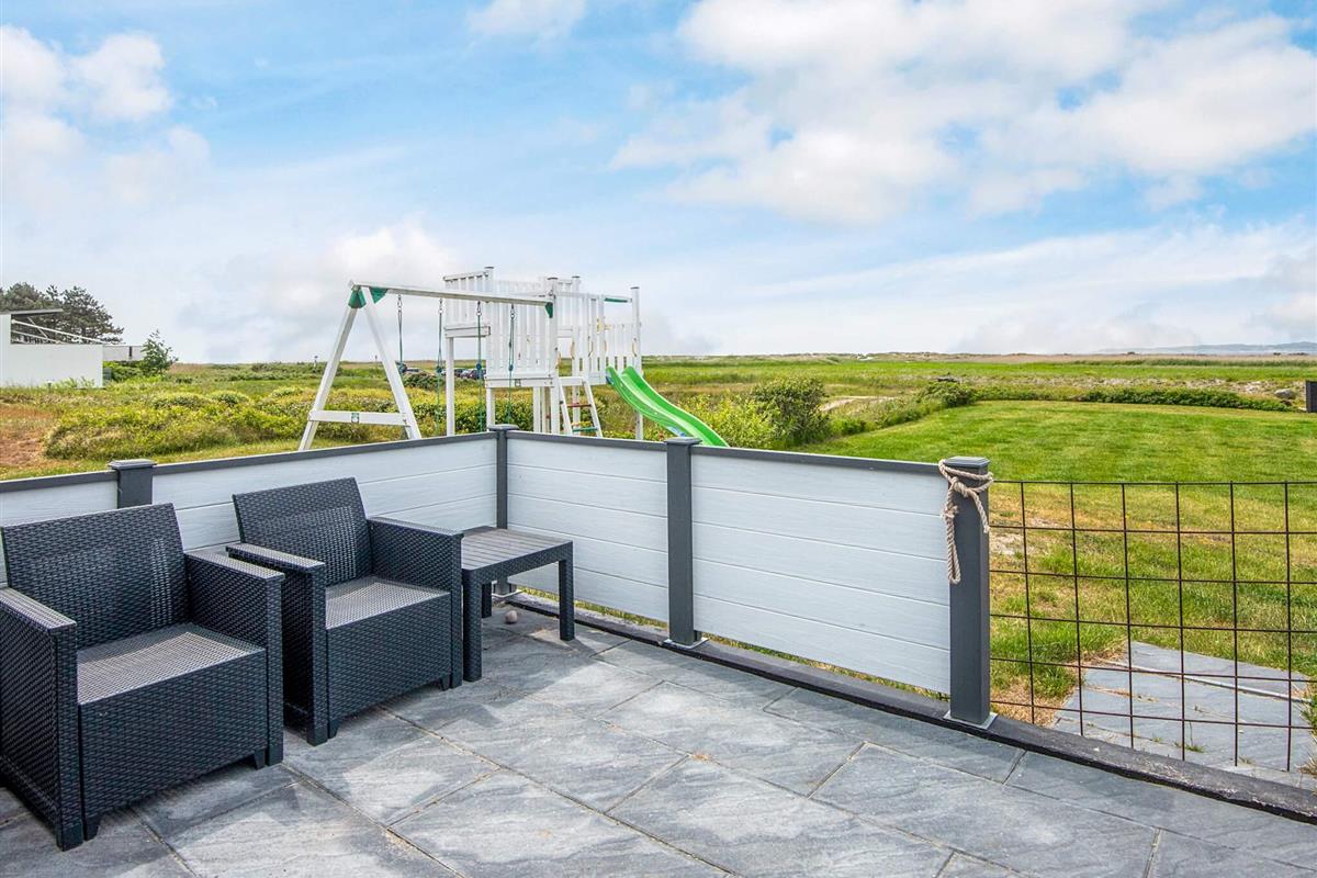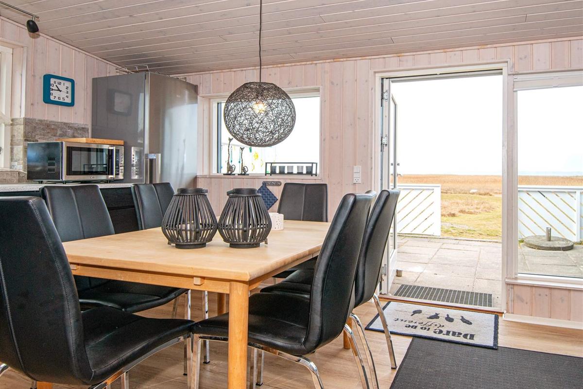 Das Ferienhaus liegt leicht erhöht im Vergleich zu den anderen Häusern der Gegend und bietet daher uneingeschränkten Panoramaausblick zur Küstenlandschaft und zum Wasser am Horizont. Dort sind an klaren Tagen u.a. auch die Insel Hjelm, der Ort Helgenæs, Schiffe und Fähren sowie einige Kite-Surfer zu beobachten. Das Haus hat auf beiden Seiten Terrassenflächen, die je nach Tageszeit Sonne bieten.