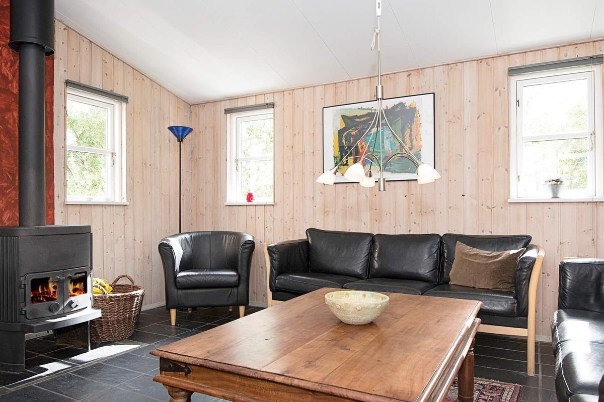 Im Wohnzimmer herrscht eine gemütliche Atmosphäre, da sich der Holzofen in der Mitte des Raumes befindet. An das kombinierte Wohn-/Esszimmer schließt sich die gut ausgestattete Küche an, u.a. mit einem Geschirrspüler und einer Mikrowelle. Wohnzimmer und Küche verfügen über angenehme Fußbodenheizung.