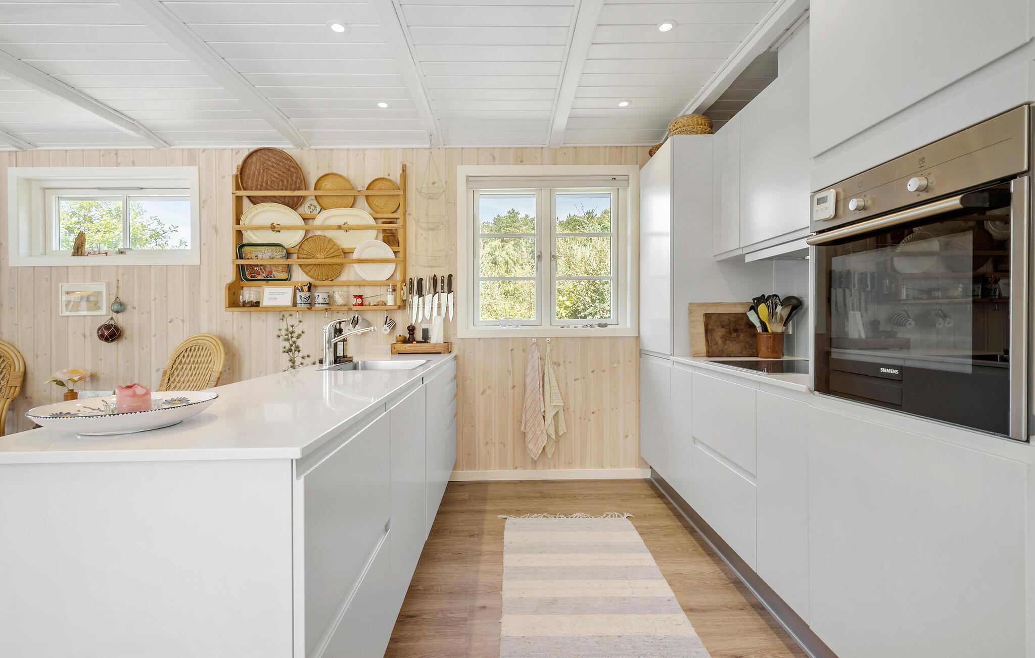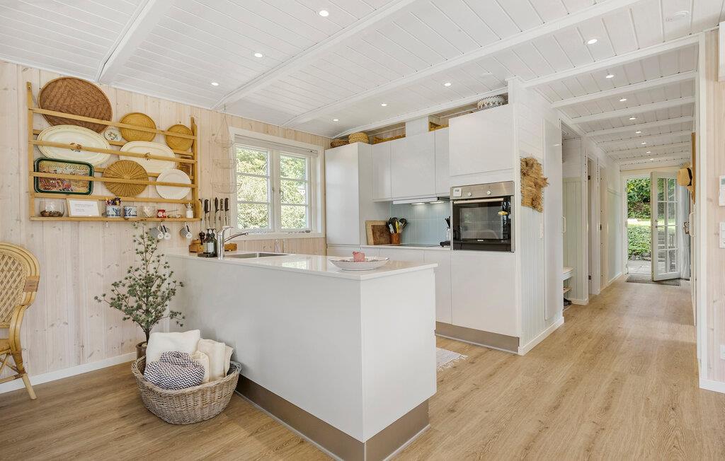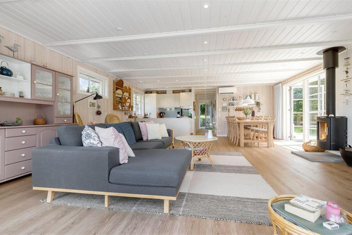 Dit uitnodigende vakantiehuis op Øer Strand biedt de ideale omgeving voor rust en ontspanning. Begin je dag met een heerlijk ontbijt aan de eettafel met uitzicht op de betoverende tuin voordat je neerstrijkt op de comfortabele bank in de gezellig ingerichte woonkamer. Het open ontwerp van de keuken en woonkamer creëert een warme, uitnodigende sfeer die perfect is voor een gezellig samenzijn met familie of vrienden.