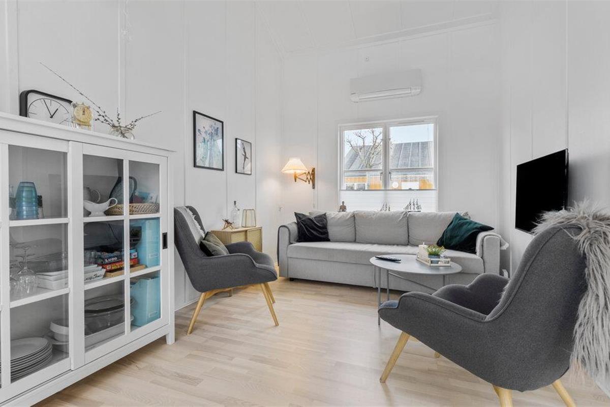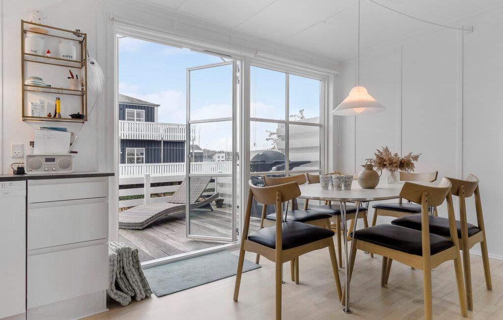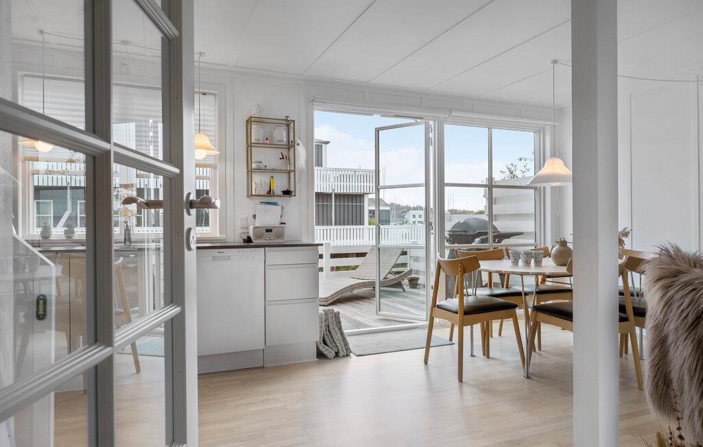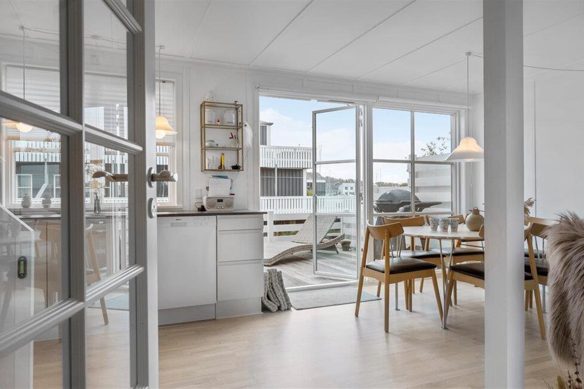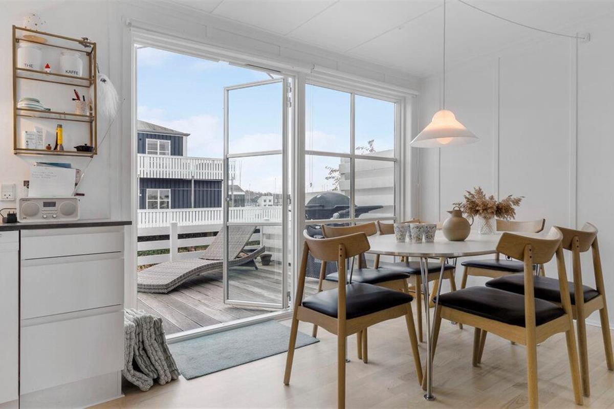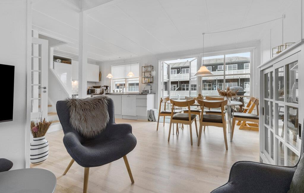 Je uitnodigende vakantiehuis op Øer Strand biedt veel ruimte op twee niveaus en een modern, licht interieur, ideaal voor gezinnen of stellen die samen ontspannen dagen willen doorbrengen. De open woonkamer met eethoek en keuken leidt direct naar het terras en creëert een luchtige, uitnodigende sfeer. Op het omheinde terras, voorzien van comfortabel tuinmeubilair, kun je genieten van het uitzicht op de boten in de haven en de dag beginnen met een ontspannen ontbijt in de buitenlucht. Het uitzicht op de haven nodigt je uit om te ontspannen en de maritieme flair op te snuiven.