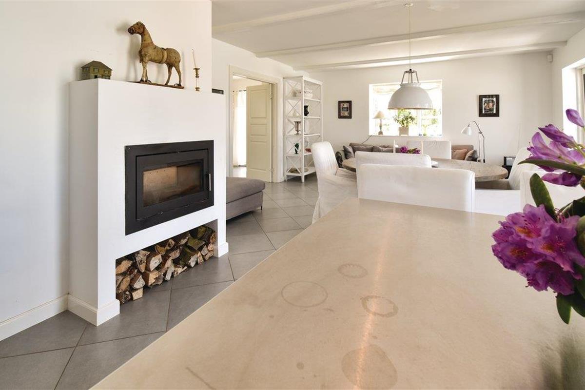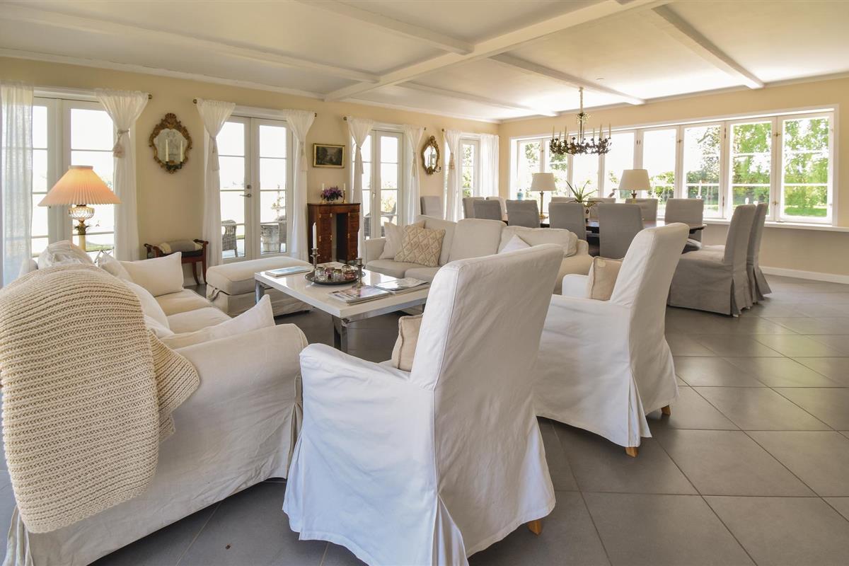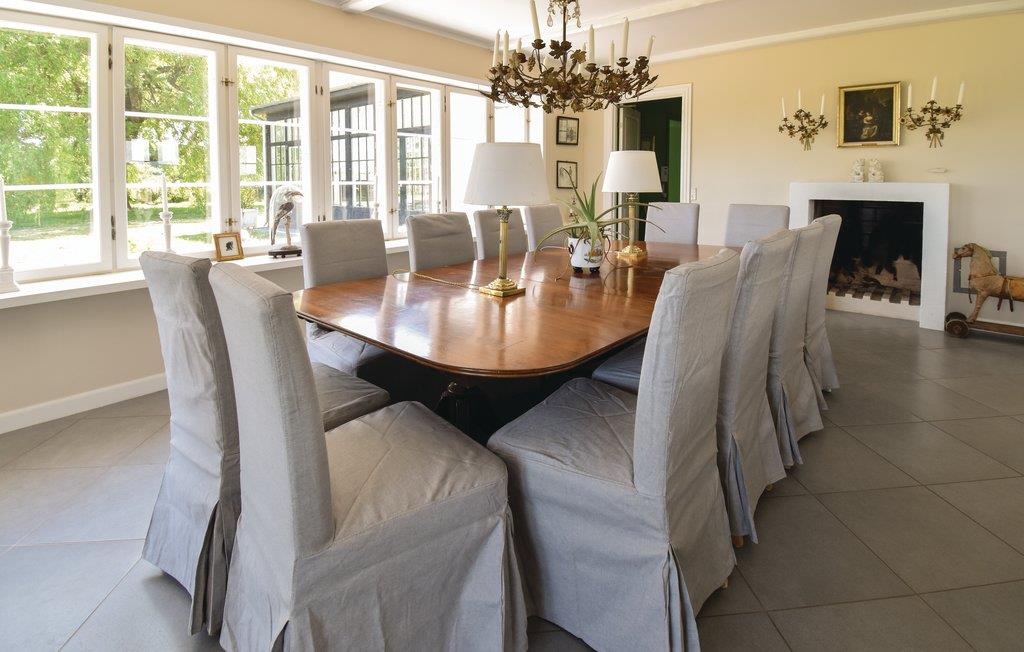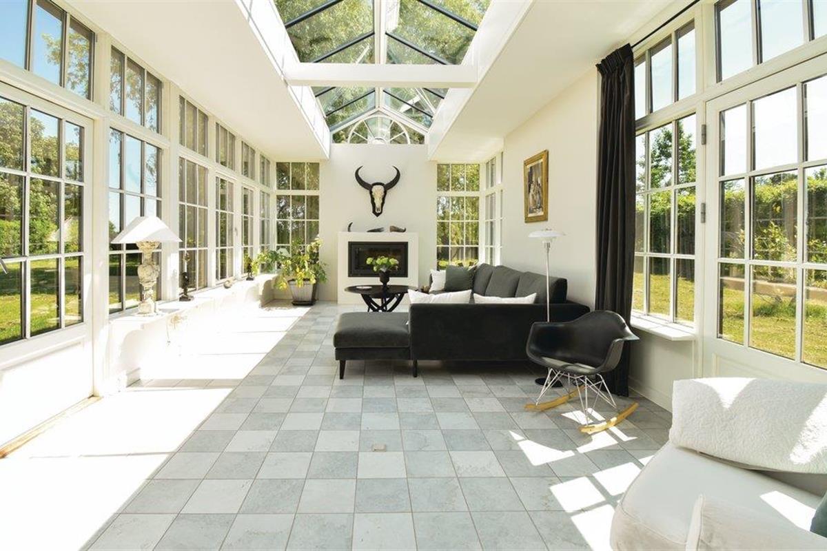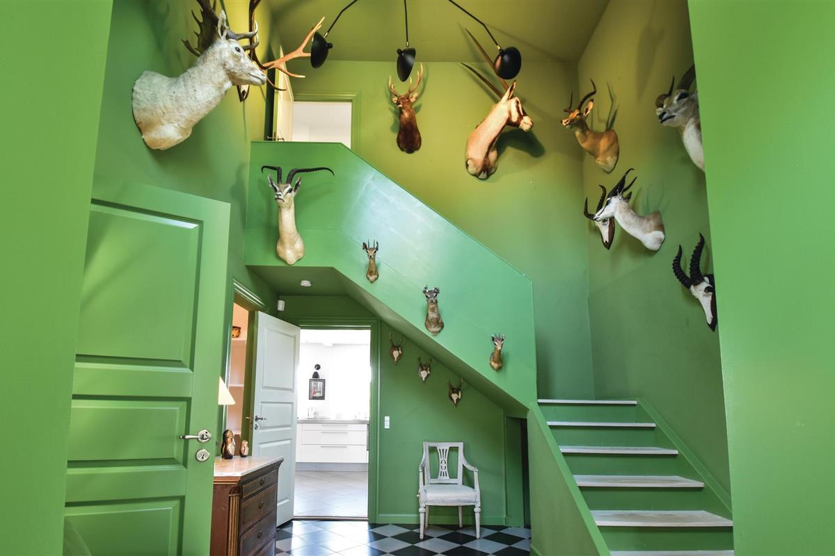 Bij aankomst kun je niet om de verbluffend mooie en unieke tuinkamer met open haard en bankgroep heen. Vervolgens kom je in de groene hal, versierd met jachttrofeeën, en ga je verder naar de grote keuken, die op natuurlijke wijze het middelpunt van het huis wordt. De ruime, lichte woonkamer bevat zowel de bank als de eettafel voor alle gasten.
