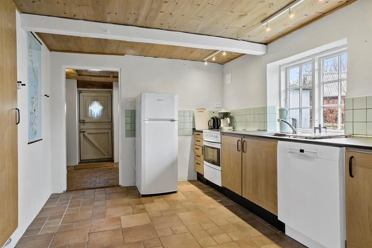Wenn Sie den Eingangsbereich betreten, finden Sie einen gefliesten Boden und viel Platz für Ihre Mäntel vor. Von hier aus gelangen Sie in eine geräumige Wohnküche mit offen liegenden Deckenbalken und einem zentral platzierten Kaminofen. Die offene Küche verfügt über eine große Arbeitsfläche, einen Geschirrspüler und einen großen Kühlschrank mit Gefrierfach. Das Wohnzimmer enthält einen Essbereich mit einer schönen alten Bank und Blick auf den Hinterhof. In direktem Anschluss befindet sich eine gemütliche Sofaecke mit wandmontiertem Fernseher mit Chromecast. Hier ist es möglich, eigene Inhalte über Handy oder Tablet und das WiFi des Hauses zu schauen. Dies ist der absolute Sammlungspunkt des Hauses, in dem man zusammen kommt, um gemeinsam zu kochen oder zu entspannen.