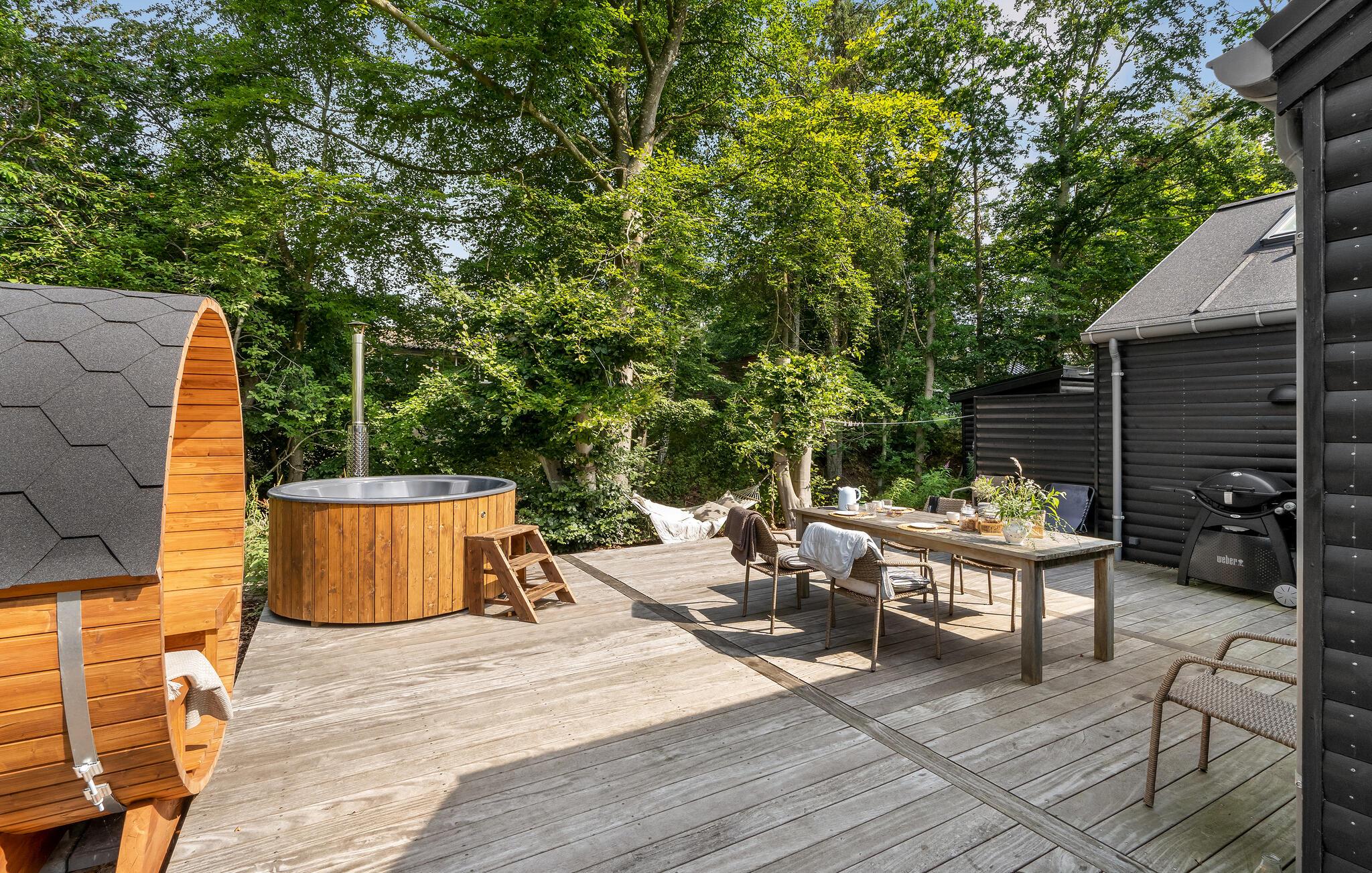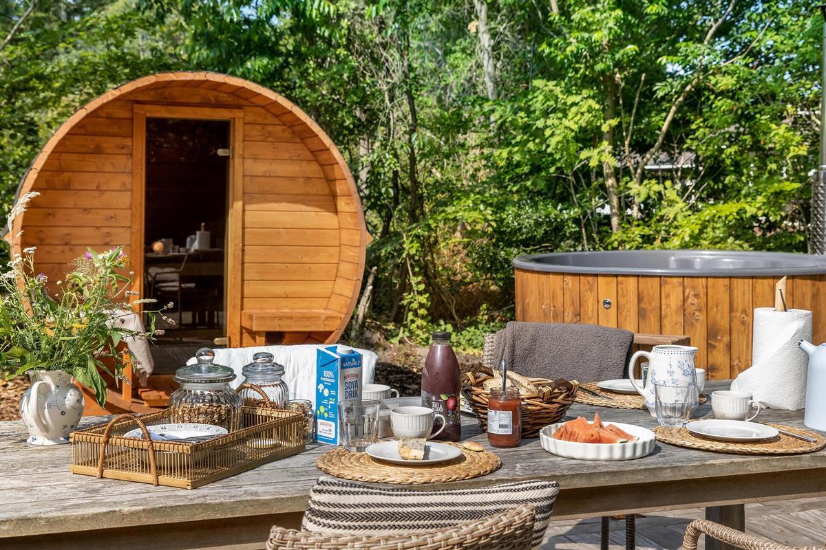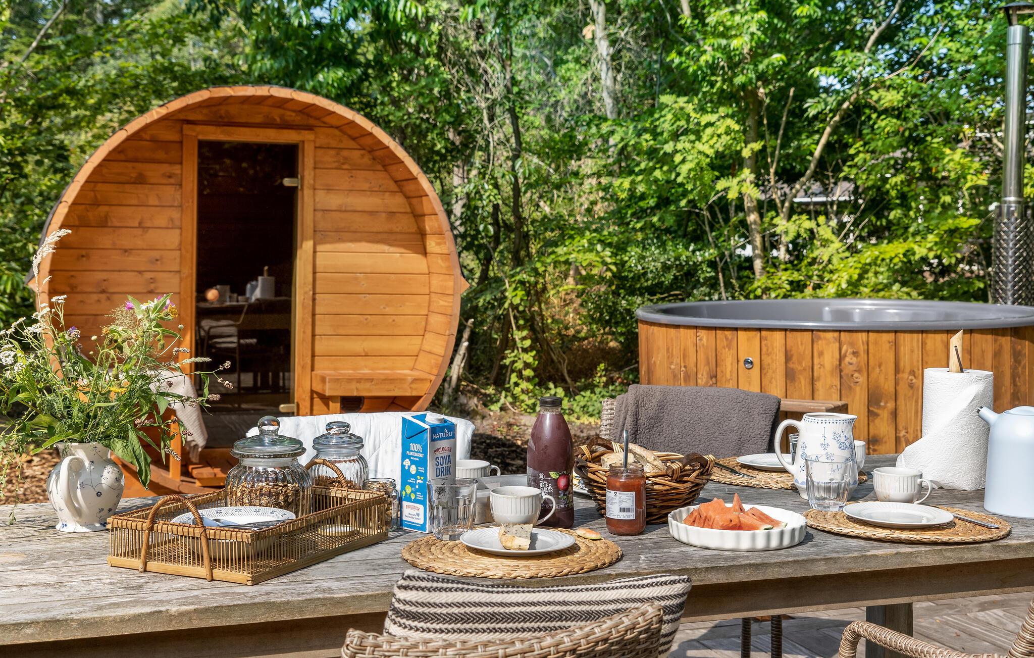 Het open terras met tuinmeubelen en barbecue is een geweldige plek om te genieten van een barbecue of een heerlijk ontbijt. Het Finse houten bad en de buitensauna nodigen u uit om te ontspannen.