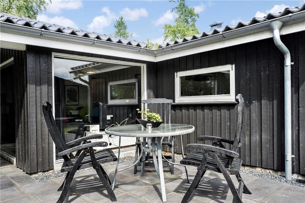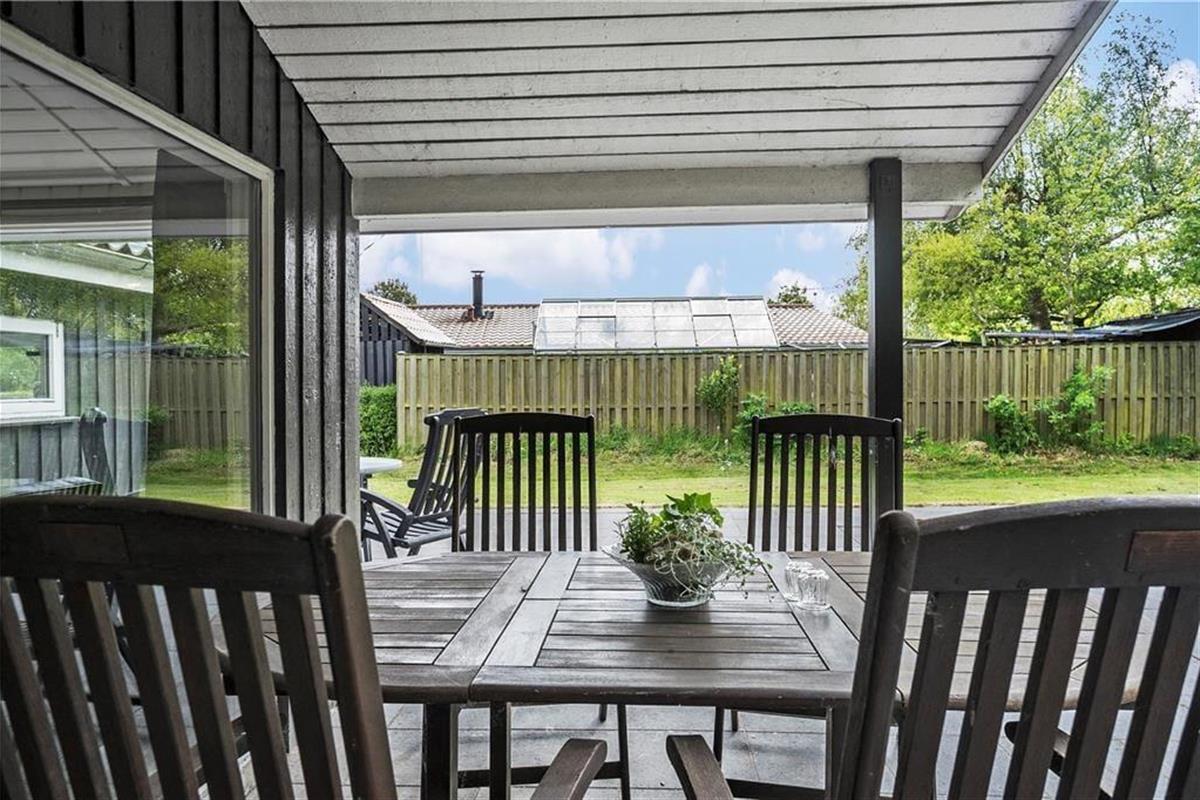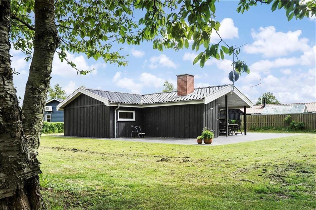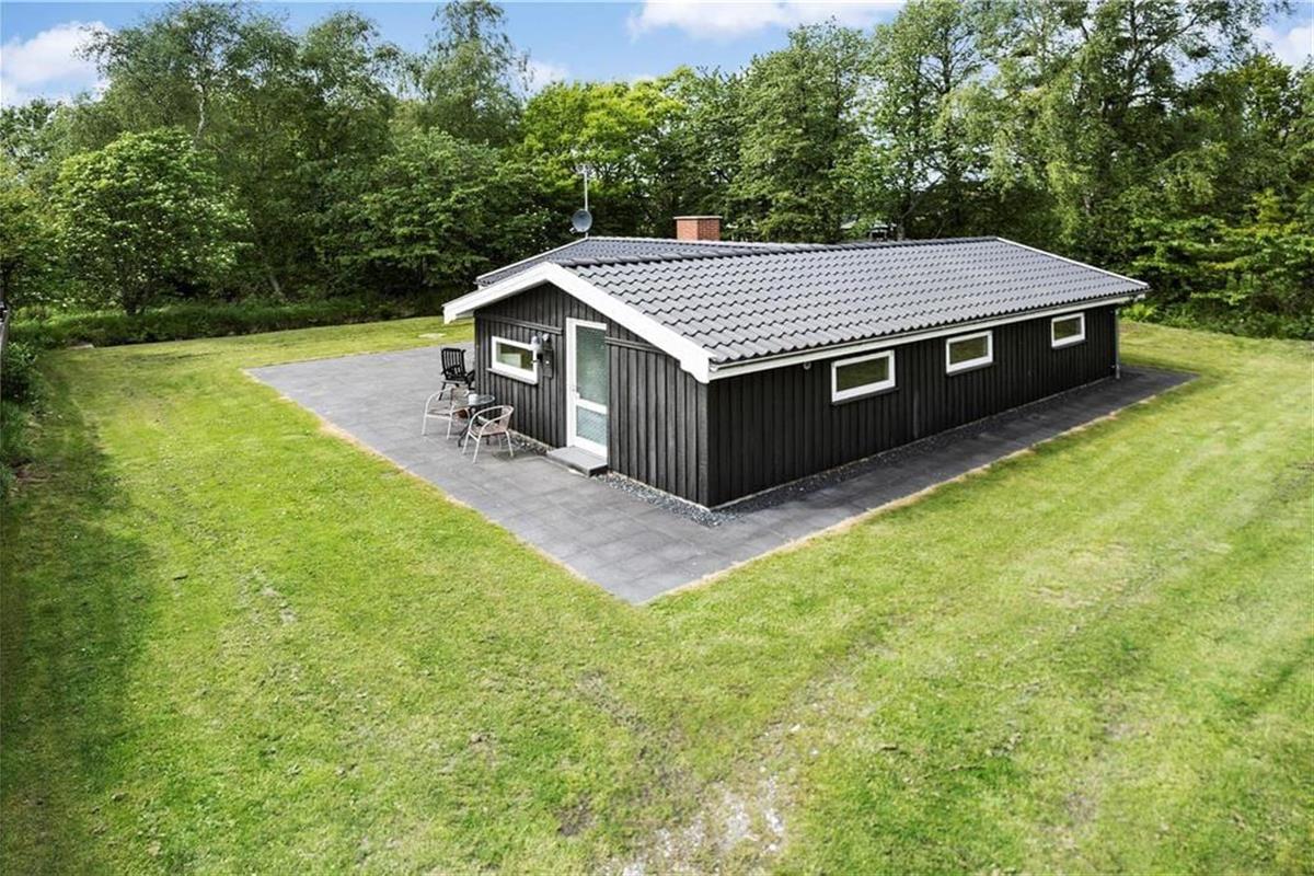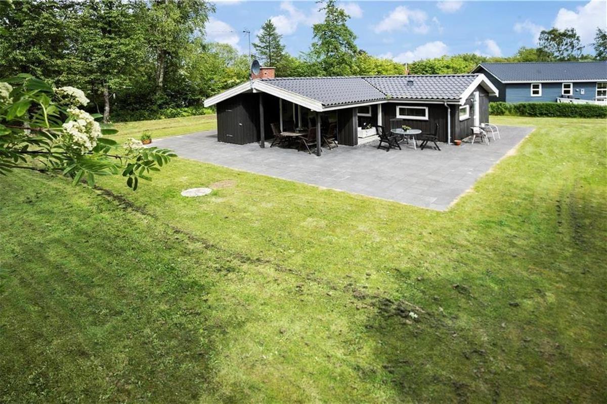 Das Ferienhaus liegt auf einem schönen Gartengrundstück, das von drei Seiten von hohen Bäumen umgeben ist. Es gibt genügend Platz zum Spielen mit oder ohne Ball auf der Wiese. Geflieste Terrassen verlaufen komplett rund um das Haus. Auf der Rückseite sitzen Sie in Ruhe und Frieden, genießen den Sommer und die Sonne, während sich der überdachte Bereich bestens für die Abendstunden eignet.
