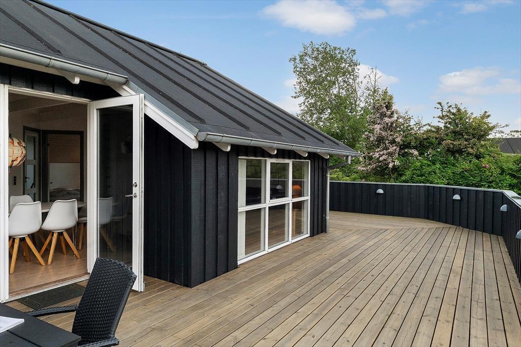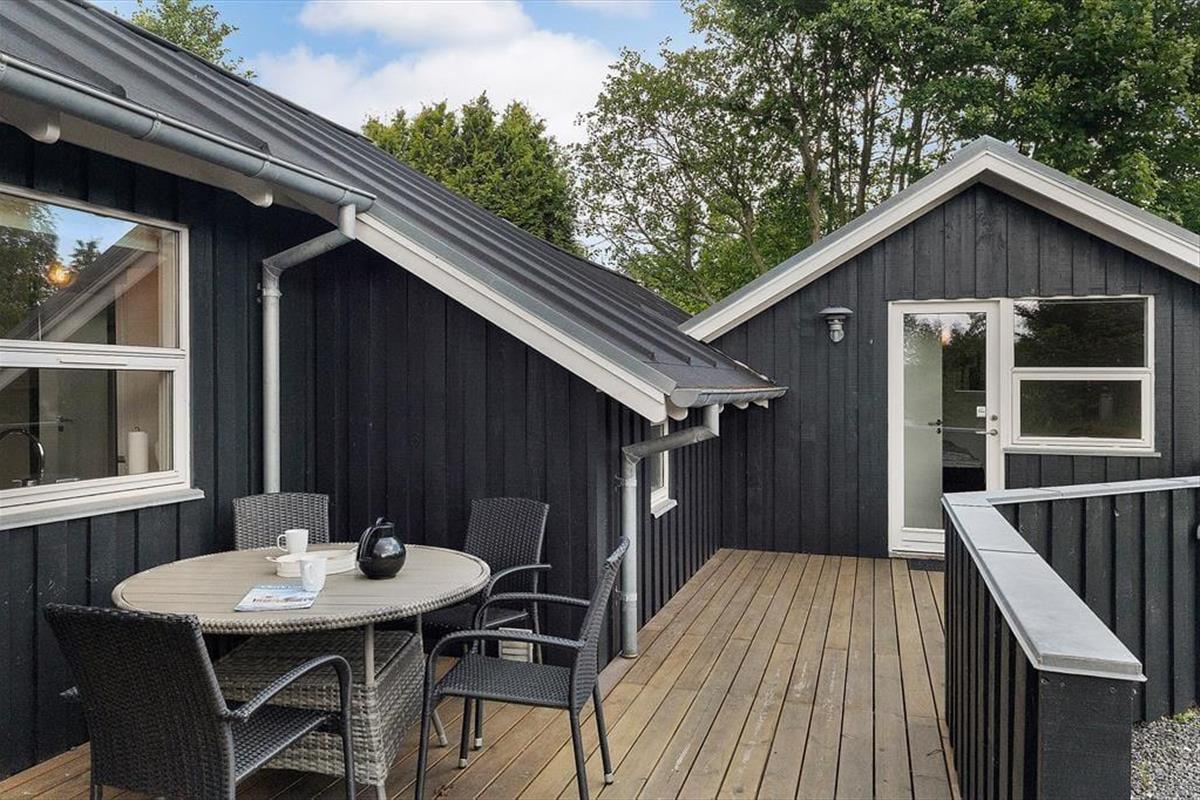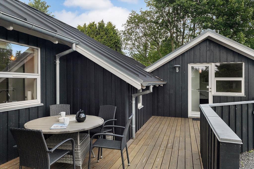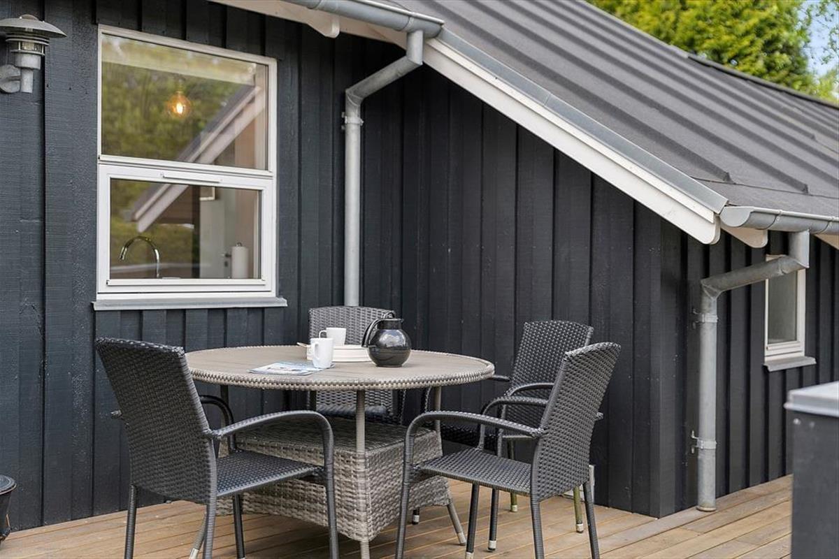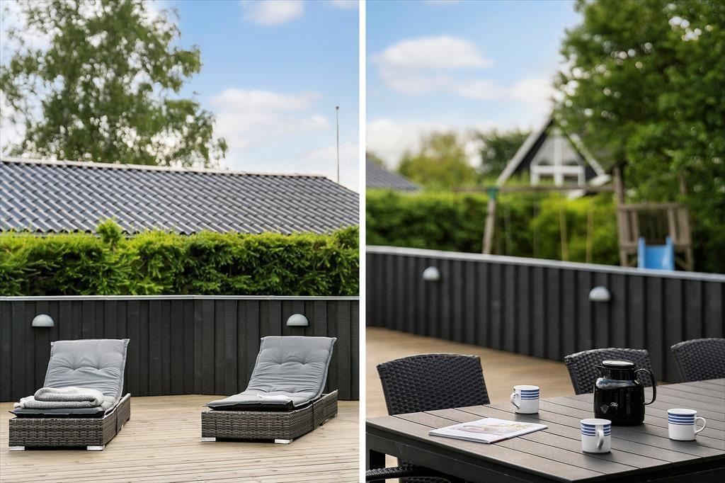 Das Ferienhaus liegt auf einem schönen Grundstück, jedoch ist es die Terrasse, die um das gesamte Haus verläuft, die besonders hervorzuheben ist. Hier finden Sie immer einen Platz in der Sonne oder, an den etwas windigeren Tagen, eine geschützte Ecke. Vom Essbereich aus gelangt man auf die Terrasse. Genießen Sie abends ein leckeres Essen, mit einer Flasche Wein oder Saft, im Freien.