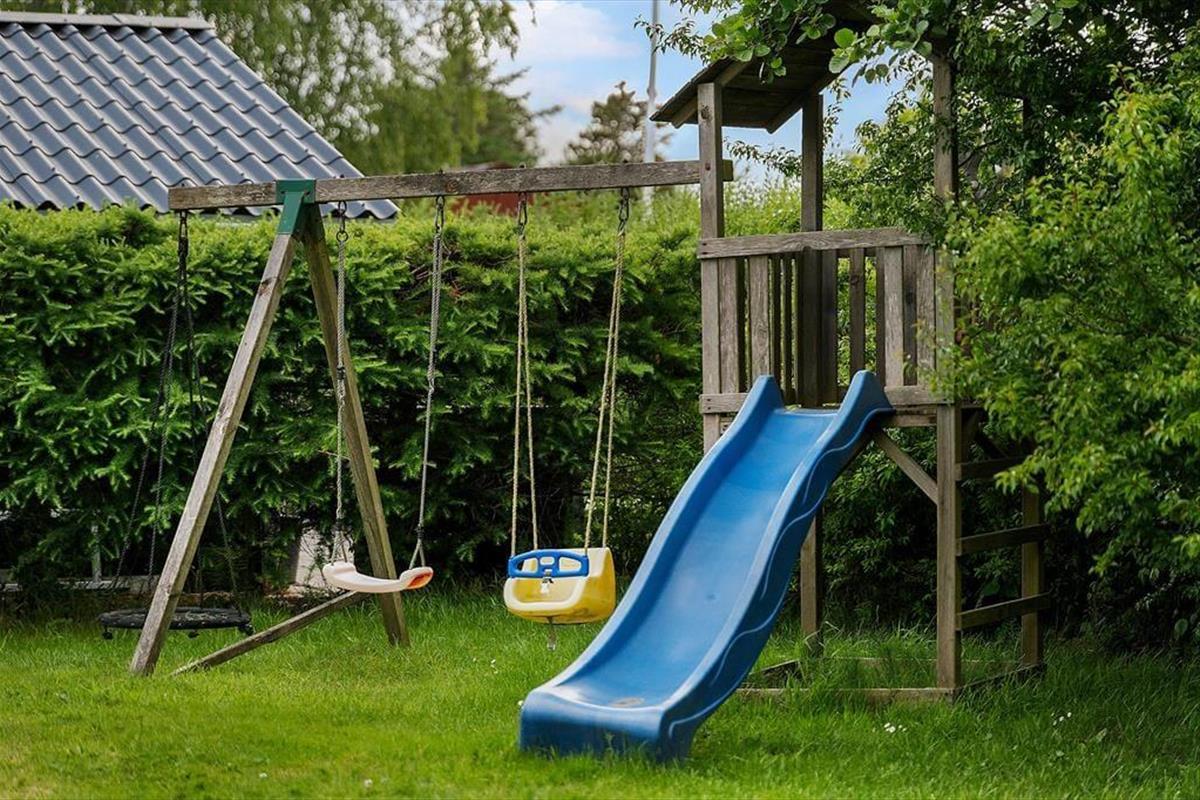 Für die kleinsten Familienmitglieder steht ein Kletterturm mit einer Sinnesschaukel, einer Babyschaukel, einer Rutschbahn und einem Aussichtsturm im Garten, so dass die Eltern entspannt vom Liegestuhl aus alles im Blick behalten können.