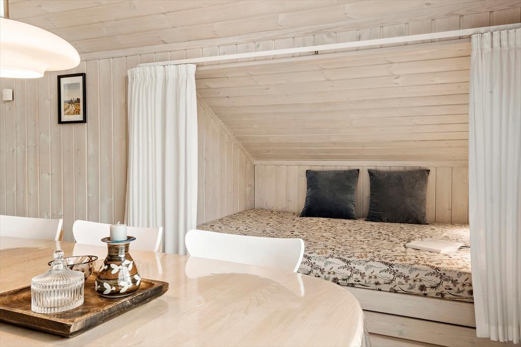 Im Inneren des Ferienhauses empfängt Sie ein heller und offener Raum, in dem das warme Holzdekor und die hellen Farben eine einladende Atmosphäre schaffen. Die Gemütlichkeit steht im Vordergrund, und die charmante Alkove lädt zum Entspannen mit einem guten Buch oder einem ruhigen Moment ein. Das Wohnzimmer und die Küche sind offen miteinander verbunden und bieten viel Platz für gemeinsame Mahlzeiten und geselliges Beisammensein. Die großen Fenster lassen viel Licht herein und bieten einen schönen Blick auf den grünen Garten, so dass Sie sich der Natur nahe fühlen. Wenn es Abend wird, können Sie den Holzofen anfeuern und die gemütliche Atmosphäre genießen, während Sie einen Film ansehen oder sich nach einem Tag voller Urlaubsaktivitäten entspannen.