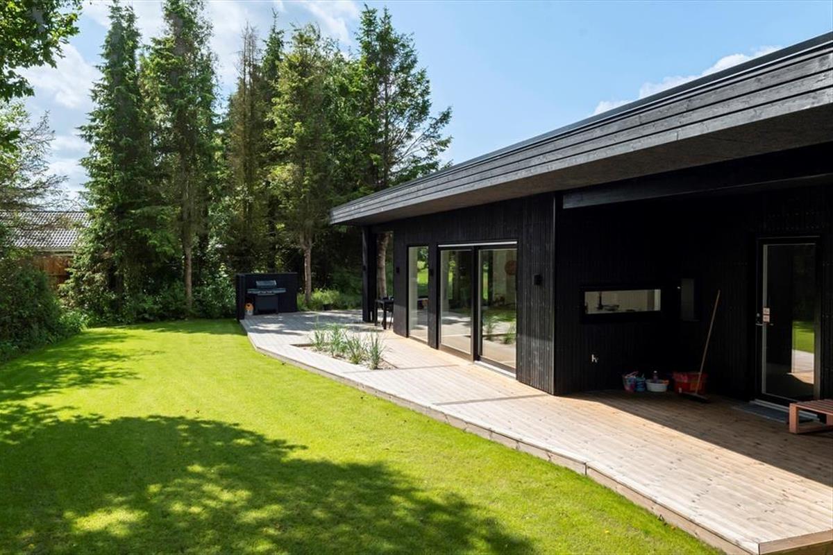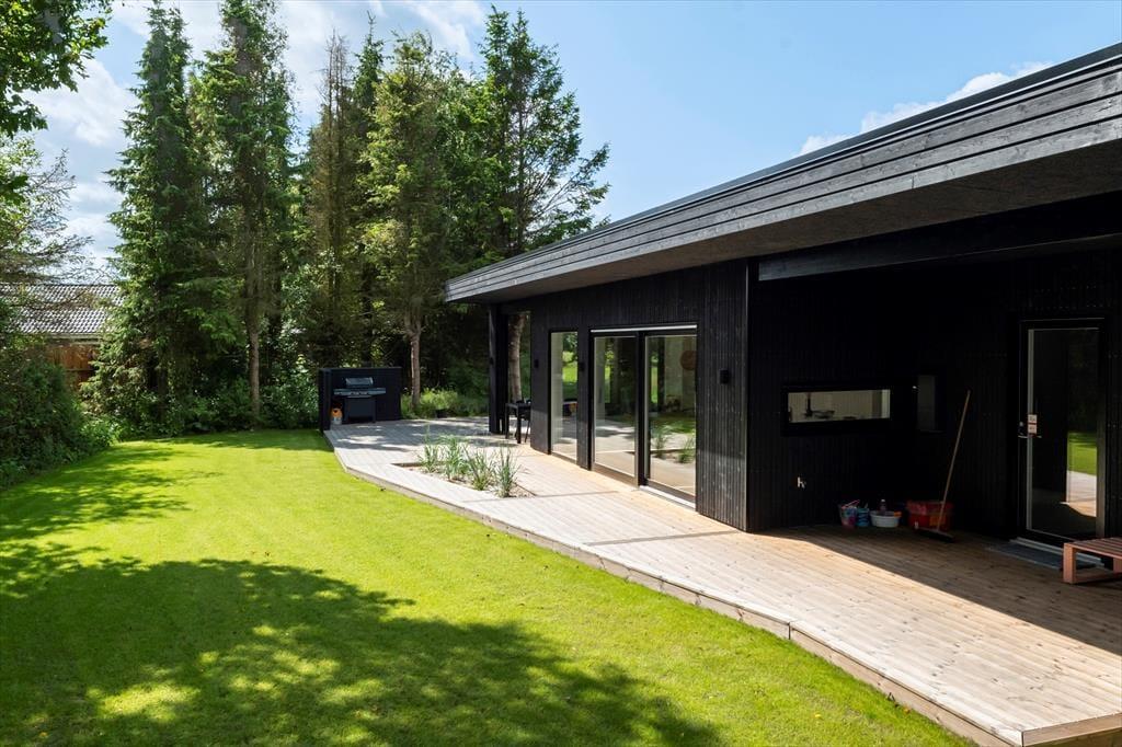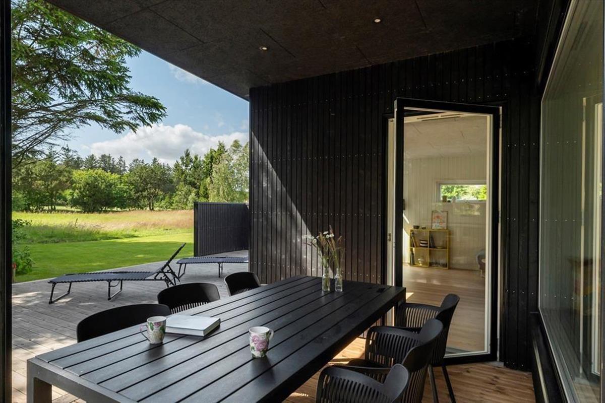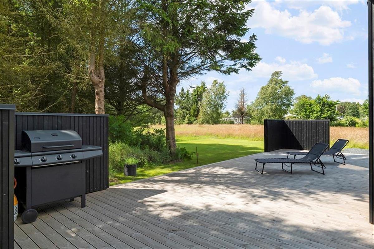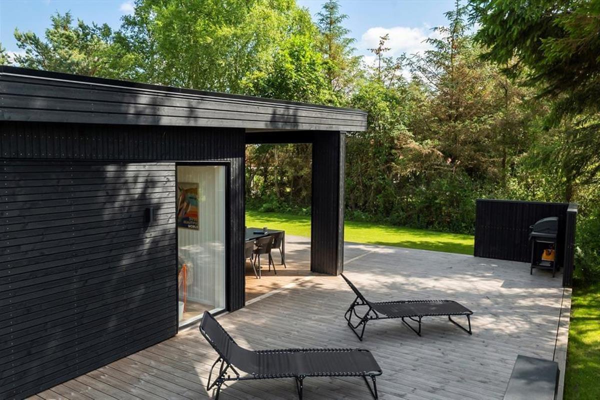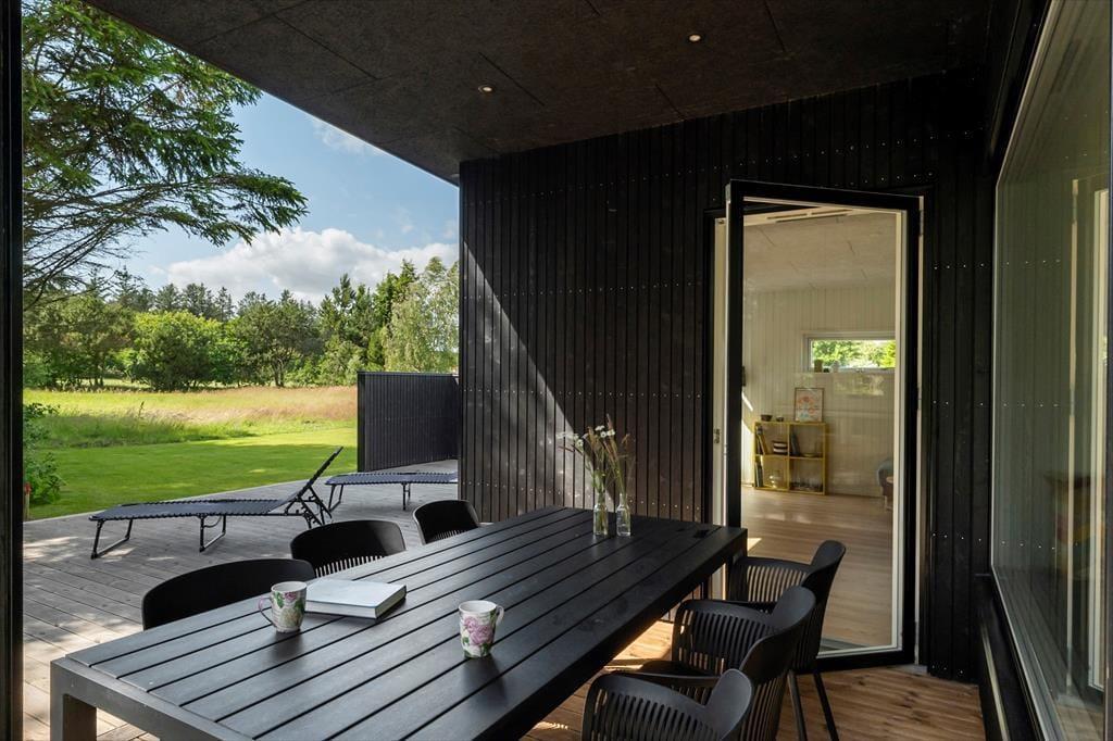 Wenn die Sonne scheint und die Urlaubstage nach Entspannung im Freien verlangen, kommt die Terrasse des Ferienhauses voll zur Geltung. Die große Holzterrasse umgibt das Haus wie eine ruhige Oase - und ein Teil davon ist überdacht, so dass Sie auch bei einem Sommerregen draußen sitzen können. Die Terrasse ist ideal für den Morgenkaffee in der Morgensonne, ruhige Momente mit einem guten Buch oder köstliche Grillabende in der Abenddämmerung. Machen Sie es sich auf den Gartenmöbeln bequem, genießen Sie die Wärme der Sonne und lauschen Sie dem Zwitschern der Vögel, während die Kinder im Garten spielen. Die gemütliche und ruhige Lage macht es Ihnen leicht, sich zu entspannen und den Alltag zu Hause zu lassen. Und wenn es dunkel wird, können Sie Laternen anzünden und die warme Abendstimmung unter dem überdachten Bereich genießen - vielleicht mit einem Glas Wein und dem Rauschen der Wellen in der Ferne.
