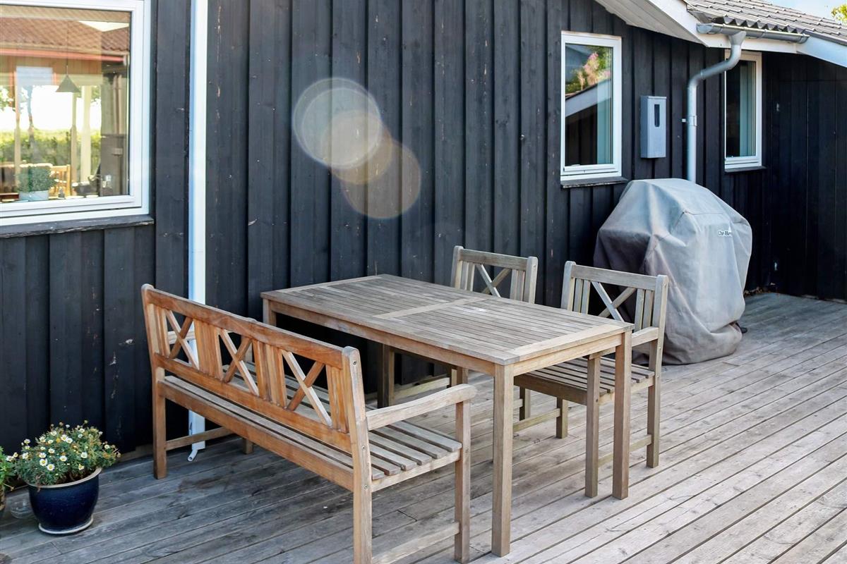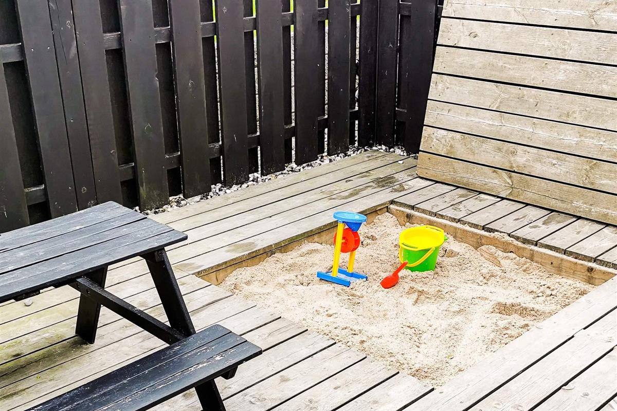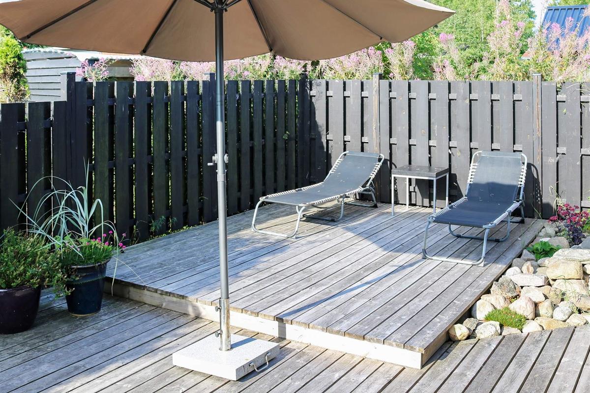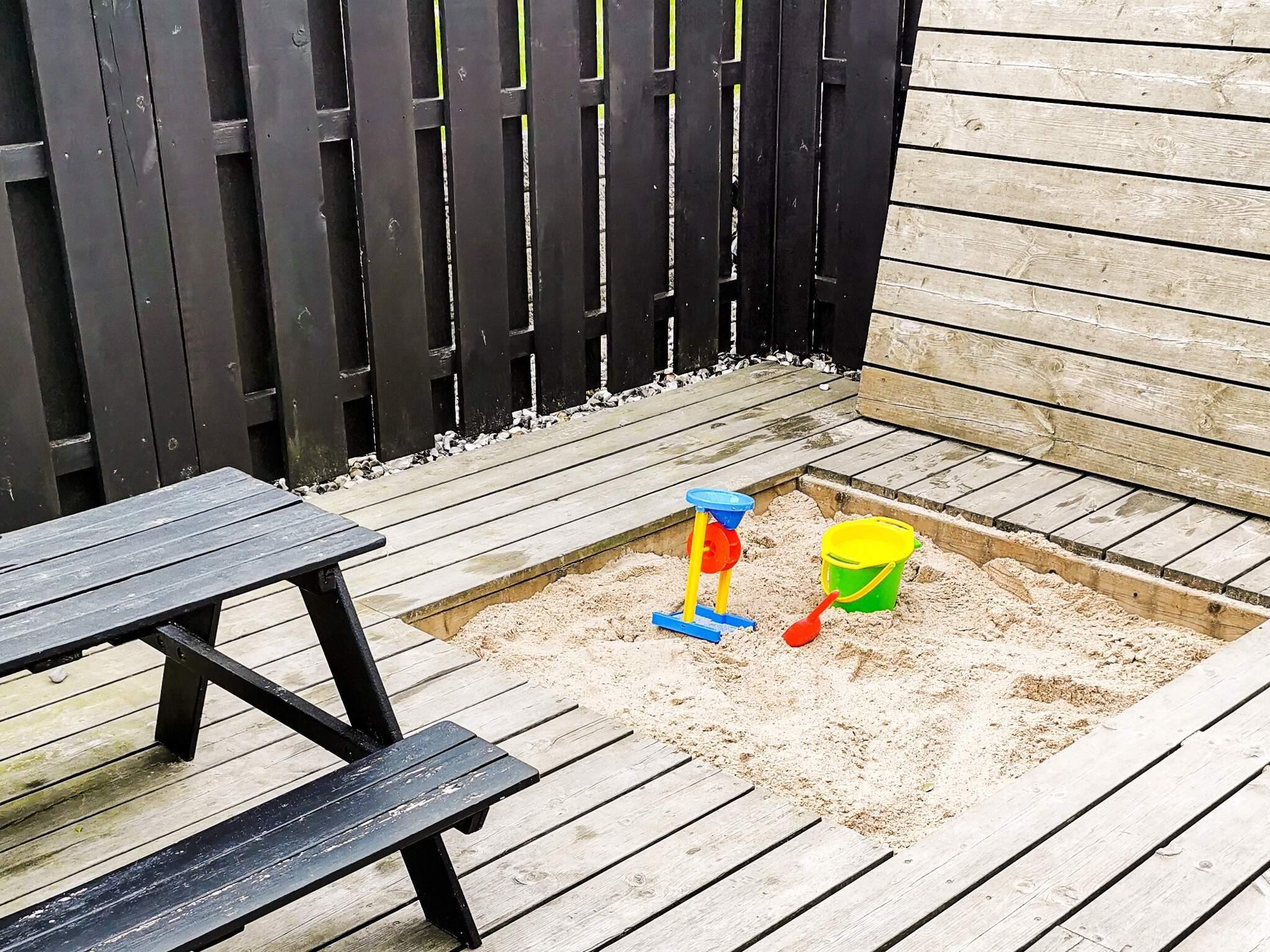 Mehrere Terrassenflächen umgeben das Haus, von denen die eine überdacht und zum Wasser und Innenhof ausgerichtet ist. Das Haus liegt am Ende eines kleinen Weges in einem ruhigen Ferienhausgebiet. Auf dem Grundstück gibt es Schaukeln, einen Sandkasten, eine Feuerstelle sowie viele gemütliche Sitzplätze.
