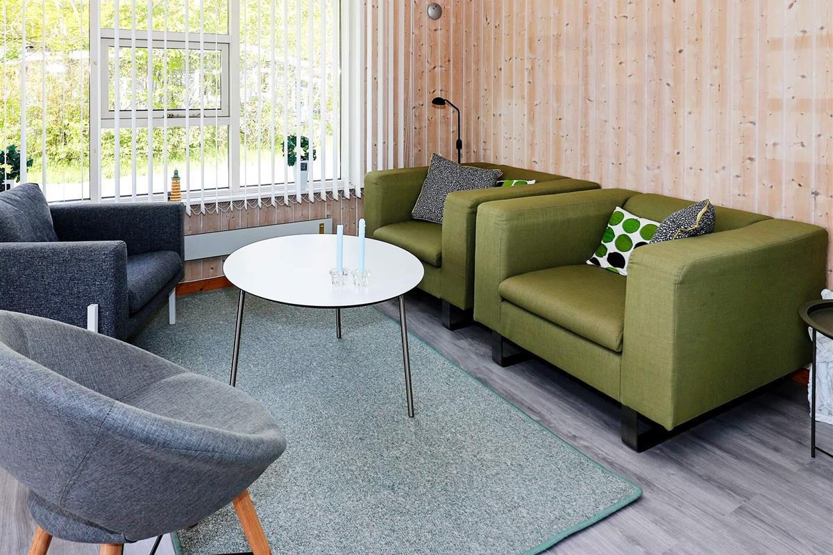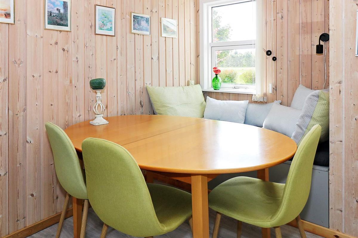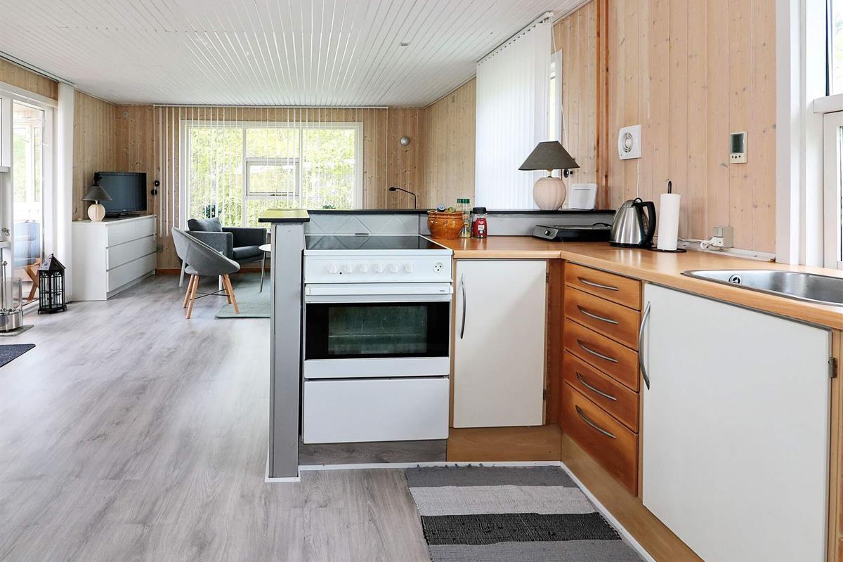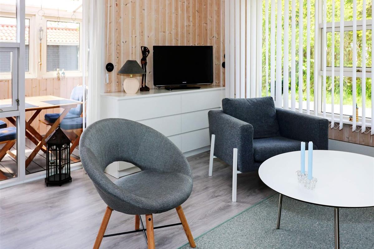 Innen helles Wohnzimmer mit gutem Essbereich, der zur Küche hin offen ist. Von diesem Raum aus hat man Zugang zur Terrassenfläche des Hauses. Zudem ein Schlafzimmer mit Doppelbett und zweites Schlafzimmer mit 2 Einzelbetten sowie Badezimmer mit Dusche und WC im Haus. Neben dänischen und deutschen TV-Sendern stehen auch Eurosport und Disney Channel zur Auswahl.