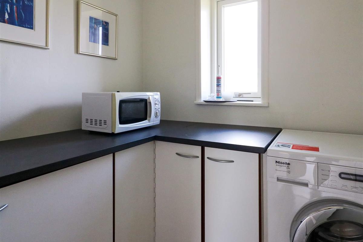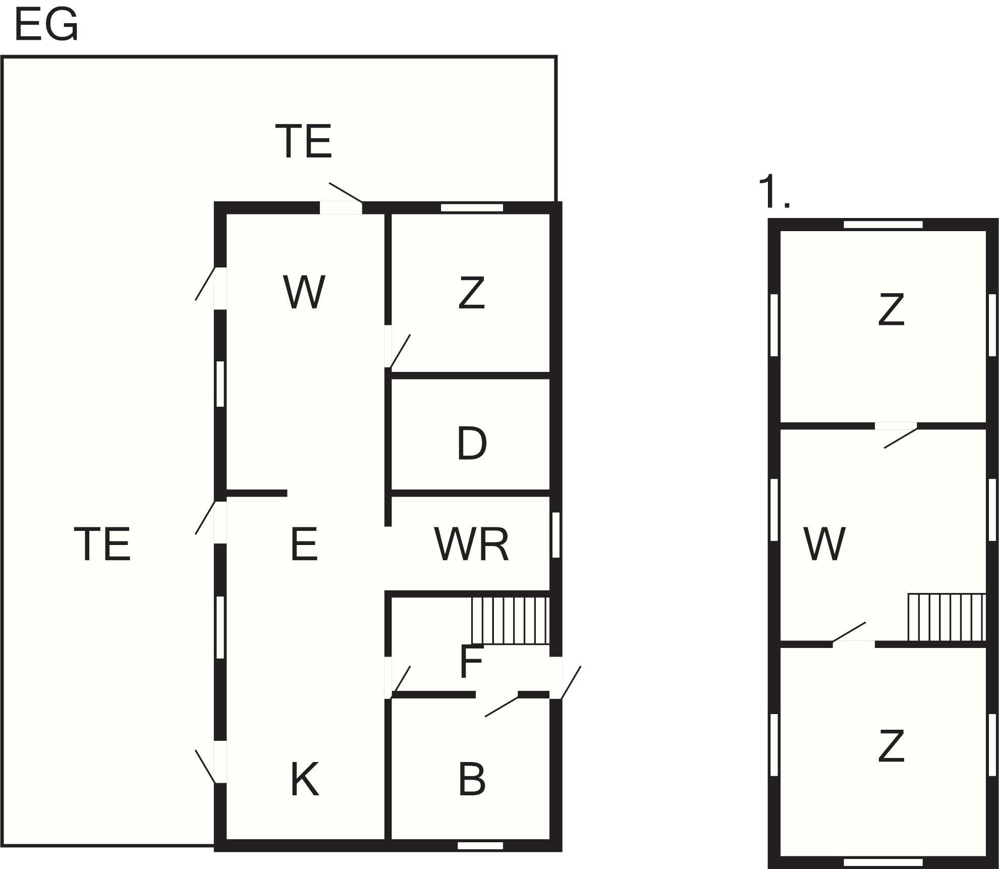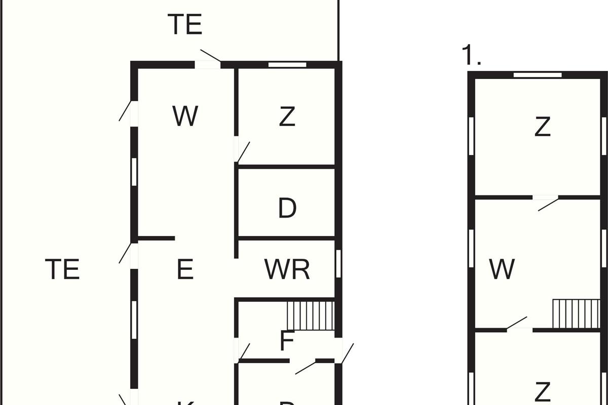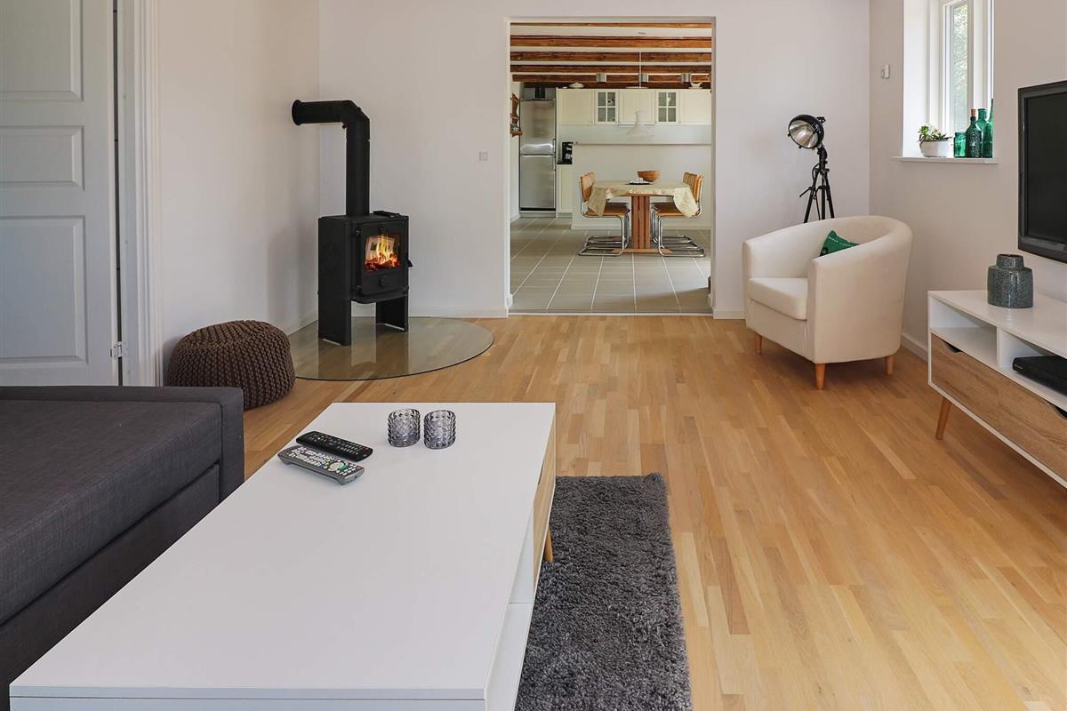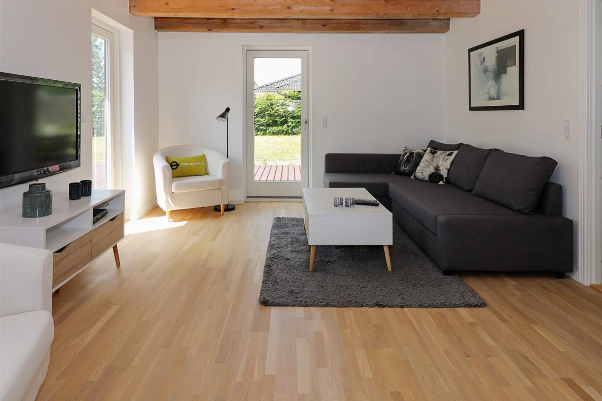 Das hell und wohnlich eingerichtete Ferienhaus hat einen offenen Küchen-/Wohnbereich für das Familienleben, inklusive Ess- und Sitzecke sowie Holzofen für kühlere Abende und Zugang zur großen Holzterrasse davor. Außerdem im Parterre praktischer Hauswirtschaftsraum mit Waschmaschine sowie Badezimmer mit Dusche/WC und ein Schlafzimmer mit Doppelbett.