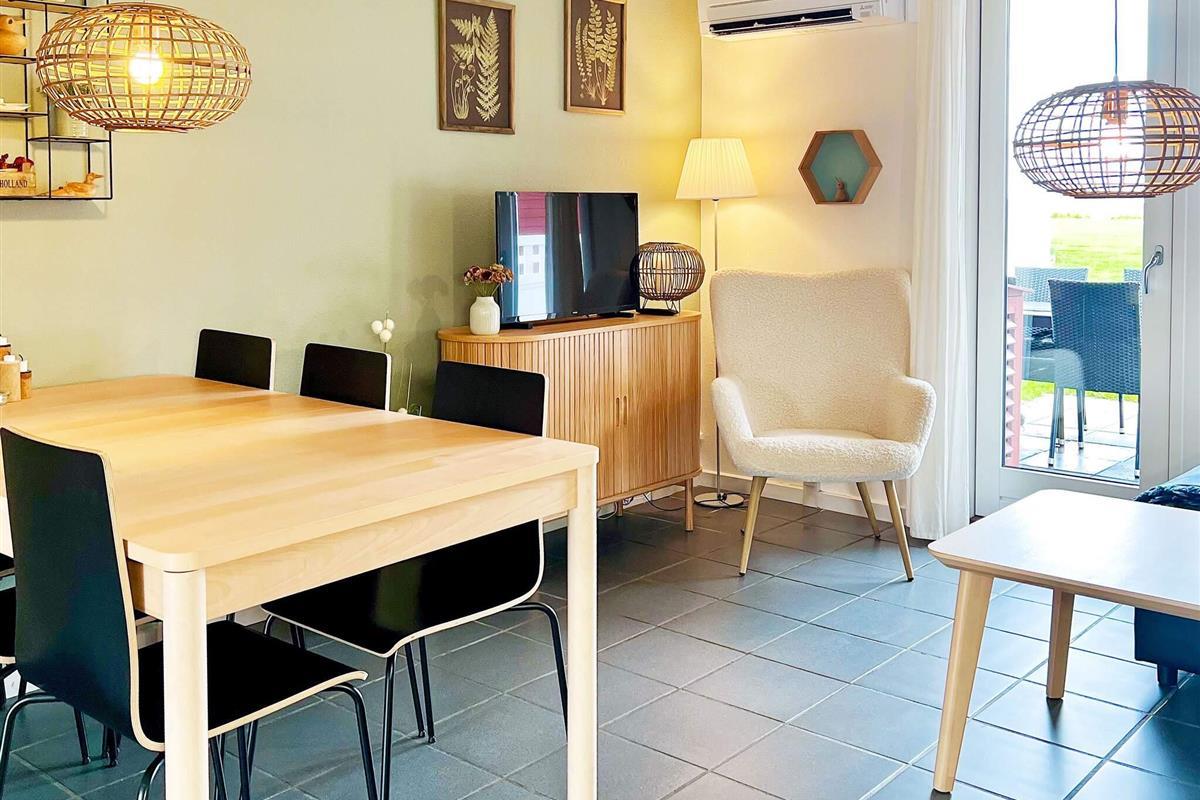 Die Wohnung ist im Erdgeschoss mit Bad, Küche, Ess- und Wohnzimmer mit Zugang zu einer Terrasse eingerichtet. Oben im 1. Stock gibt es einen schönen Balkon mit Meerblick, ein Schlafzimmer mit Doppelbett und ein zweites Zimmer mit 2 Etagenbetten und vier Schlafplätzen. Für den Freizeitspaß steht ein Tischkicker bereit. In der Wohnung wurden eine klimafreundliche Wärmepumpe sowie eine Waschmaschine installiert.
