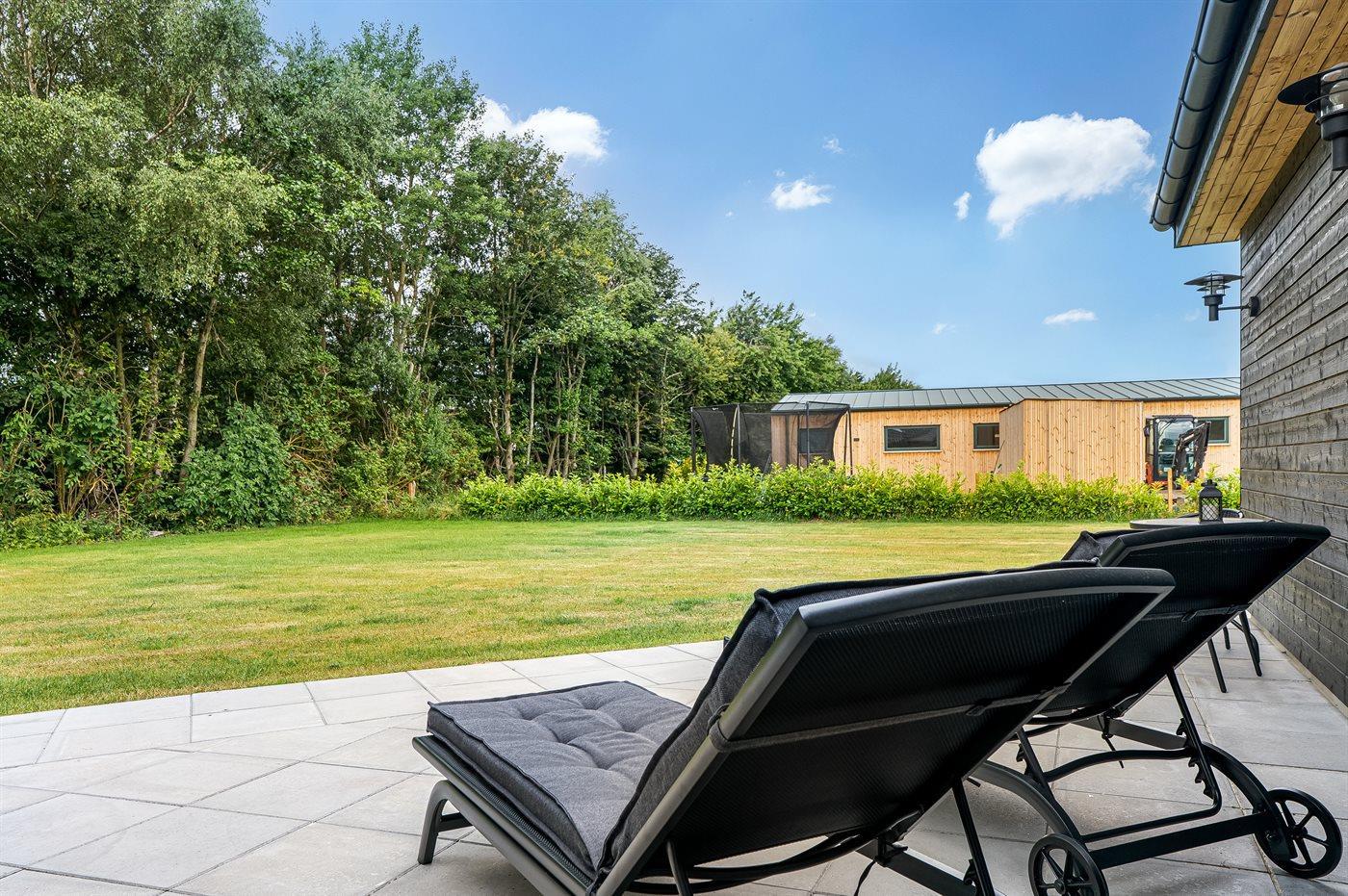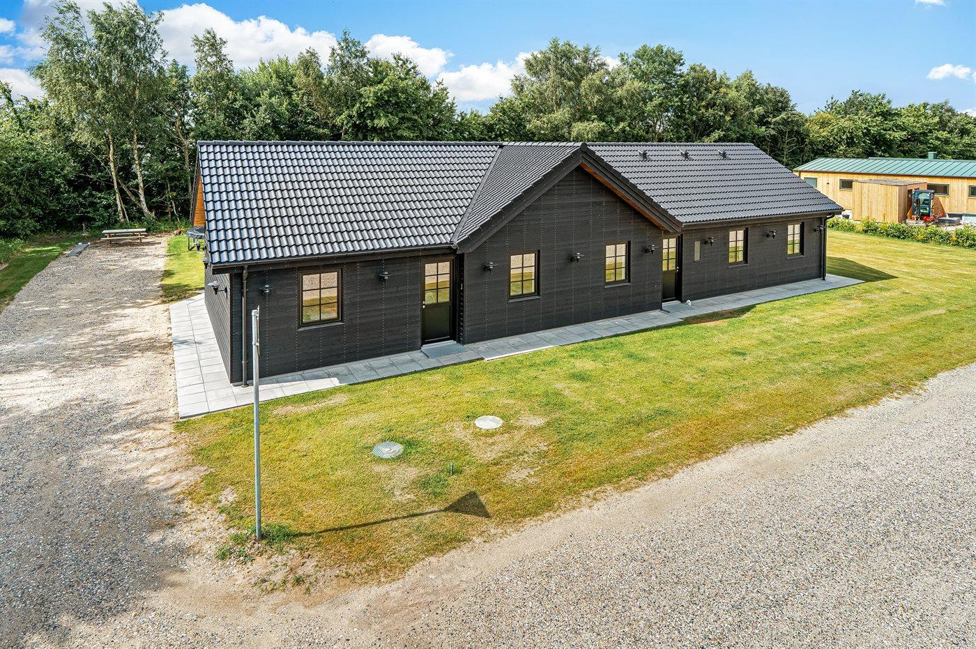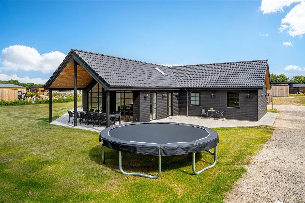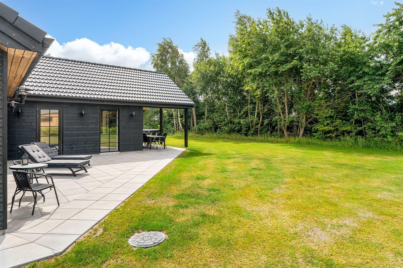 De vakantiewoning is gelegen op een 1200 m² groot aangelegde tuin. Afstand tot de zee 1000 m. Afstand tot de fjord 10100 m. Dichtstbijzijnde winkel 1000 m. Er is een golfbaan op een afstand van 17400 m. Bij de vakantiewoning hoort terras. Daarnaast is er een overdekt terras. Trampoline met veiligheidsnet. Barbecue. Parkeerplaats bij het huis.
