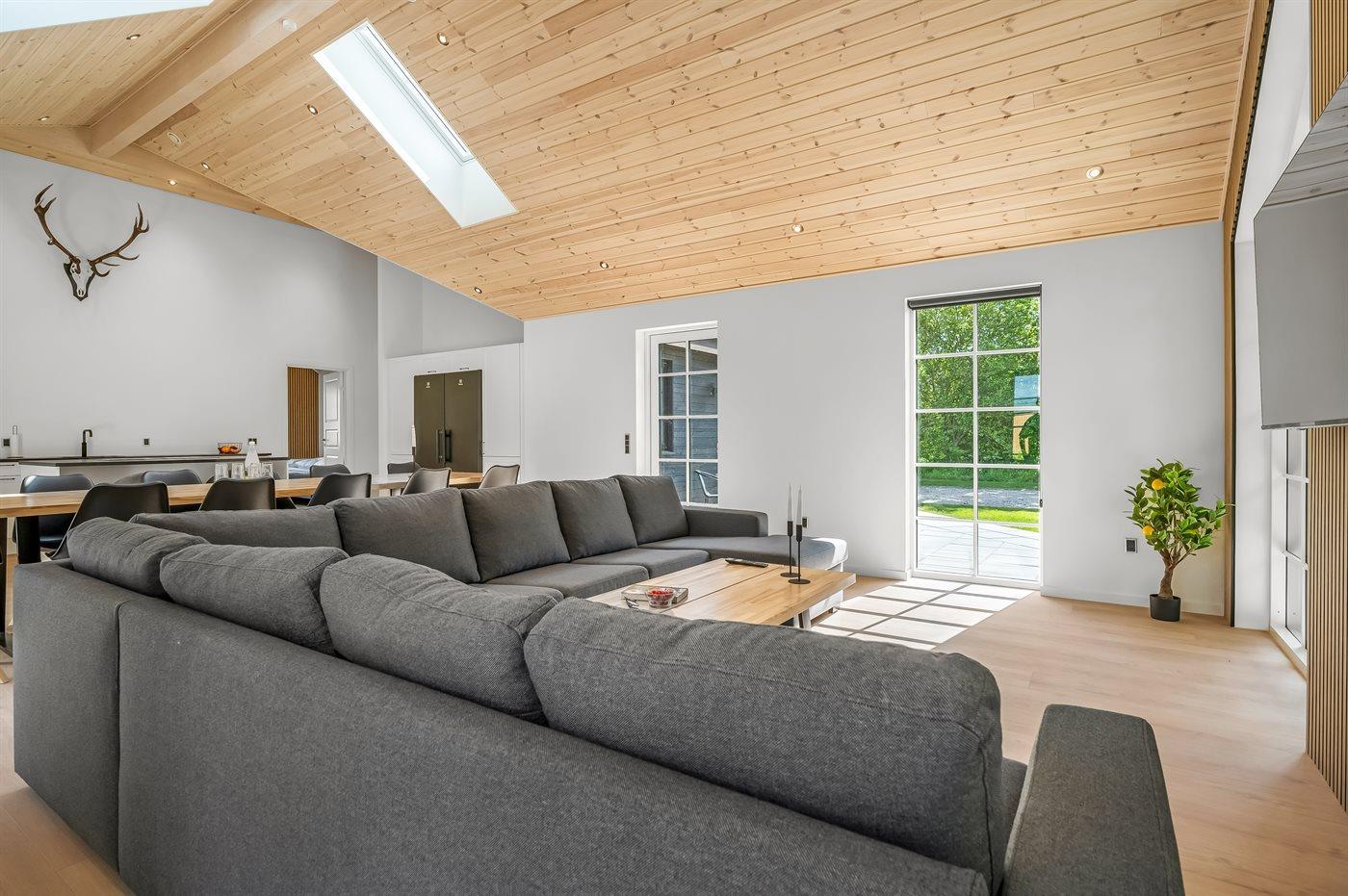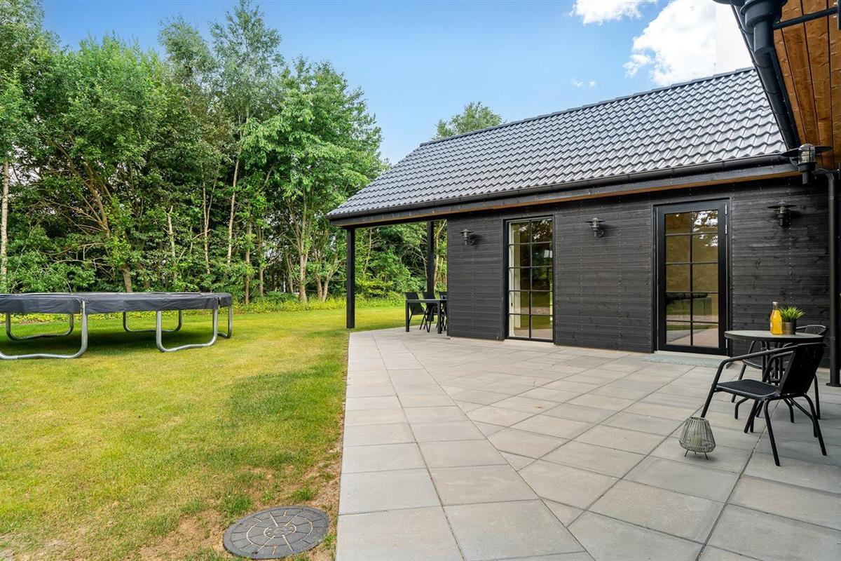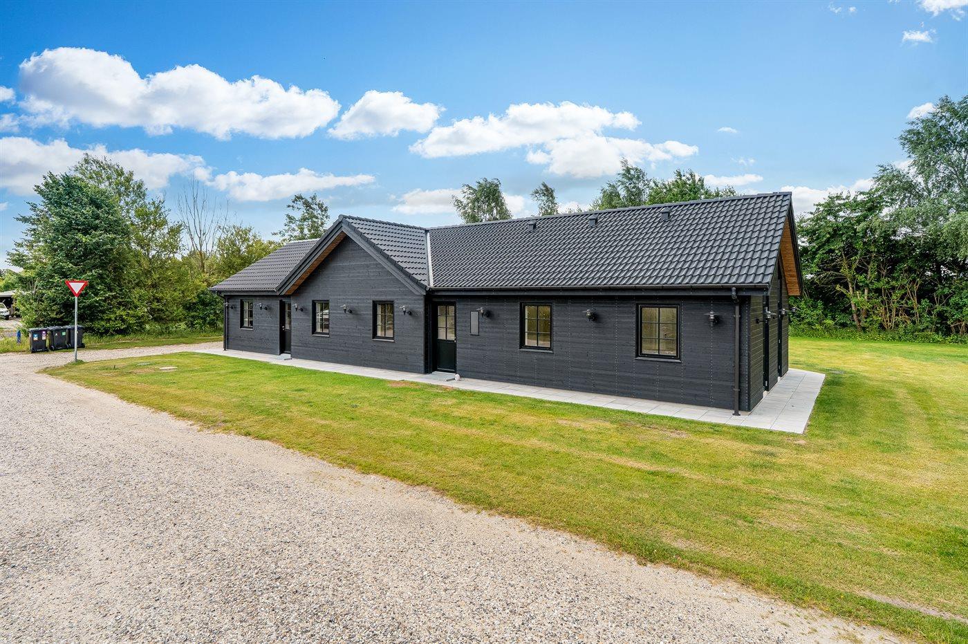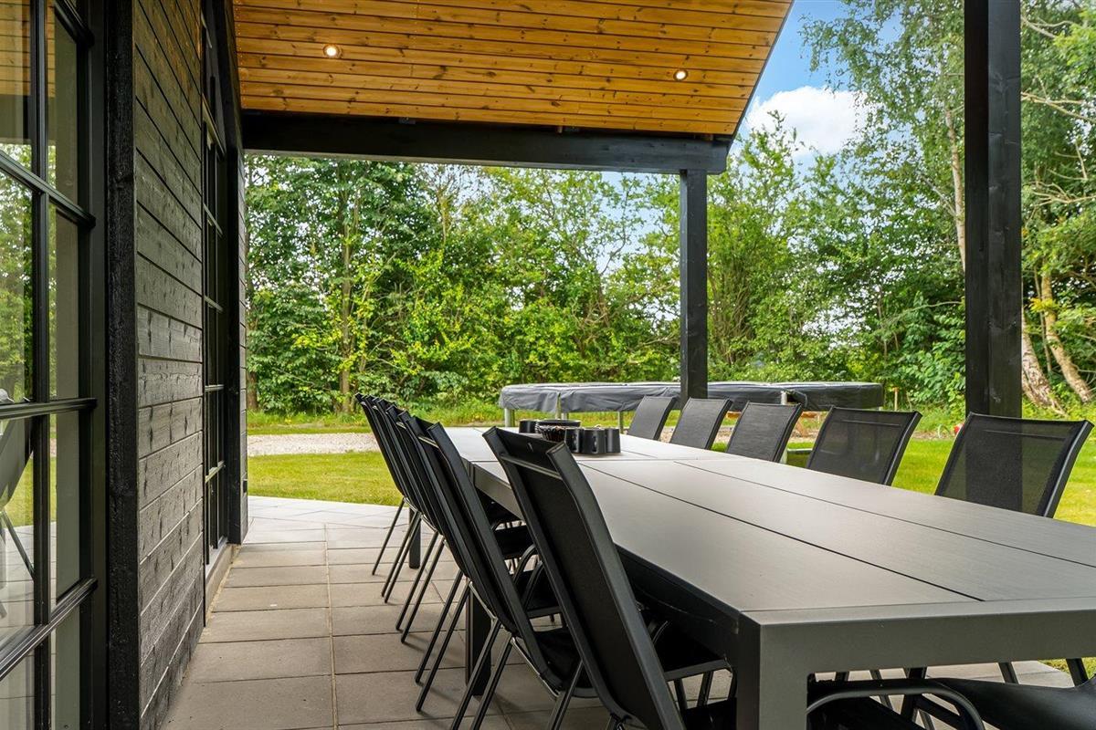De vakantiewoning is gelegen op een 1200 m² groot aangelegde tuin. Afstand tot de zee 1000 m. Afstand tot de fjord 10100 m. Dichtstbijzijnde winkel 1000 m. Er is een golfbaan op een afstand van 17400 m. Bij de vakantiewoning hoort terras. Daarnaast is er een overdekt terras. Trampoline met veiligheidsnet. Barbecue. Parkeerplaats bij het huis.