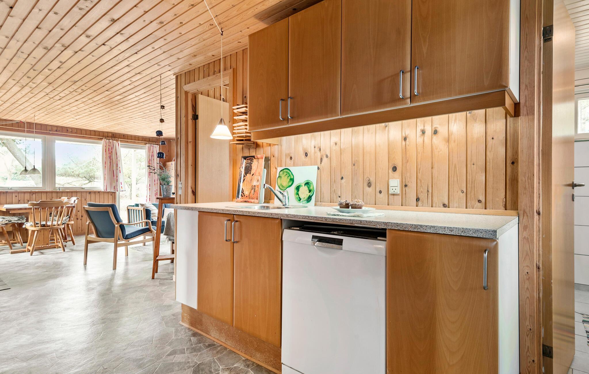 Aan de oostkant van het eiland Rømø heet dit klassieke vakantiehuis je welkom voor een vakantie met veel ontspanning en frisse lucht. Het hele huis straalt met zijn houten sfeer een warme en uitnodigende sfeer uit. Zet 's ochtends een kopje koffie in de open keuken en geniet ervan buiten op het terras in de frisse lucht, terwijl je de aangename geur van de naaldbomen inademt. In het woongedeelte kun je met het gezin dineren aan de eettafel of bordspelletjes spelen en tekeningen maken op de banken.