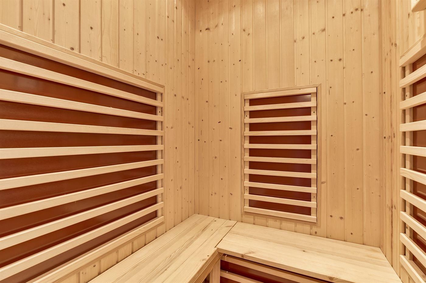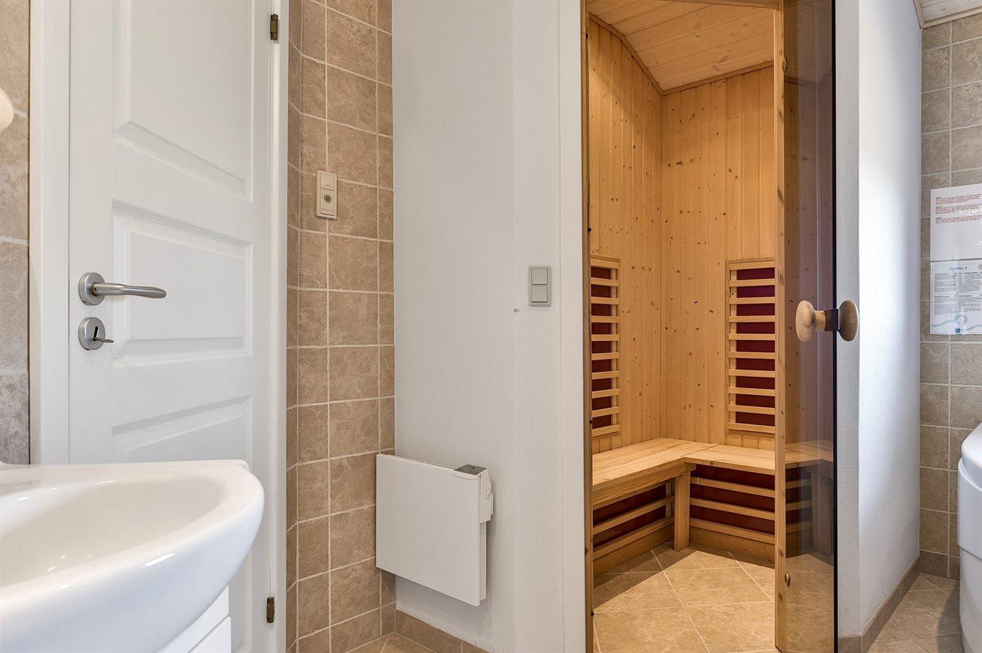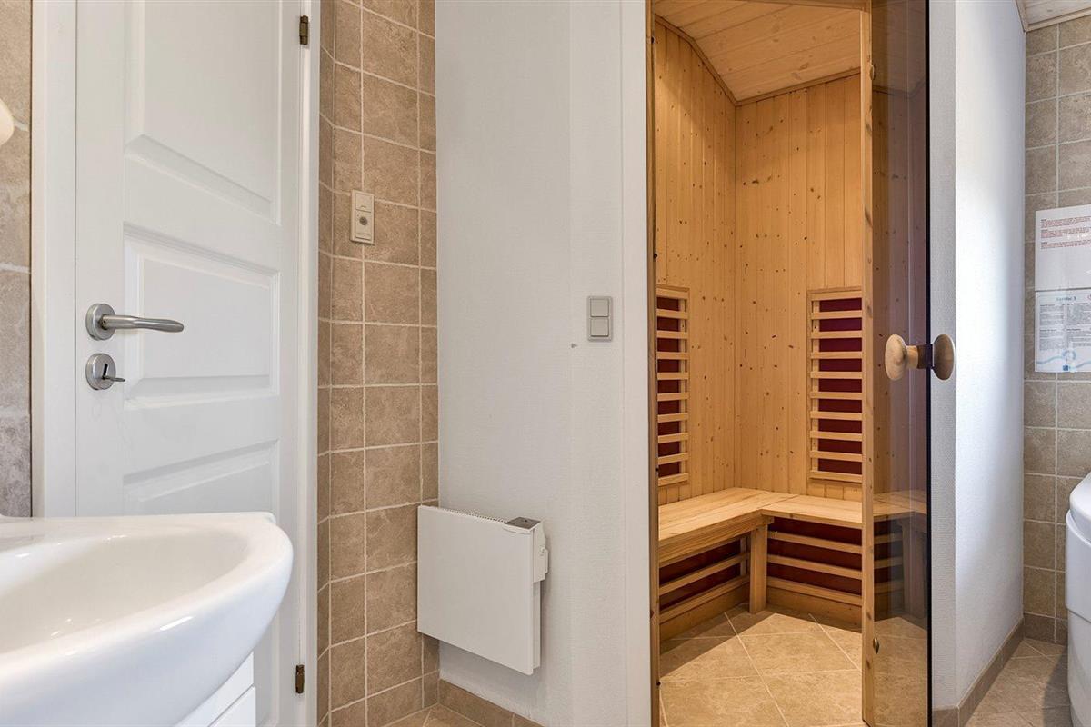 Er is 2 badkamers met vloerverwarming; 1 met douchehok en 1 met badkuip. Gezondheidscabine met infrarood.