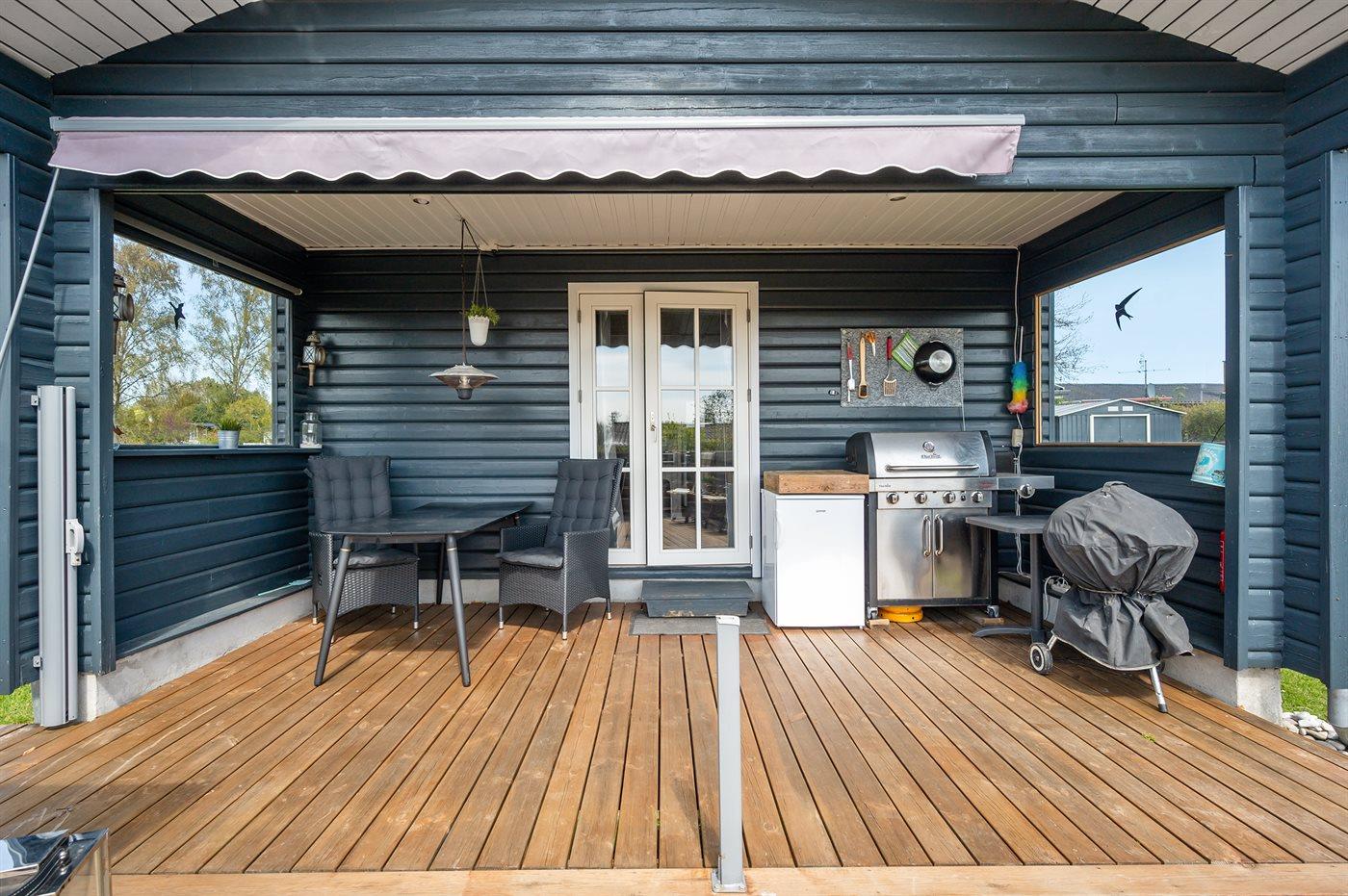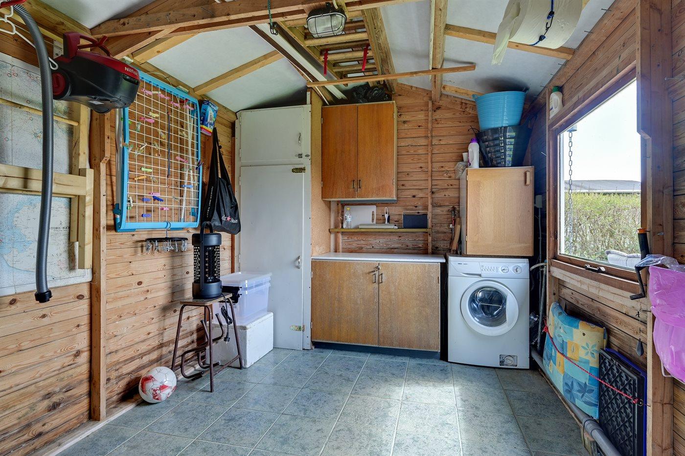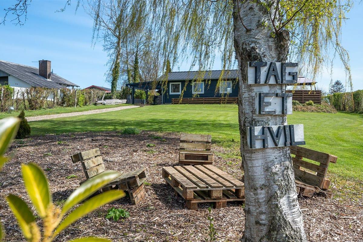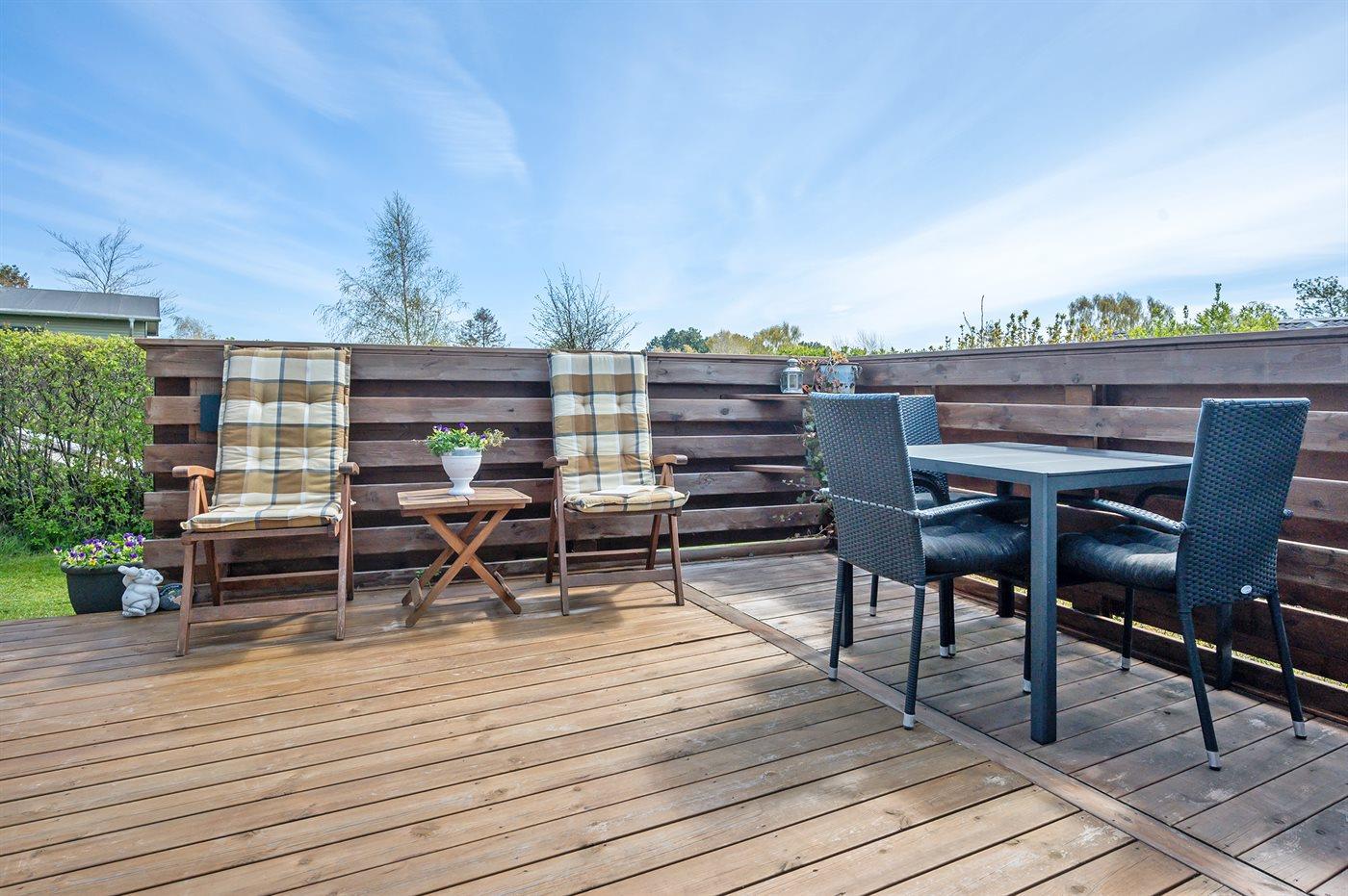 De vakantiewoning is gelegen op een 1236 m² groot aangelegde tuin. Afstand tot de zee 325 m. Dichtstbijzijnde winkel 5000 m. Bij de vakantiewoning hoort 50 m² terras. Daarnaast is er een 15 m² groot overdekt terras. Gereedschapsruimte. Barbecue. Carport ter beschikking. Parkeerplaats bij het huis.