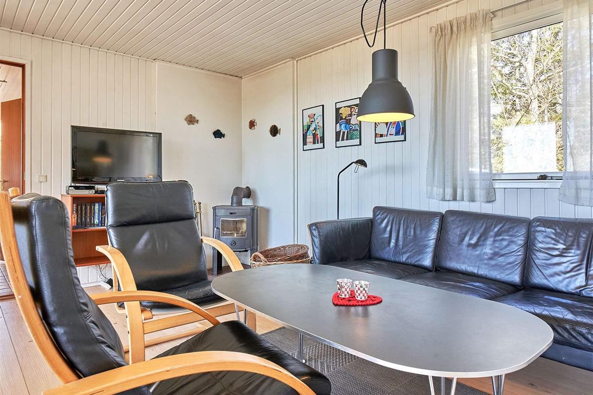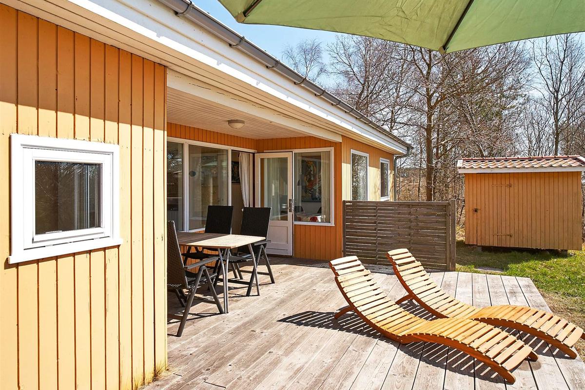 Das Ferienhaus ist gut eingerichtet, hat drei Schlafzimmern und vom Wohnzimmer aus gelangt man direkt auf die Holzterrasse mit Meerblick.