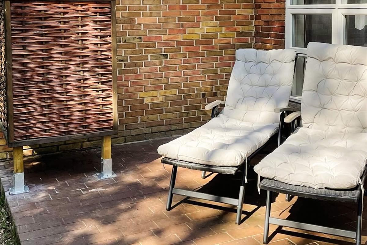 1 Außenbereich: Gartenmöbel, Liegestühle, Gasgrill, Redskabsskur, Terrasse, Außendusche