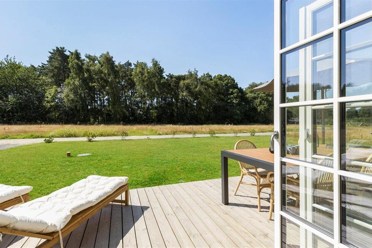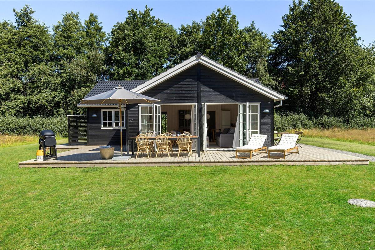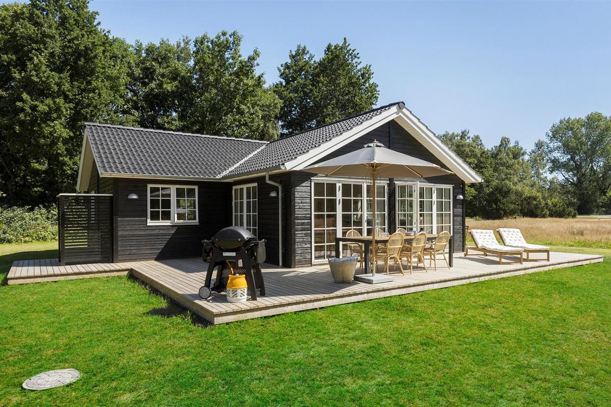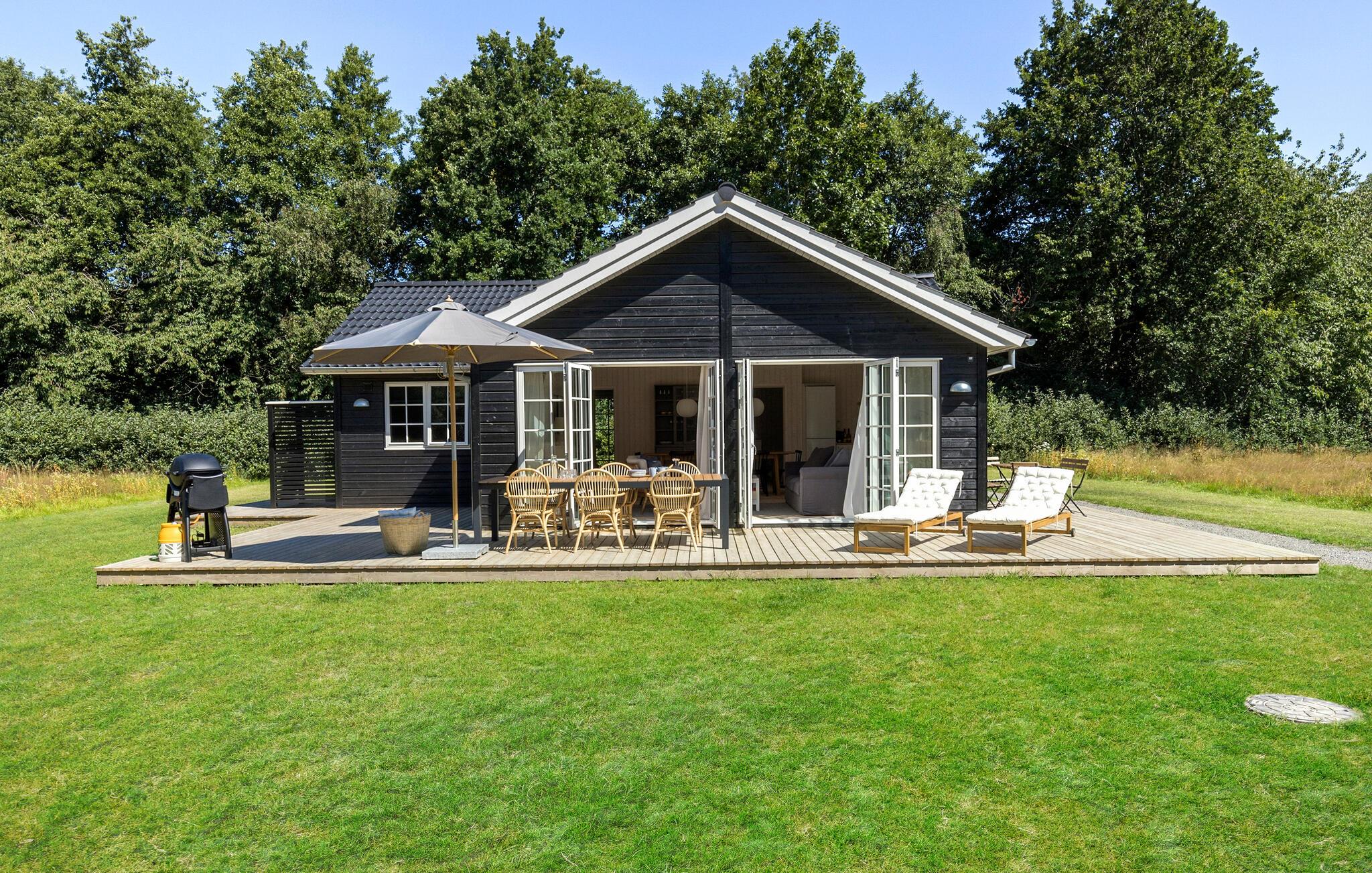 Comfortabel vakantiehuis nabij kindvriendelijk zandstrand met stijlvol interieur en groot houten terras.