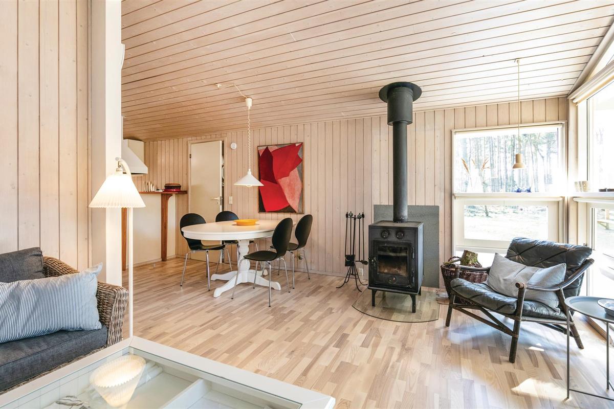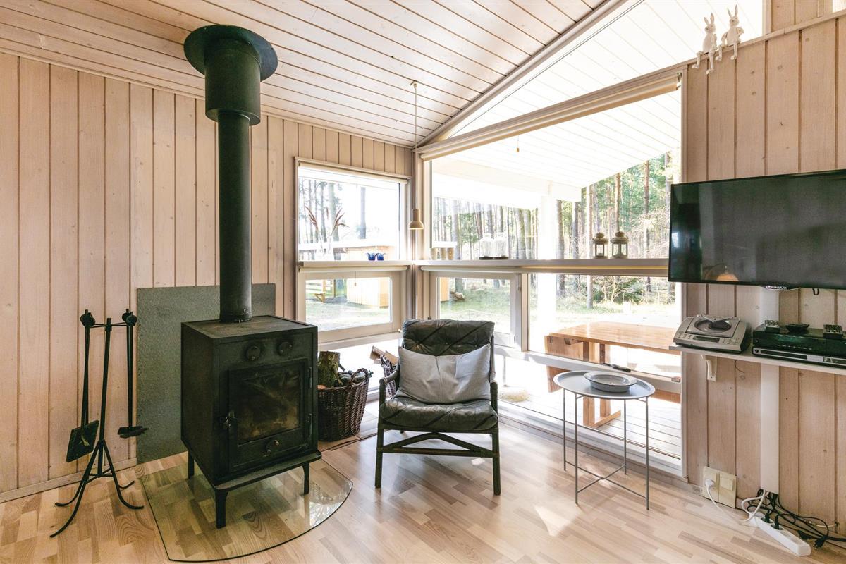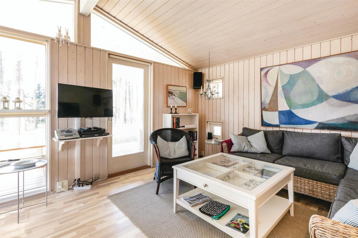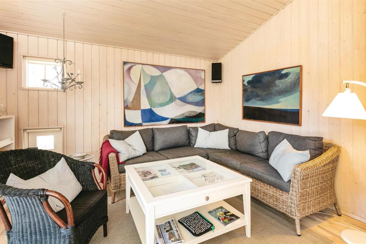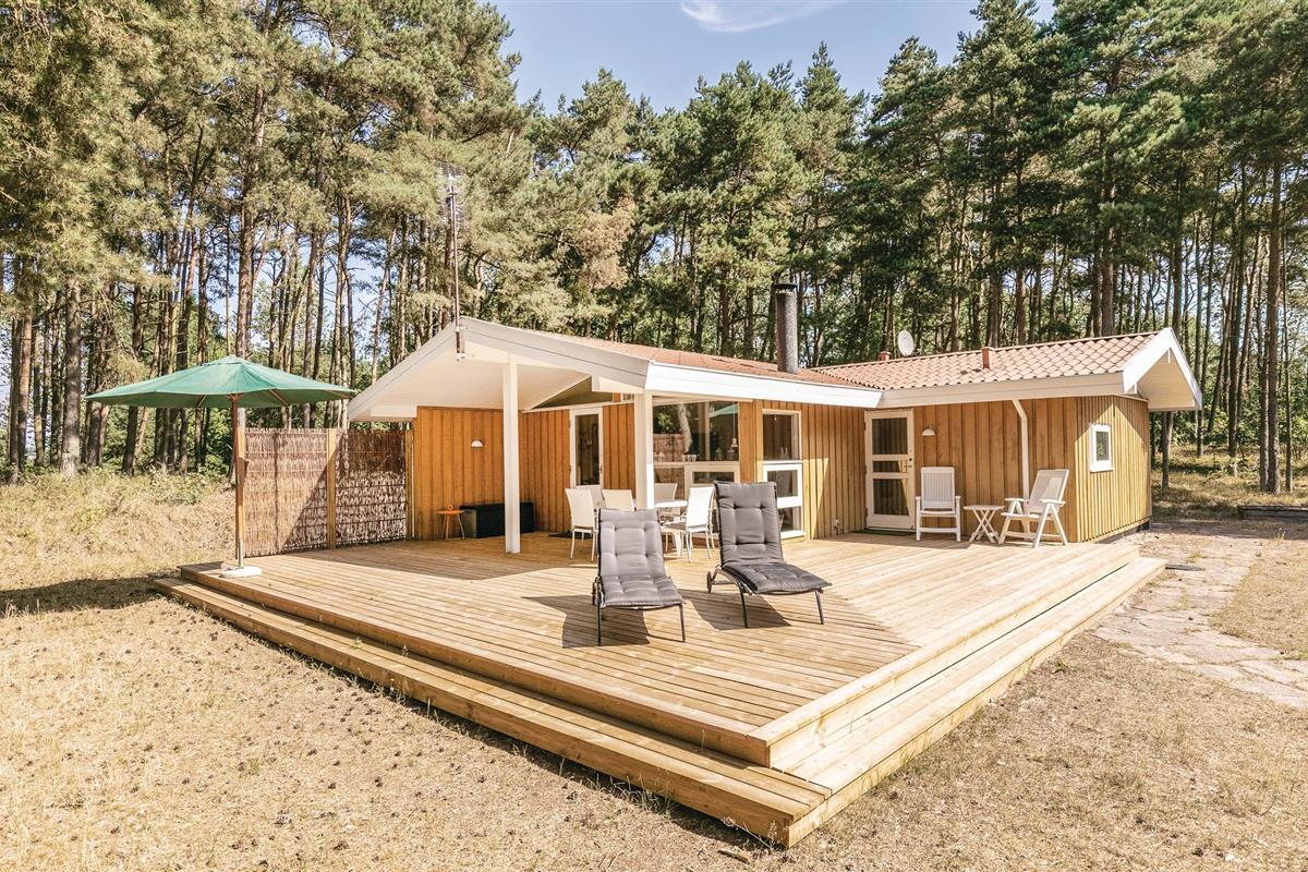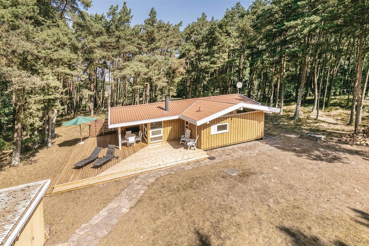 Uitnodigend en goed onderhouden houten vakantiehuis. Het is gelegen in een rustige vakantiehuis nederzetting en heeft een goed natuurlijk perceel. Het interieur is licht en modern. Er is ook een houtkachel in de gezellige keuken-woonkamer. Verwarming ook via een warmtepomp, ook internet is gratis beschikbaar. Het terras voor de woonkamer is open en groot. Voor kinderen is er volop ruimte, schommel, zandbak en spelletjes aanwezig. Er is een carport bij het huis. Niet ver weg is een uitstekend zandstrand, goede fietspaden en een gezellige visrokerij, Bakkarøgeriet, die typische visspecialiteiten van het eiland produceert. In de zomer zijn er meerdere keren per week barbecue-avonden en muziek in het restaurant. Een kleine boothaven is ook de moeite waard.