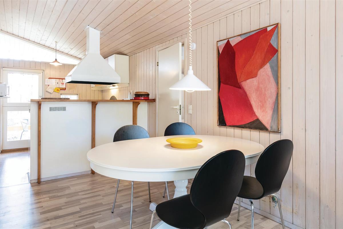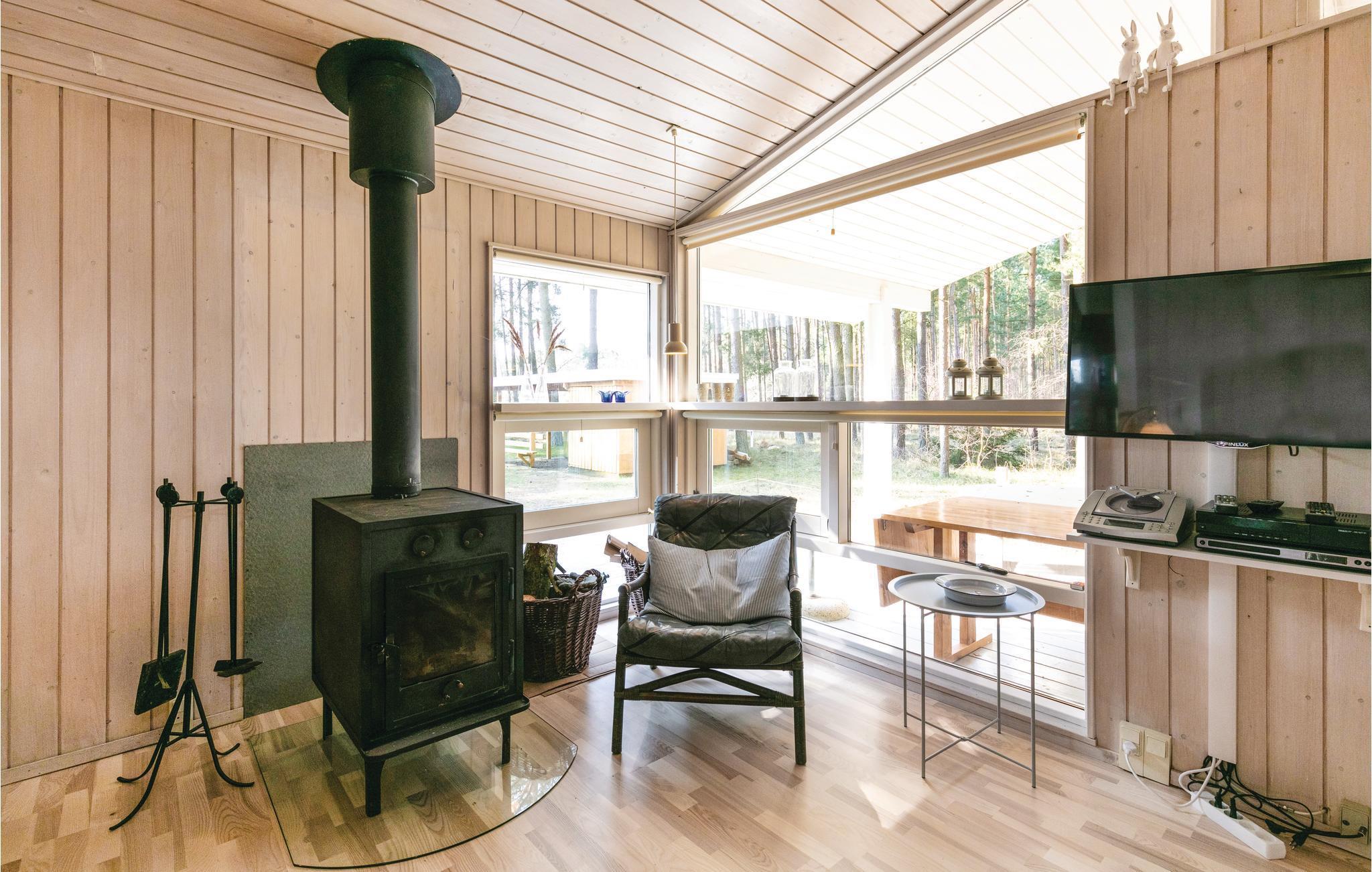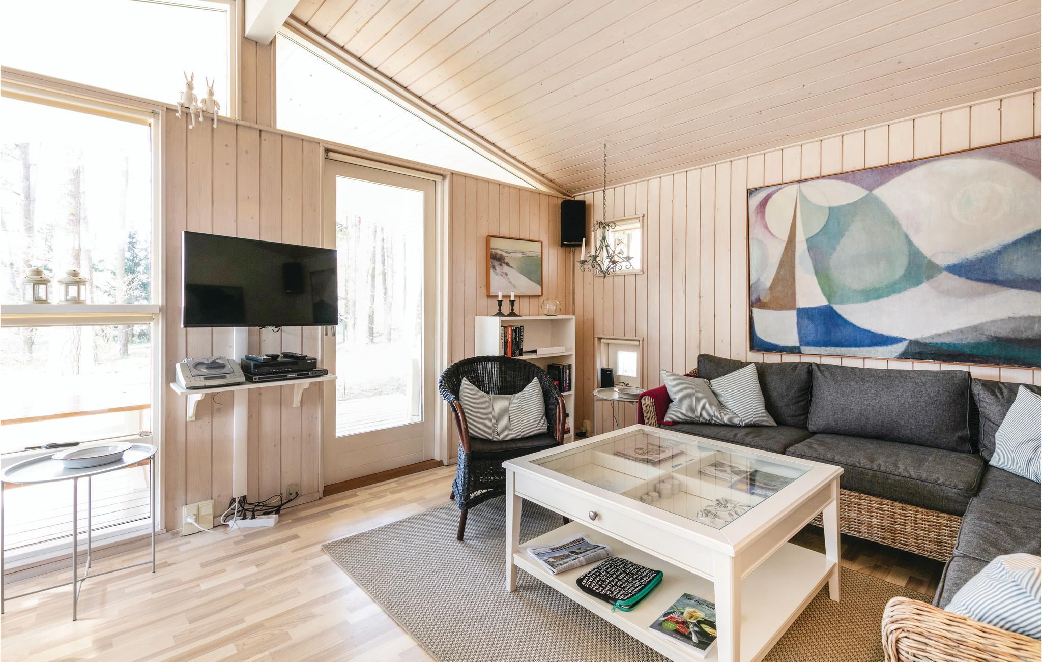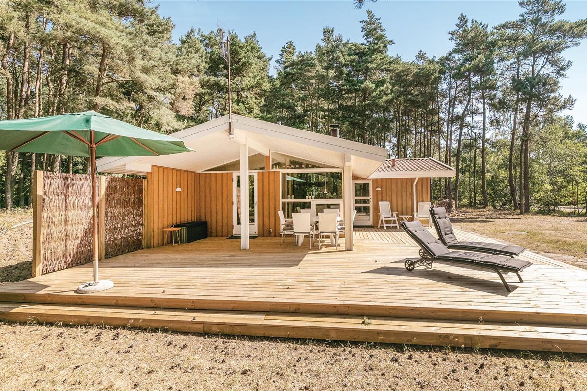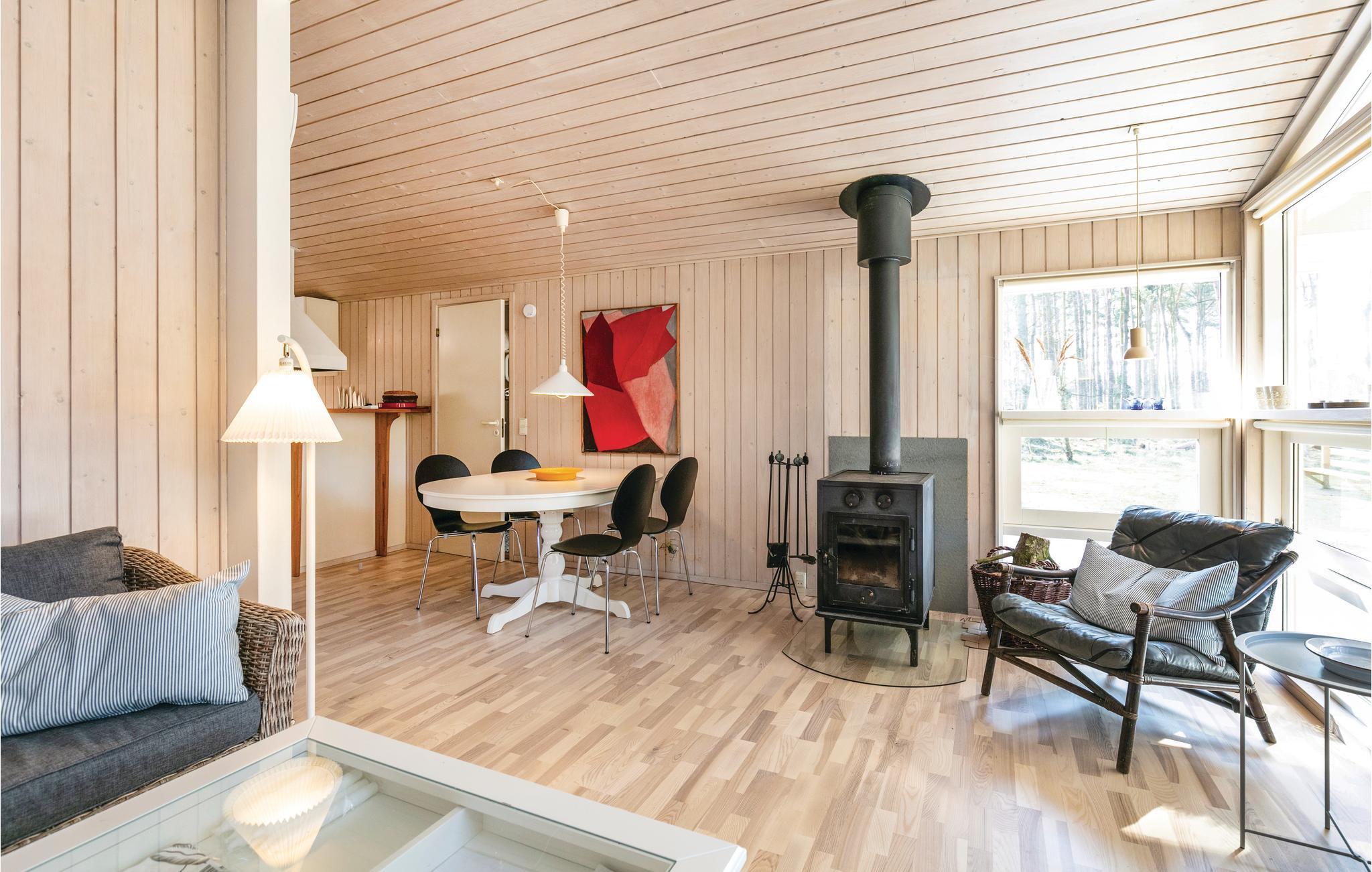 Uitnodigend en goed onderhouden houten vakantiehuis. Het is gelegen in een rustige vakantiehuis nederzetting en heeft een goed natuurlijk perceel. Het interieur is licht en modern. Er is ook een houtkachel in de gezellige keuken-woonkamer. Verwarming ook via een warmtepomp, ook internet is gratis beschikbaar. Het terras voor de woonkamer is open en groot. Voor kinderen is er volop ruimte, schommel, zandbak en spelletjes aanwezig. Er is een carport bij het huis. Niet ver weg is een uitstekend zandstrand, goede fietspaden en een gezellige visrokerij, Bakkarøgeriet, die typische visspecialiteiten van het eiland produceert. In de zomer zijn er meerdere keren per week barbecue-avonden en muziek in het restaurant. Een kleine boothaven is ook de moeite waard.