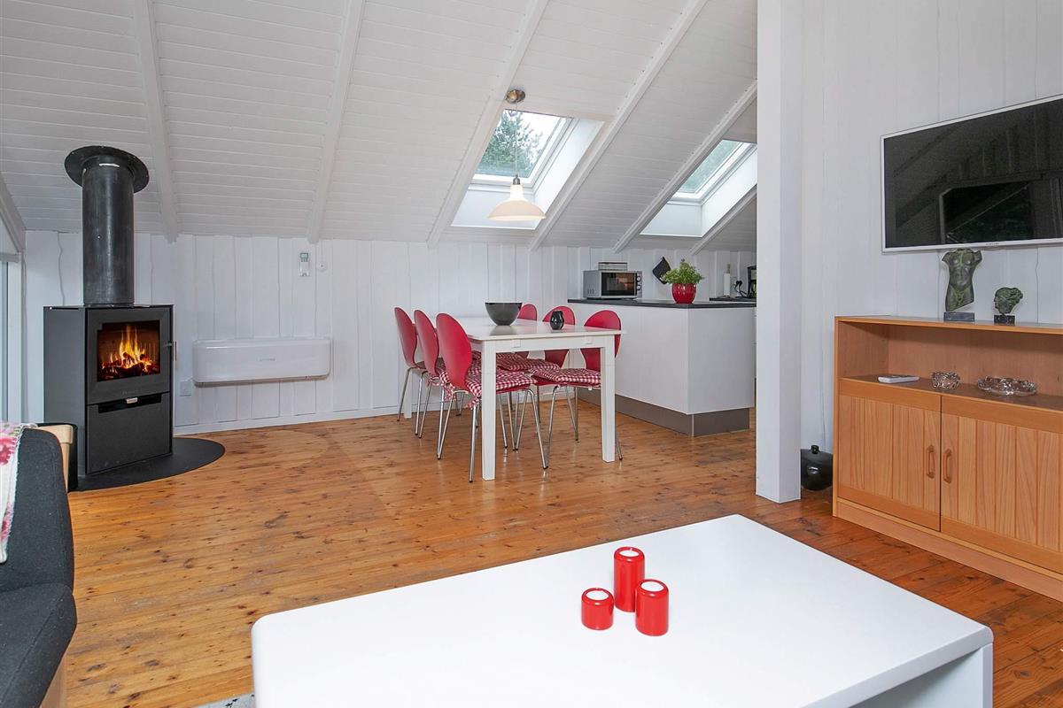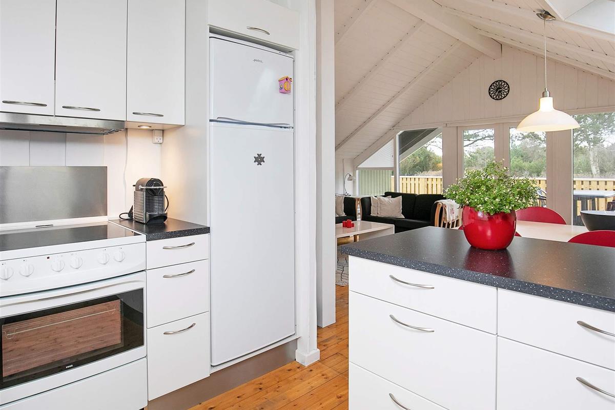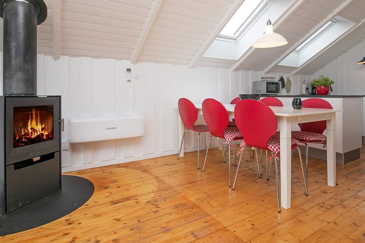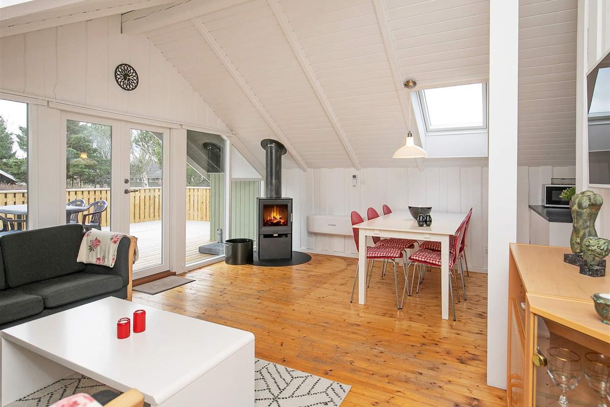 Hell und wohnlich eingerichtetes Ferienhaus, mit Küchenausstattung von 2018 und modernem Mobiliar. In dem offenen Küchen-/Wohnbereich mit Holzboden sorgen zwei Dachfenster sowie eine bodentiefe Fensterfront für viel Tageslicht im Haus und zugleich schönen Ausblick zu der vorgelagerten, weitläufigen Holzterrasse. Im Haus wurde zur Minimierung der Heizkosten eine moderne Wärmepumpe installiert, zudem gibt es einen Holzofen für kühlere Abende, zu dem man sowohl von der Ess- als auch der Sitzecke Ausblick hat. Für die Jüngsten stehen Kinderbett und Hochstuhl bereit.