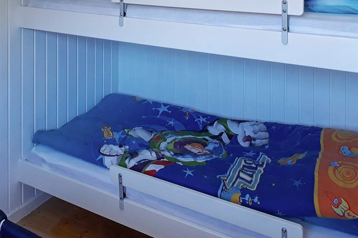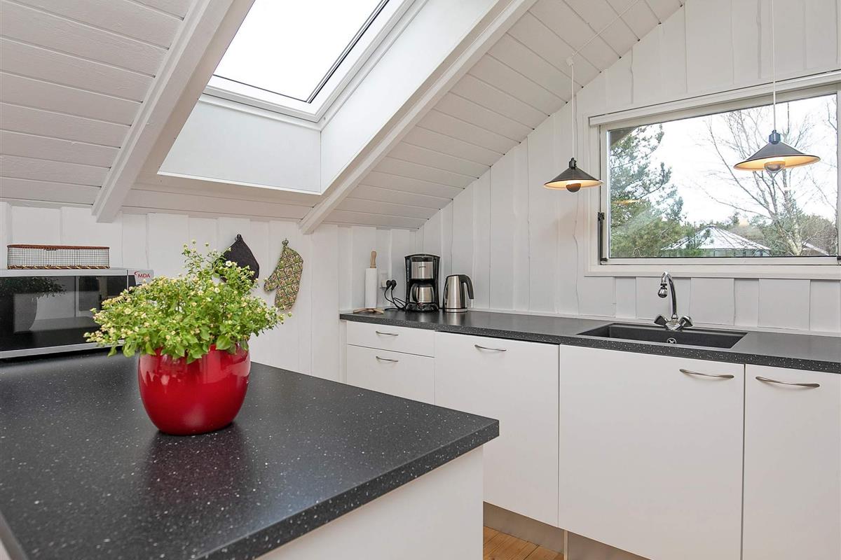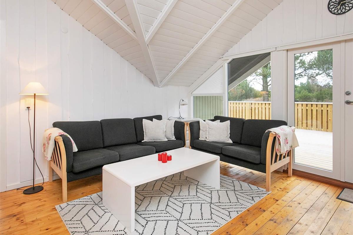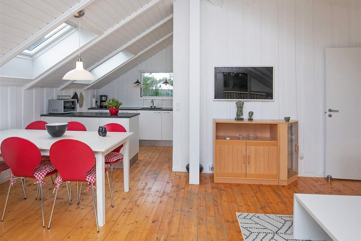 Hell und wohnlich eingerichtetes Ferienhaus, mit Küchenausstattung von 2018 und modernem Mobiliar. In dem offenen Küchen-/Wohnbereich mit Holzboden sorgen zwei Dachfenster sowie eine bodentiefe Fensterfront für viel Tageslicht im Haus und zugleich schönen Ausblick zu der vorgelagerten, weitläufigen Holzterrasse. Im Haus wurde zur Minimierung der Heizkosten eine moderne Wärmepumpe installiert, zudem gibt es einen Holzofen für kühlere Abende, zu dem man sowohl von der Ess- als auch der Sitzecke Ausblick hat. Für die Jüngsten stehen Kinderbett und Hochstuhl bereit.