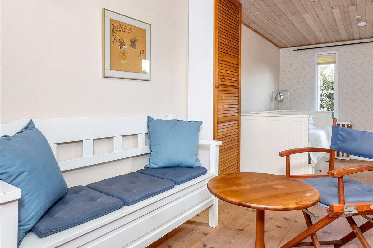 Die Atmosphäre im 125 m² großen Sommerhaus ist hell und freundlich. Der Grundriss eignet sich gut für sechs Personen und eventuell ein Kind, da sich zwei Schlafzimmer im ersten Stock und zwei Schlafplätze im Anbau befinden. Auf der Terrasse gibt es einen großen Spielbereich mit Spielzeug für die Kleinen. Im Anbau gibt es außerdem Tischfußball und Darts.