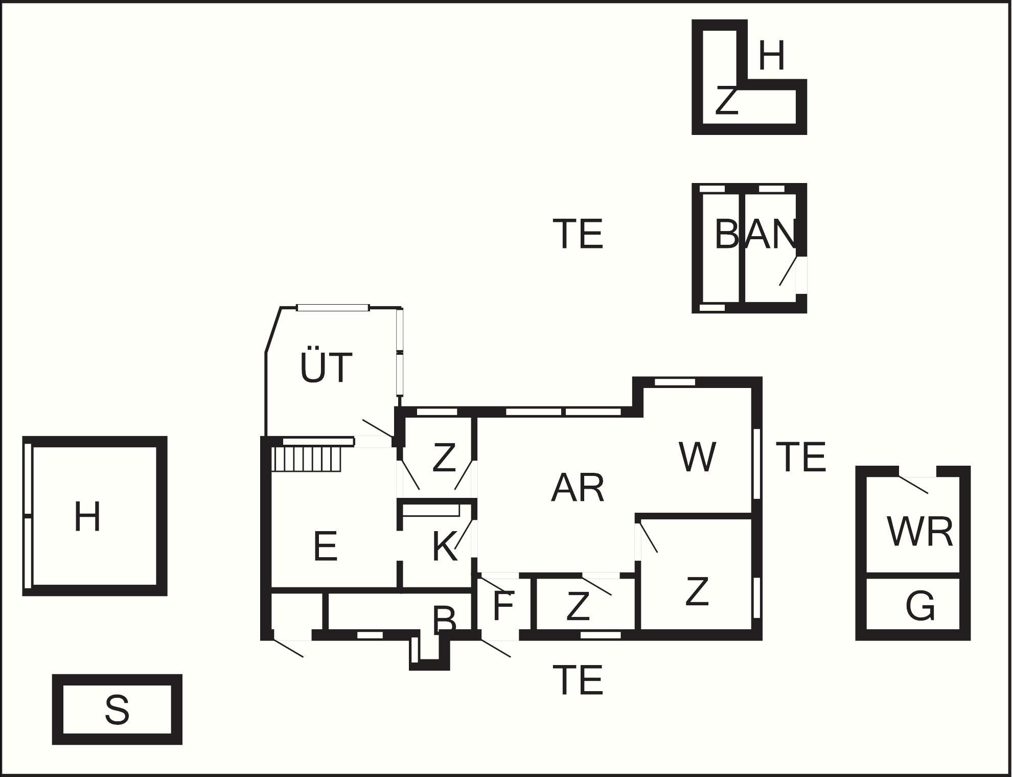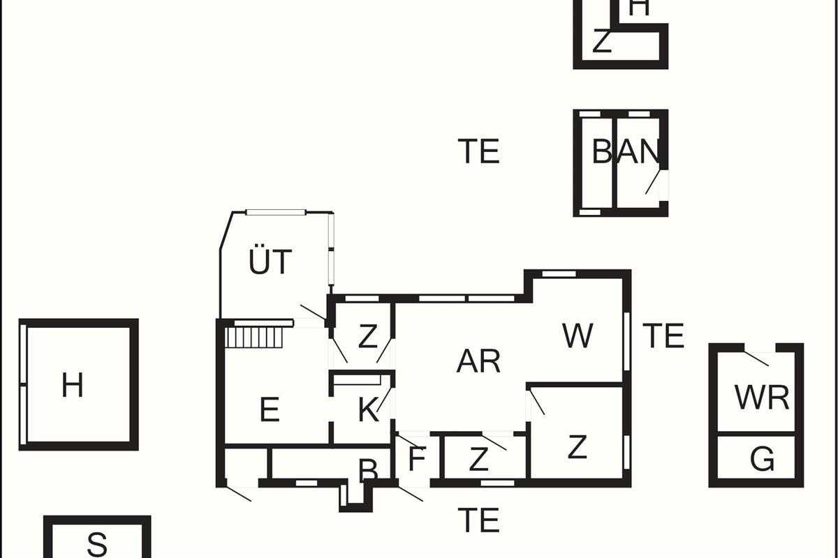 Bad: WC, Waschb., Außendusche, Dusche, Fußbodenheiz.