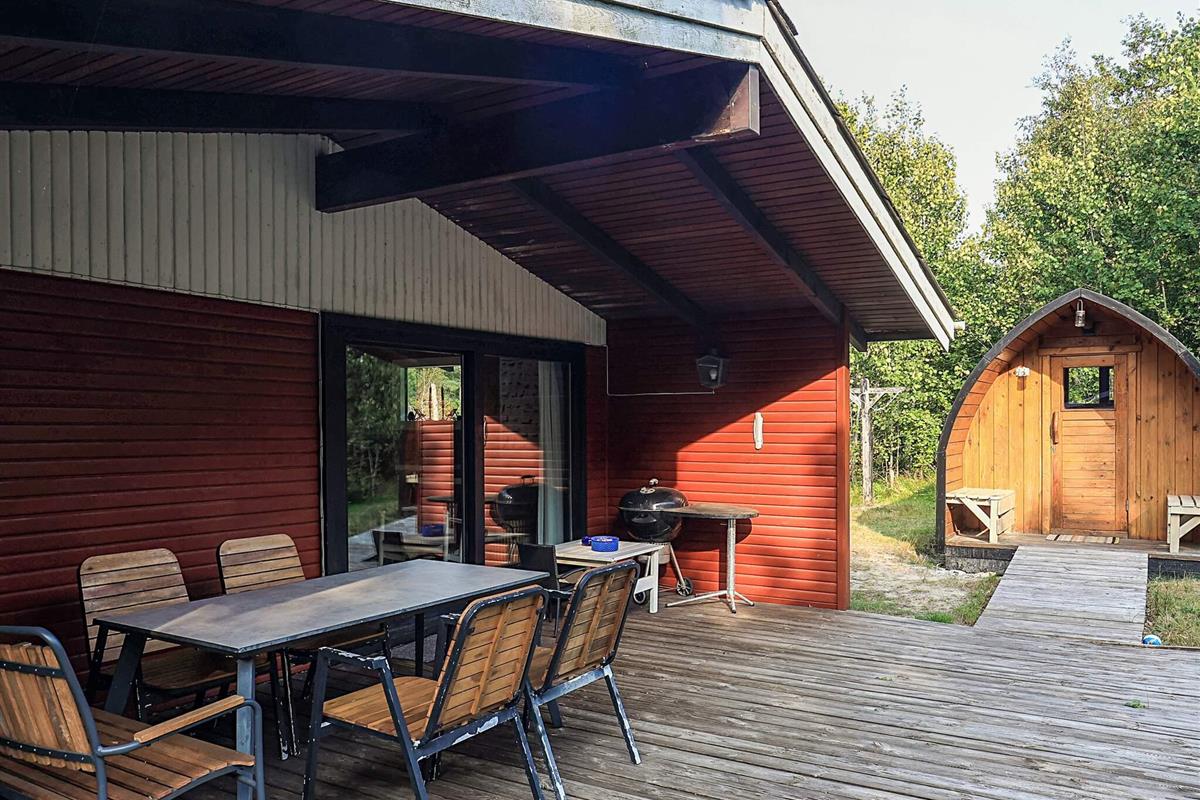 Und: Terrasse, überd. Terrasse, E-Heiz., Solarenergie, Luft-Luft-Wärmepumpe, Grill, Naturgrundst. m. Bäumen 2600 m2, gemischte Möblierung, Ferienhausgebiet