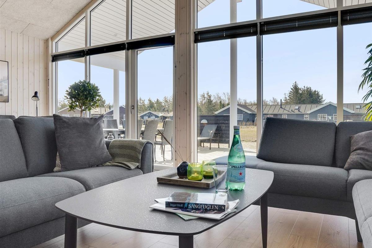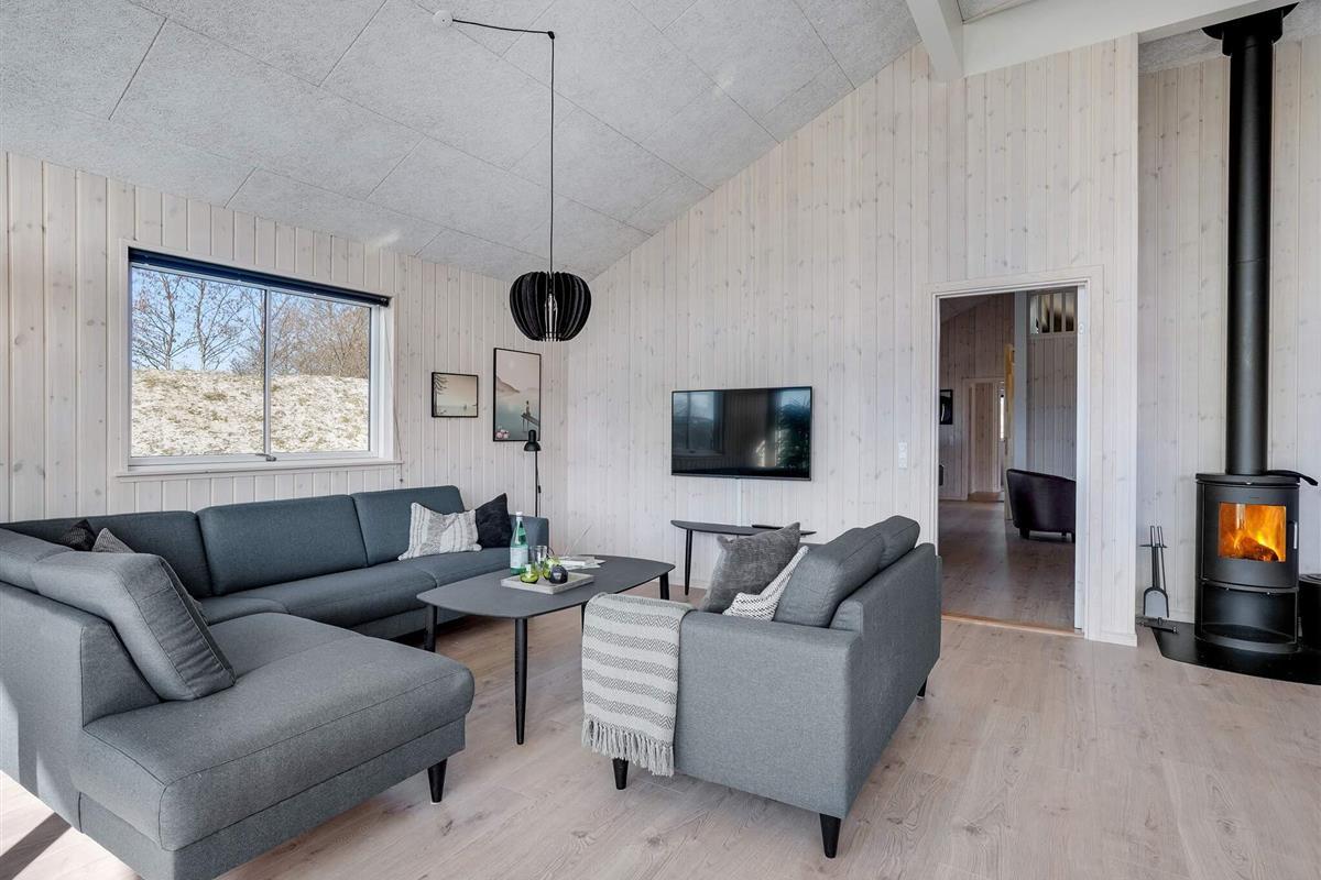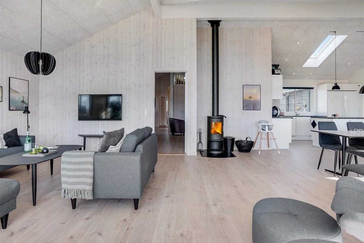 In der Wohnküche befindet sich auch die Sofagruppe, die in der Nähe des Holzofens des Ferienhauses steht, der an kühlen Tagen eine wohlige Wärme verbreitet.