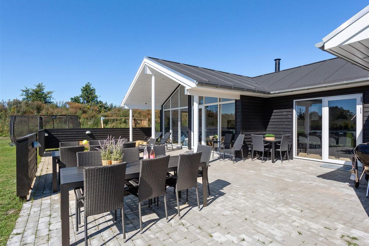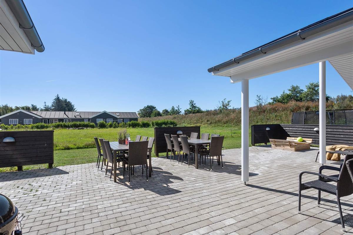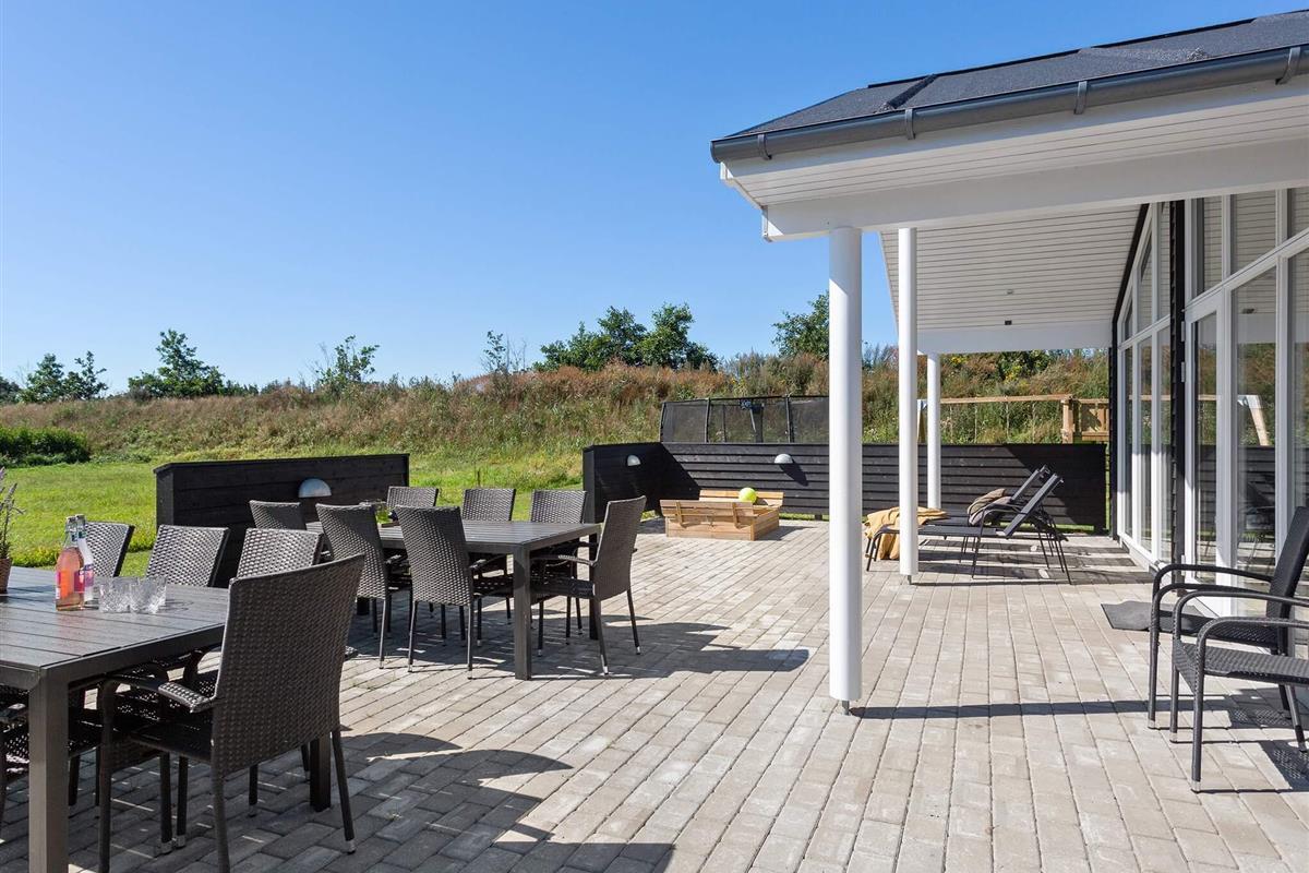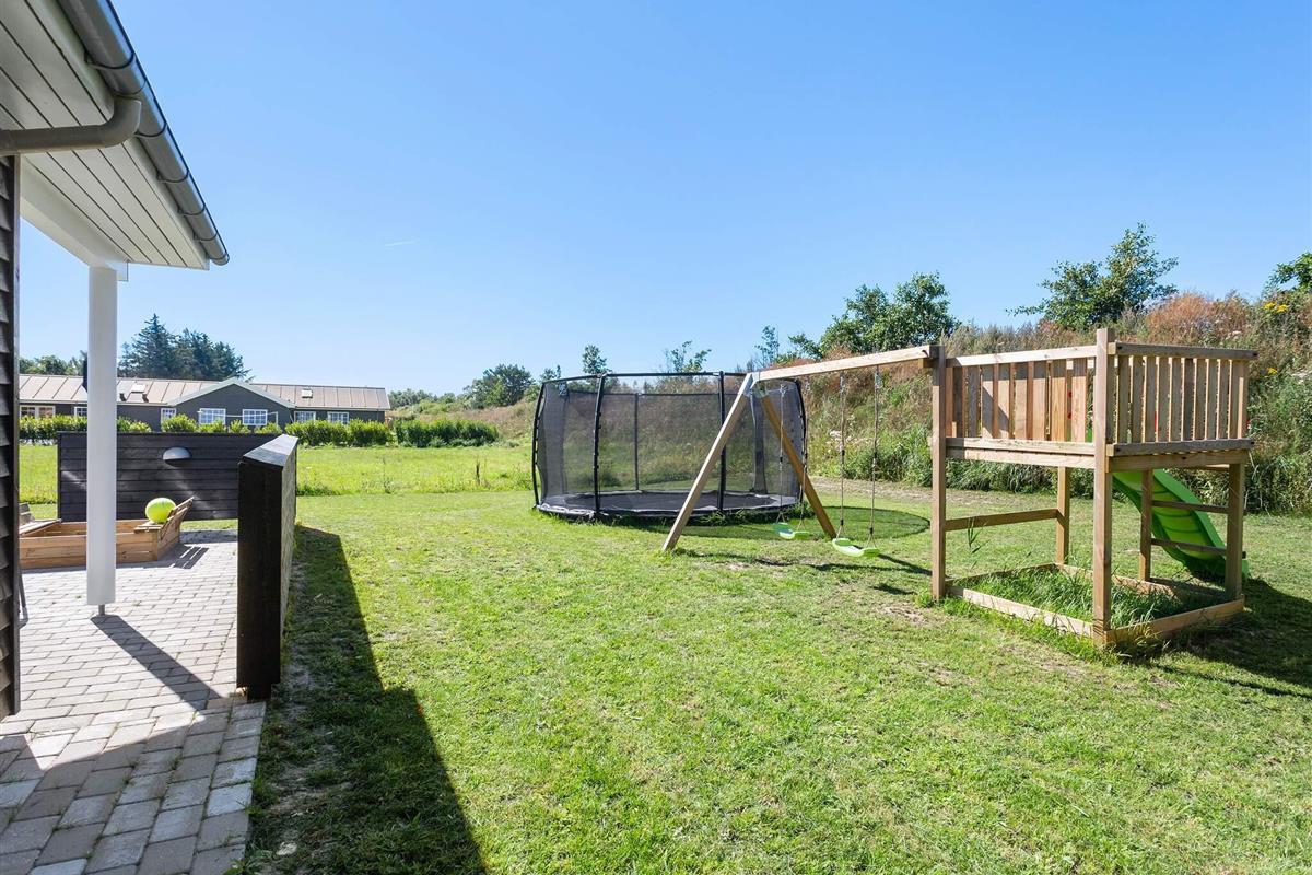 Die teilweise überdachte Terrasse bietet reichlich Gelegenheit, die dänische Sonne zu genießen. Gartenmöbel und ein Grill laden zum Grillen ein. Für die Kinder gibt es außerdem eine Schaukel, ein Trampolin und einen Spielturm.