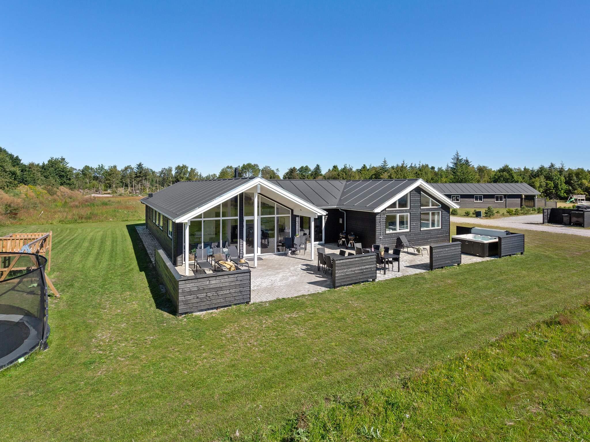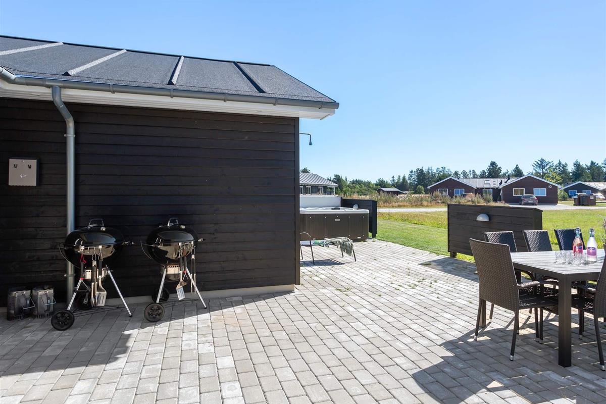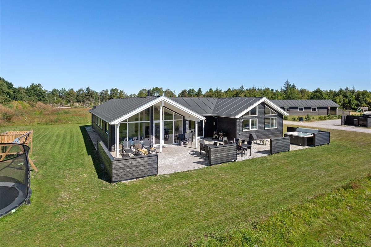 Die teilweise überdachte Terrasse bietet reichlich Gelegenheit, die dänische Sonne zu genießen. Gartenmöbel und ein Grill laden zum Grillen ein. Für die Kinder gibt es außerdem eine Schaukel, ein Trampolin und einen Spielturm.