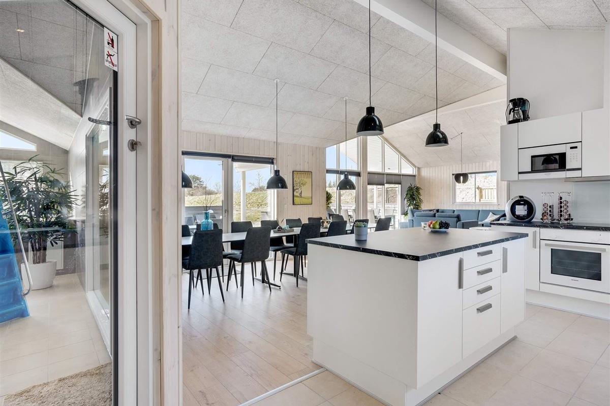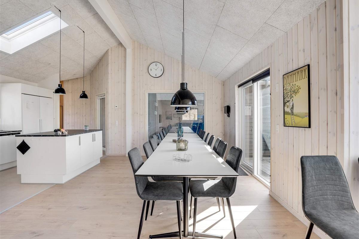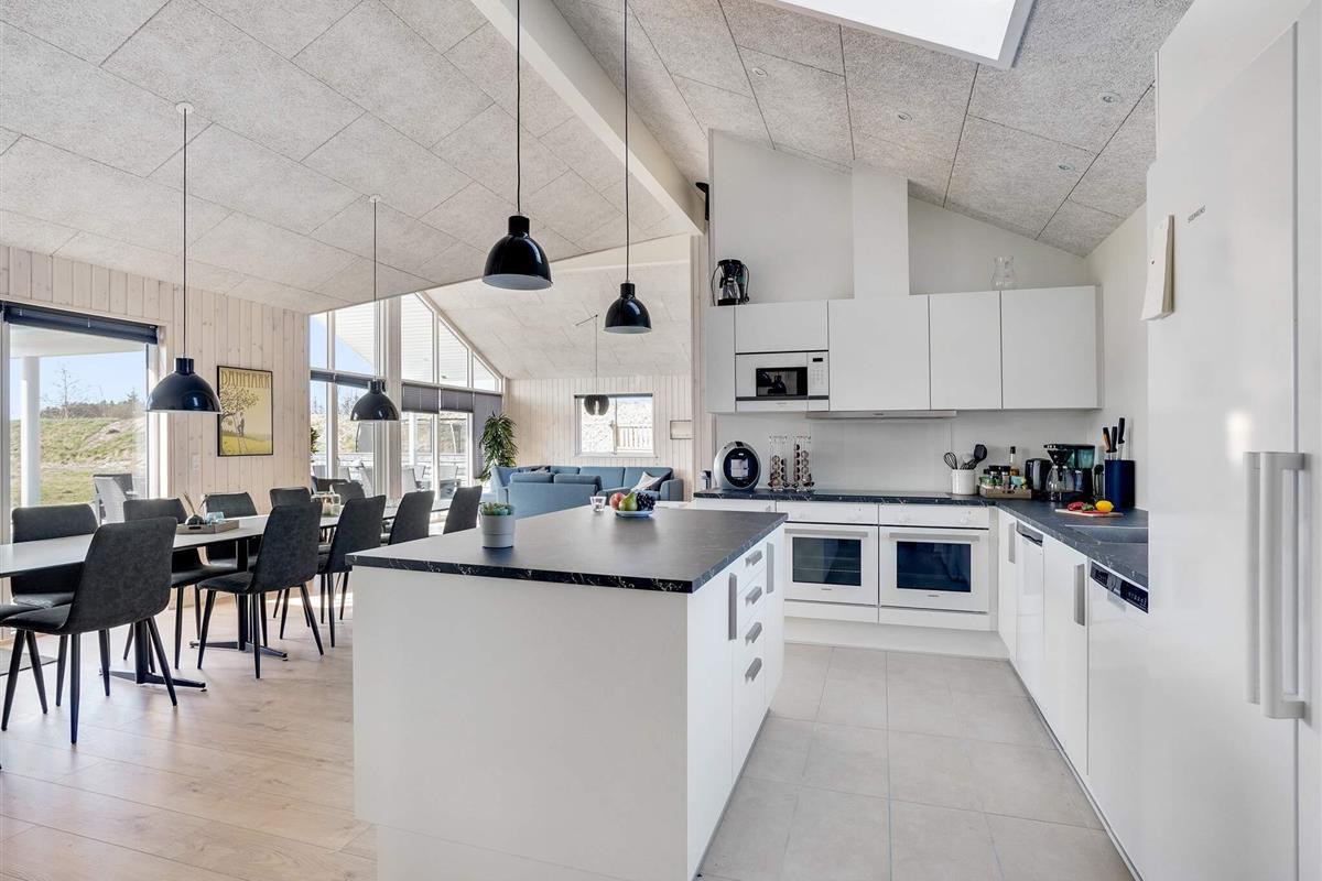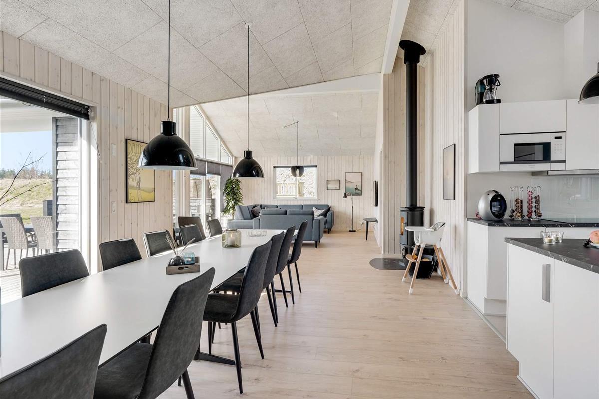 In der Mitte des Hauses befindet sich die Wohnküche, die ebenfalls viel Platz für alle Gäste bietet. Sie hat hohe Decken und viel Platz rund um den Esstisch, sodass alle zusammenkommen können. Die Küche ist mit zwei Backöfen, zwei Geschirrspülern und zusätzlichen Kochplatten gut ausgestattet – so sollten auch große Abendessen kein Problem sein.