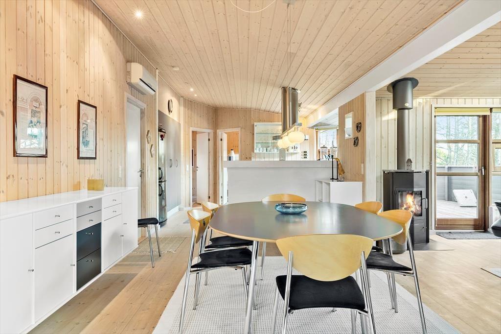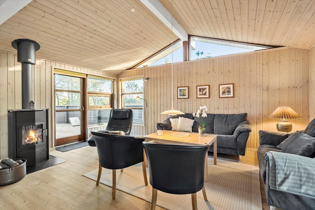 Drinnen erwartet dich eine helle und gemütliche Einrichtung, in der sich sofort Urlaubsstimmung einstellt. Das Herz des Hauses ist der offene Wohn- und Küchenbereich, der eine einladende Atmosphäre für geselliges Beisammensein schafft. Während einige das Abendessen in der Küche zubereiten, kann der Rest der Gruppe es sich auf dem Sofa mit einem guten Buch oder einem Spieleabend gemütlich machen. An kühleren Tagen kannst du den Kamin anzünden und die knisternde Wärme genießen, die sich im Raum ausbreitet. Die großen Fenster holen die Natur ganz nah heran und sorgen für einen schönen Lichteinfall, der die entspannte Atmosphäre unterstreicht.