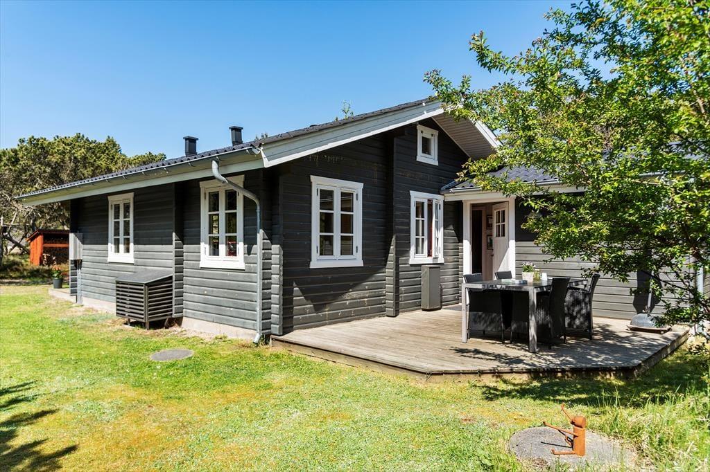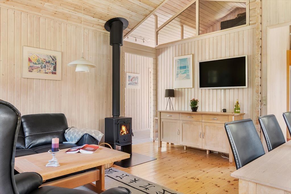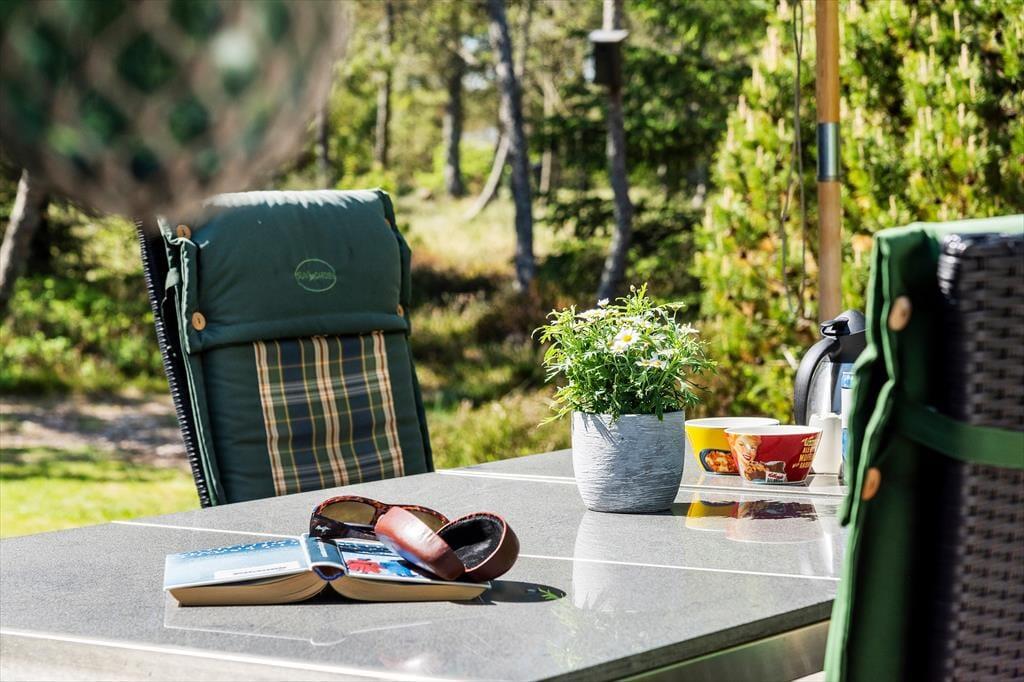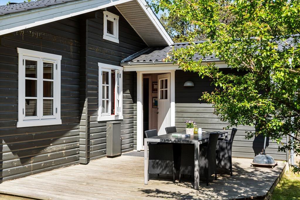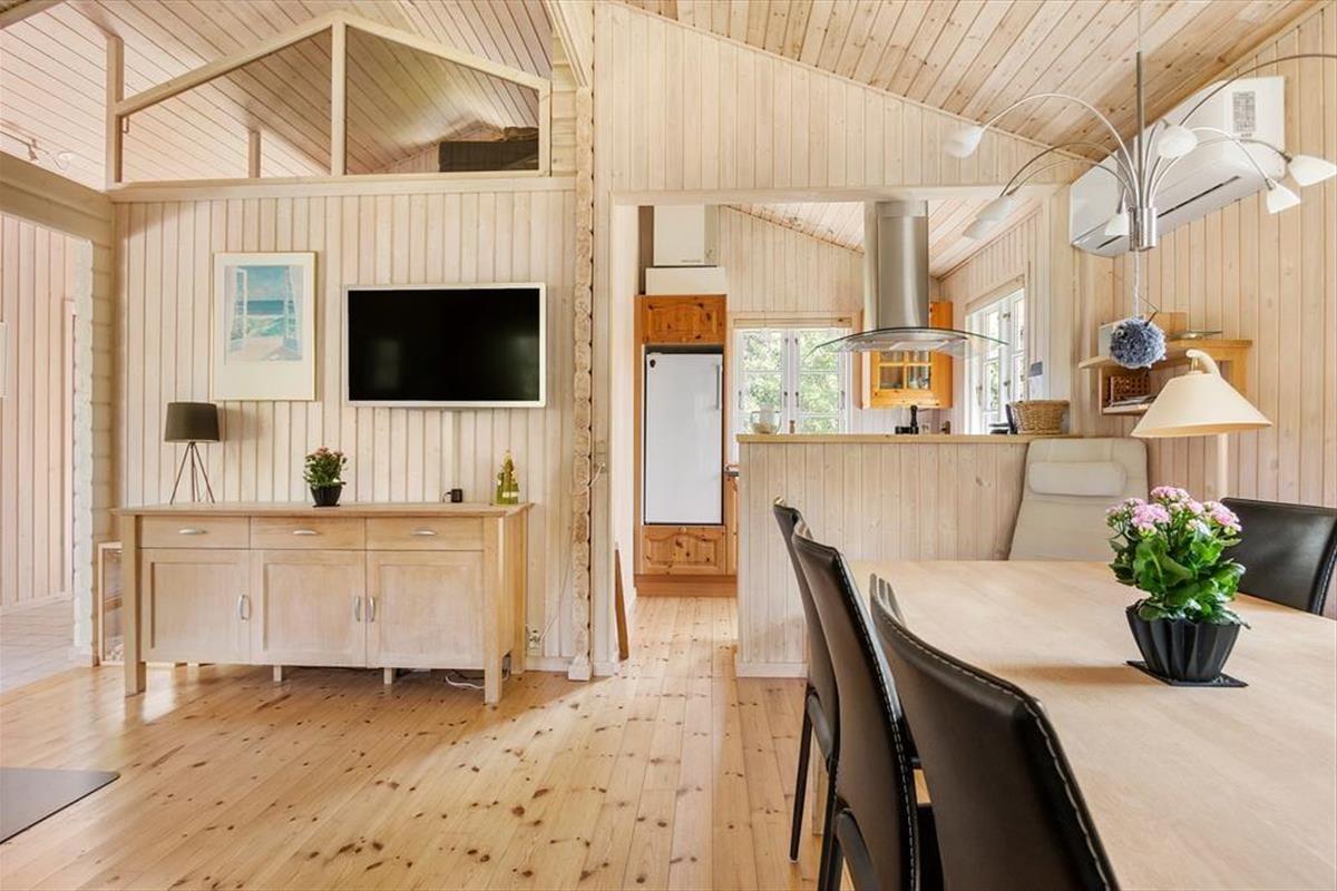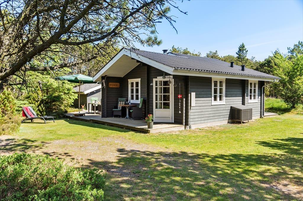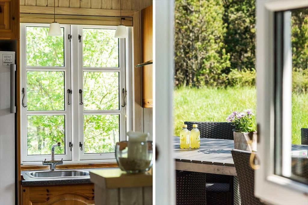 Das Haus liegt mitten in der Natur, und schon bei der Ankunft spürst du Ruhe und Frieden. Hier genießt du die klassisch-gemütliche Ferienhaus-Atmosphäre sowohl drinnen als auch draußen. Und vom schönen Wohnzimmer aus kannst du den Blick auf das viele Grün genießen. Der Aufenthaltsraum hat eine hohe Decke und helle Holzwände, die zusammen mit den schönen Sprossenfenstern zur hellen und angenehmen Atmosphäre beitragen. Vom Wohnzimmer aus gelangst du direkt auf die Terrasse, die mit einem gemütlichen Kamin ausgestattet ist. Die Küche ist im klassischen Ferienhausstil zum Wohnzimmer hin offen, sodass du kochen und trotzdem an den Gesprächen am Tisch teilnehmen kannst. Das Haus verfügt außerdem über zwei Schlafzimmer und ein Badezimmer.
