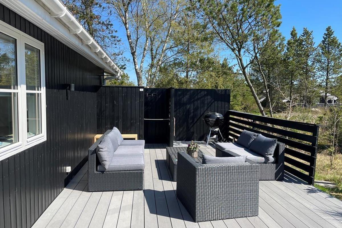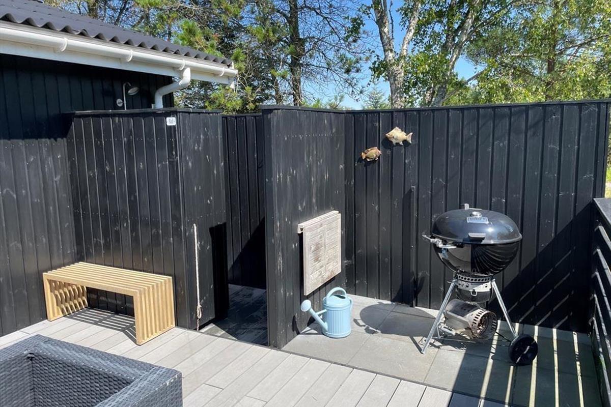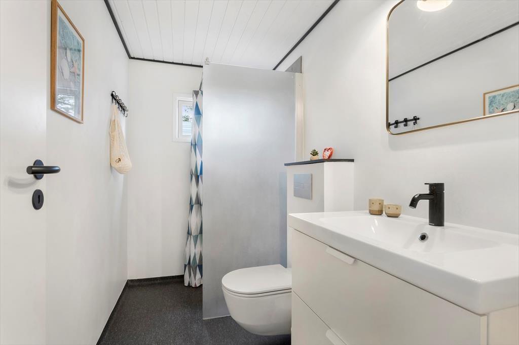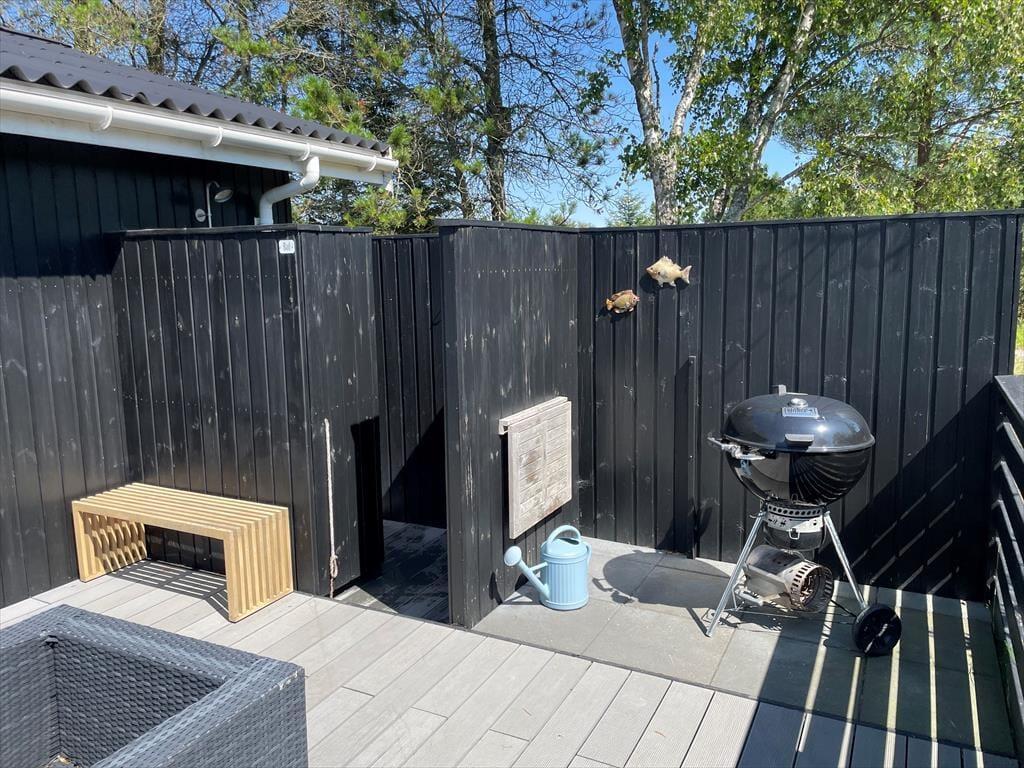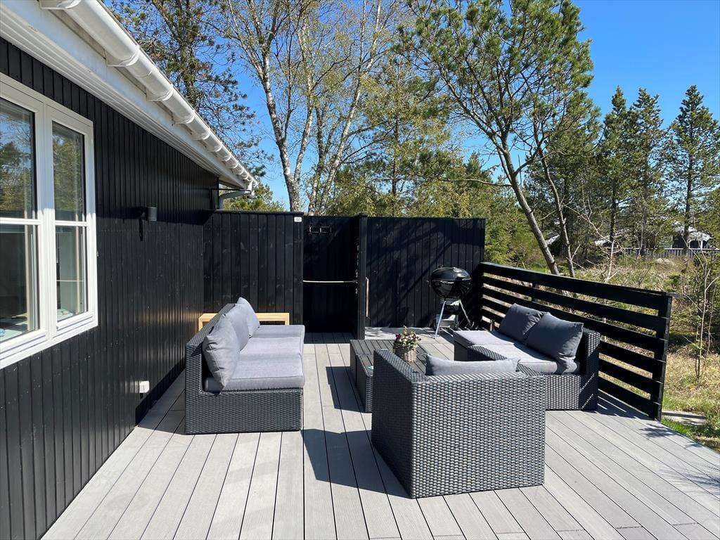 Das Badezimmer des Ferienhauses ist hell und ansprechend wie die übrigen Räume, aber wenn das Wetter mitspielt, hast du auch die Möglichkeit, deine Morgendusche im Freien unter der Außendusche zu genießen – was für ein wunderbarer Start in den Tag! Die Sonnenstunden lassen sich ideal auf der großen, nach Süden ausgerichteten Holzterrasse genießen, die gut zur Straße hin abgeschirmt ist und darüber hinaus einen Blick auf das schöne Naturgrundstück bietet. Wenn der Abend naht, könnt ihr euch in den Loungemöbeln entspannen, während der Grill vorbereitet wird – und vielleicht schmeckt das Abendessen noch köstlicher, wenn es in solch ruhigen und idyllischen Umgebungen genossen wird.