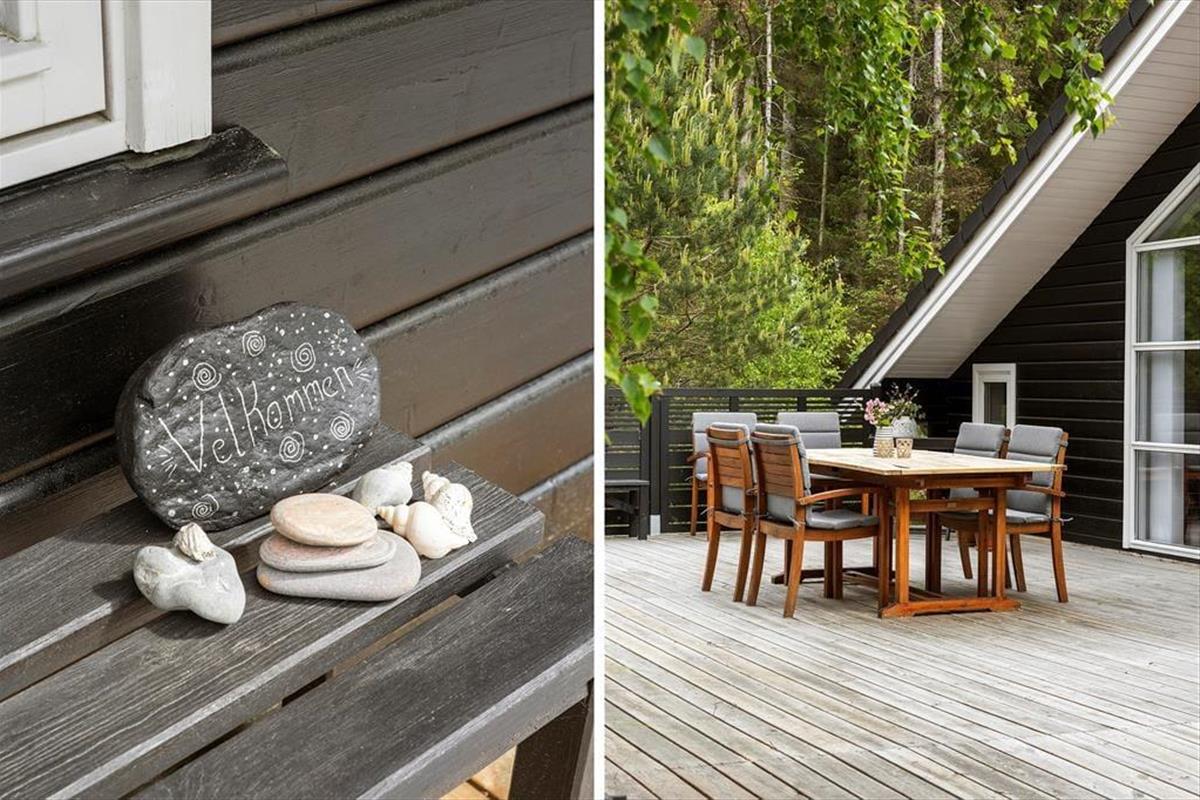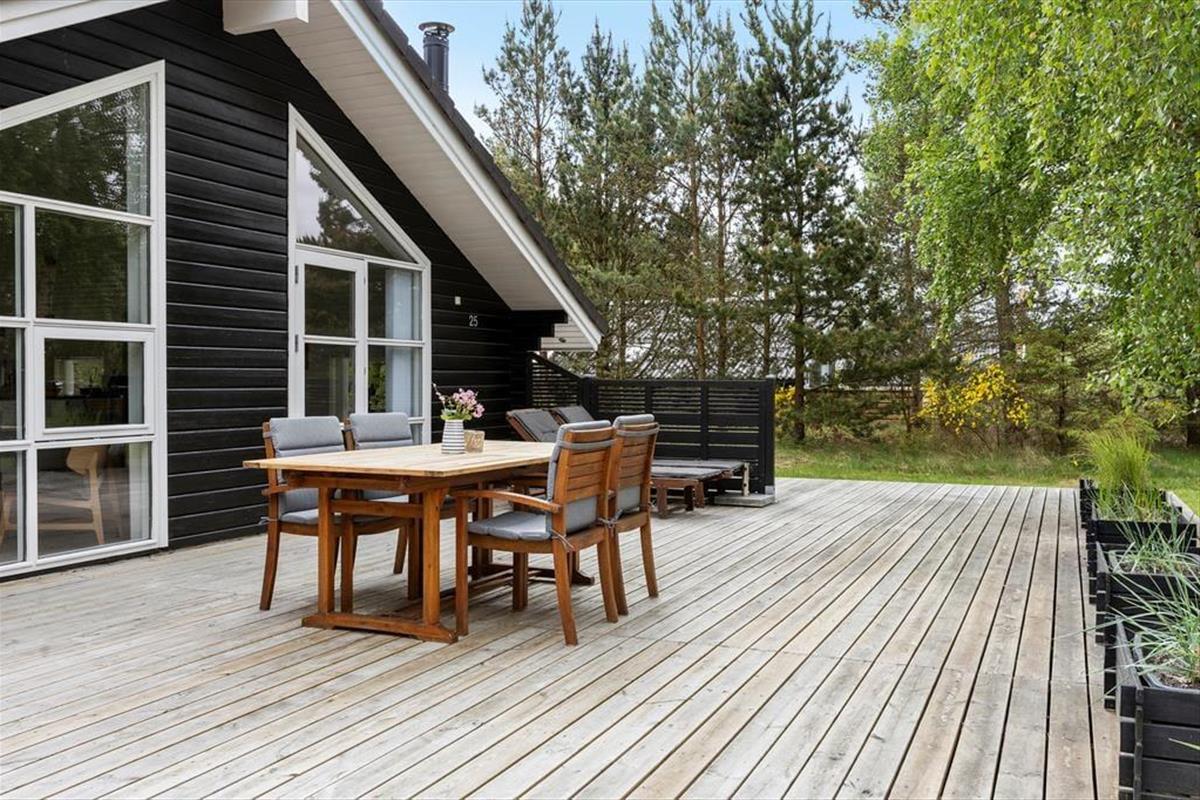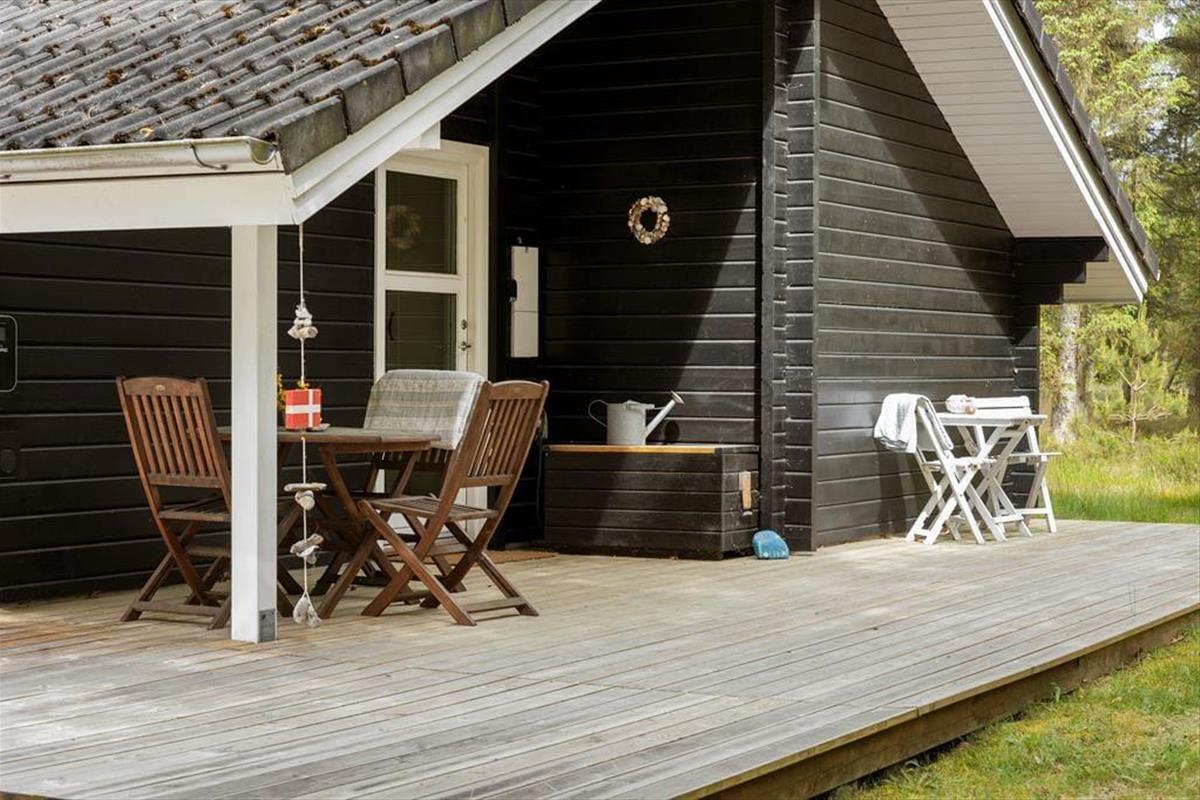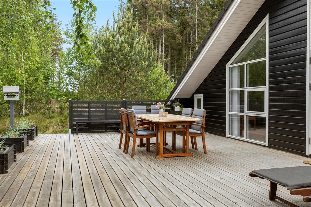 Die großzügige Terrasse des Ferienhauses ist ein wahres Paradies für alle, die gerne Zeit unter freiem Himmel verbringen. Die Terrasse umschließt fast das gesamte Haus, sodass Sie jederzeit ein sonniges Plätzchen oder eine kühle Schattenecke finden können – ganz nach Ihren Bedürfnissen. Genießen Sie Ihren Morgenkaffee mit Vogelgezwitscher im Hintergrund, entspannen Sie mit einem guten Buch im Liegestuhl oder versammeln Sie die Familie zu einem gemütlichen Grillabend mit dem Duft des Sommers in der Luft. Das weitläufige Naturgrundstück bietet viel Platz für Spiel und Erholung, und natürlich ist Ihr Hund ebenfalls herzlich willkommen, den Urlaub gemeinsam mit Ihnen zu verbringen.