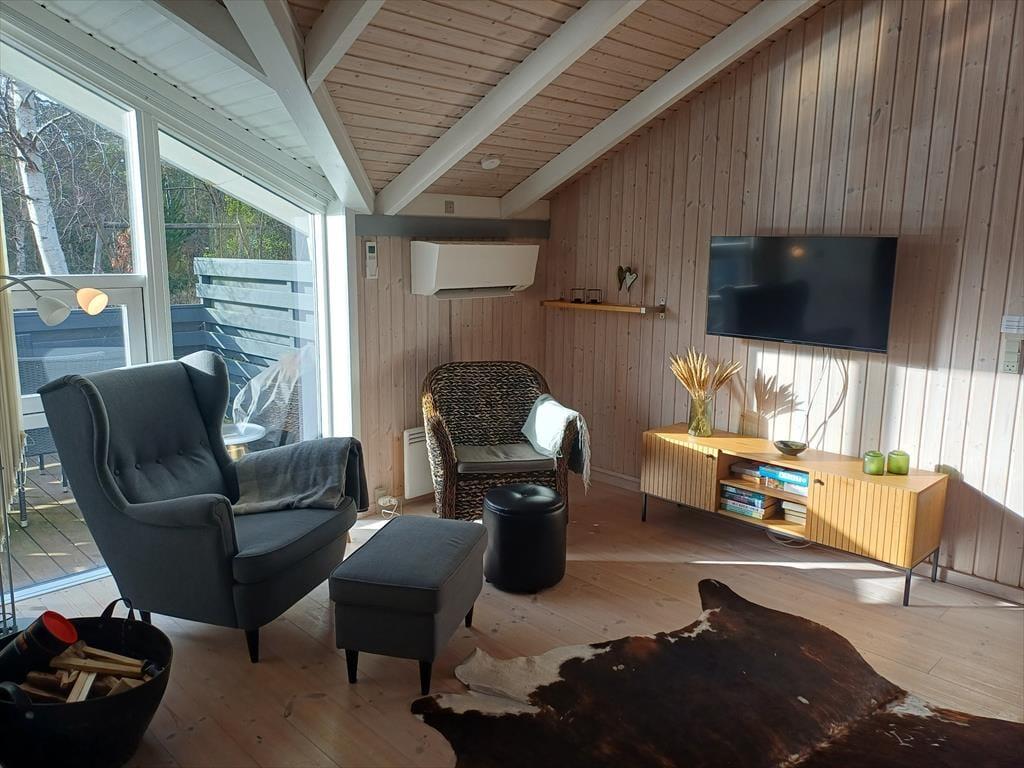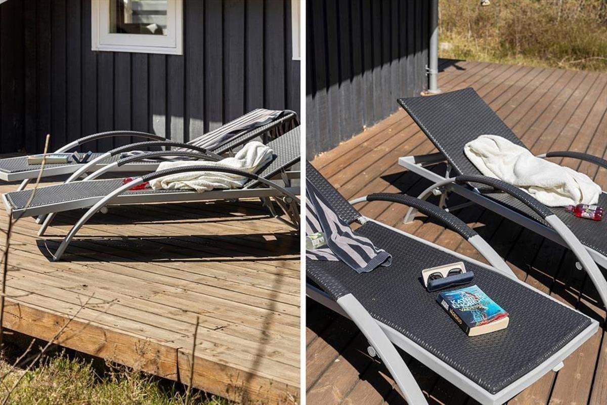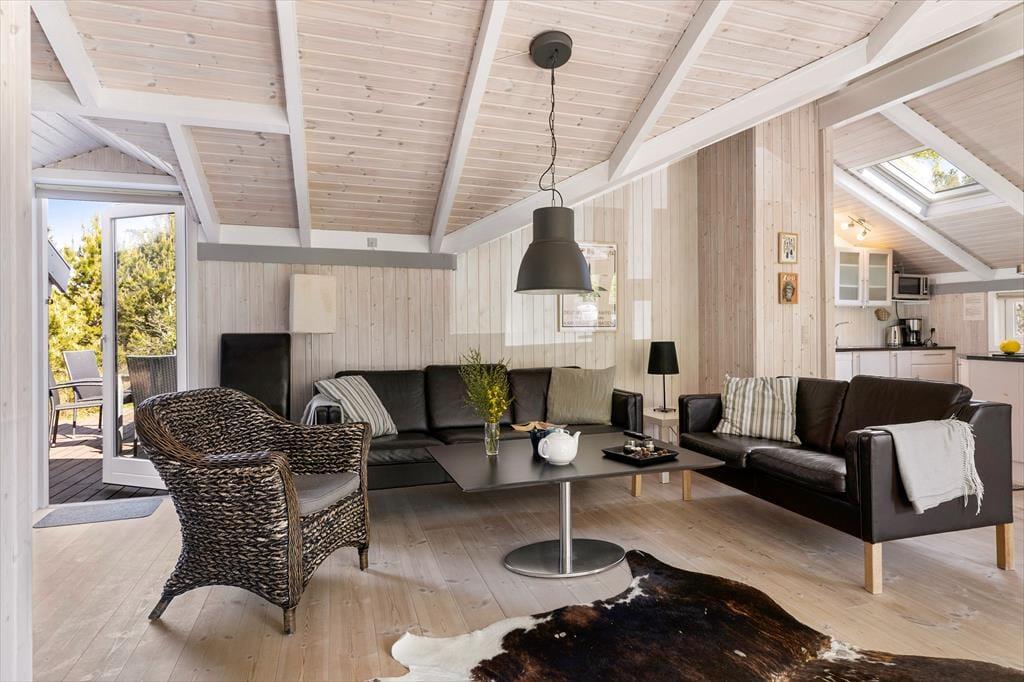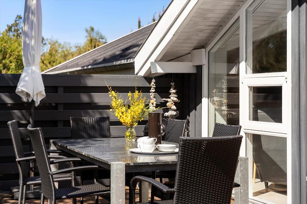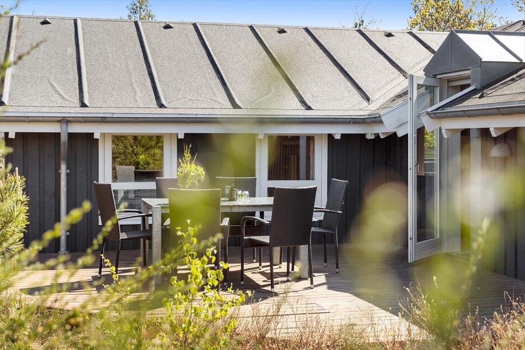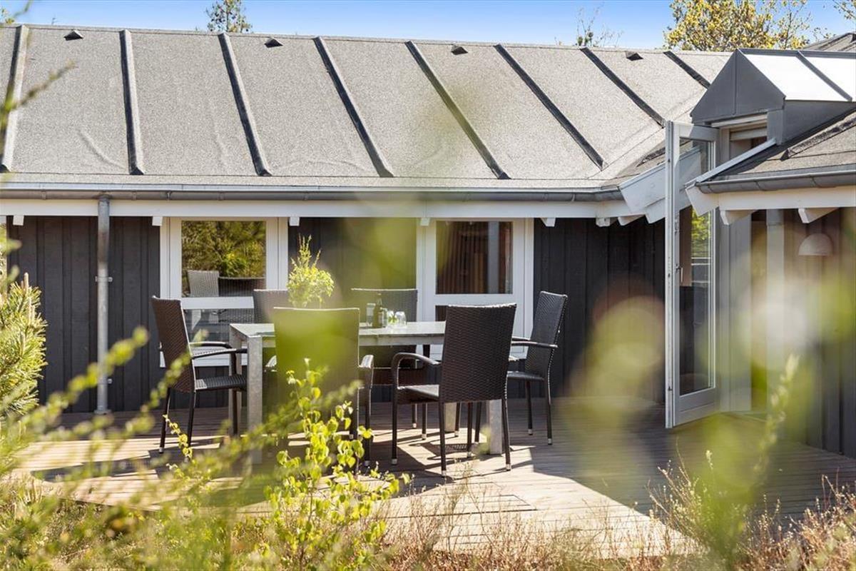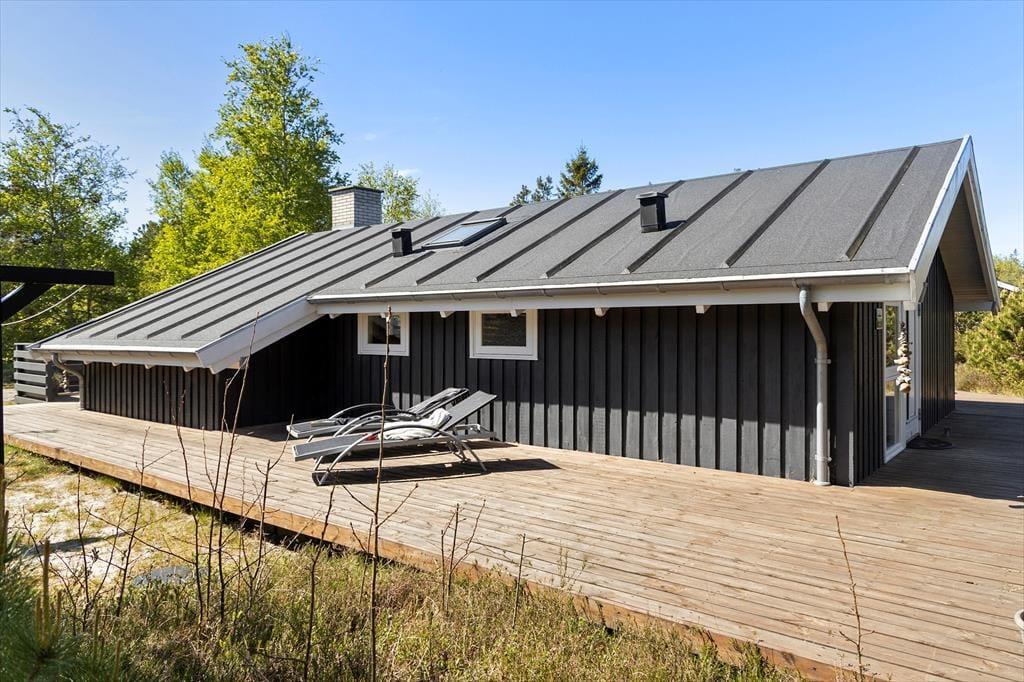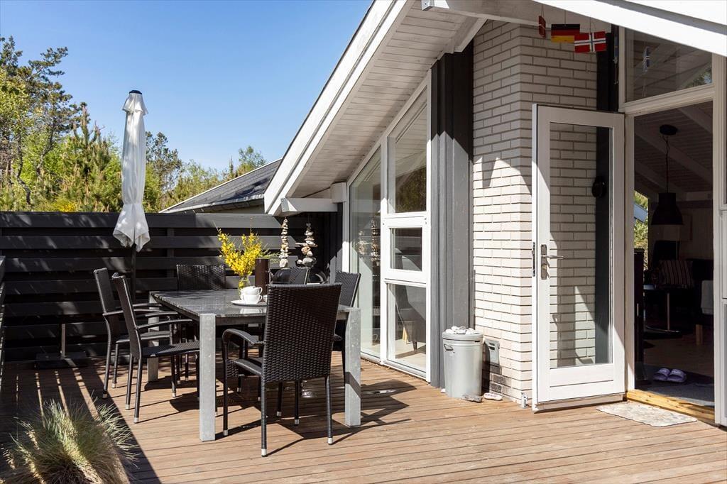 Die große Holzterrasse, die sich rund ums Haus zieht, ist ein echtes Highlight. Mehrere windgeschützte Ecken und sonnige Plätze bieten die perfekte Kulisse für entspannte Ferientage – sei es beim Morgenkaffee, einem Mittagsschläfchen in der Hängematte oder beim Grillabend unter dem nordjütländischen Sternenhimmel. Die grüne Bepflanzung sorgt für Privatsphäre und eine friedliche Atmosphäre, während der großzügige Außenbereich sowohl Rückzug als auch Geselligkeit ermöglicht. Hier können Sie das Leben unter freiem Himmel in vollen Zügen genießen.