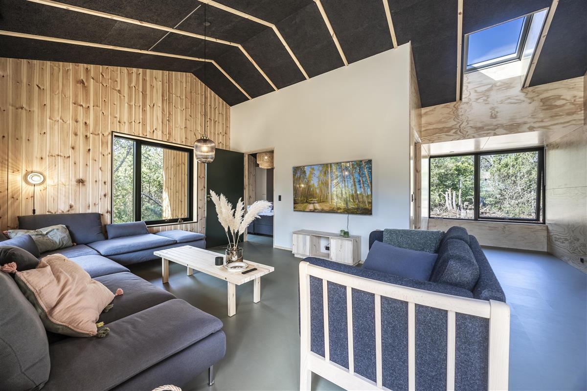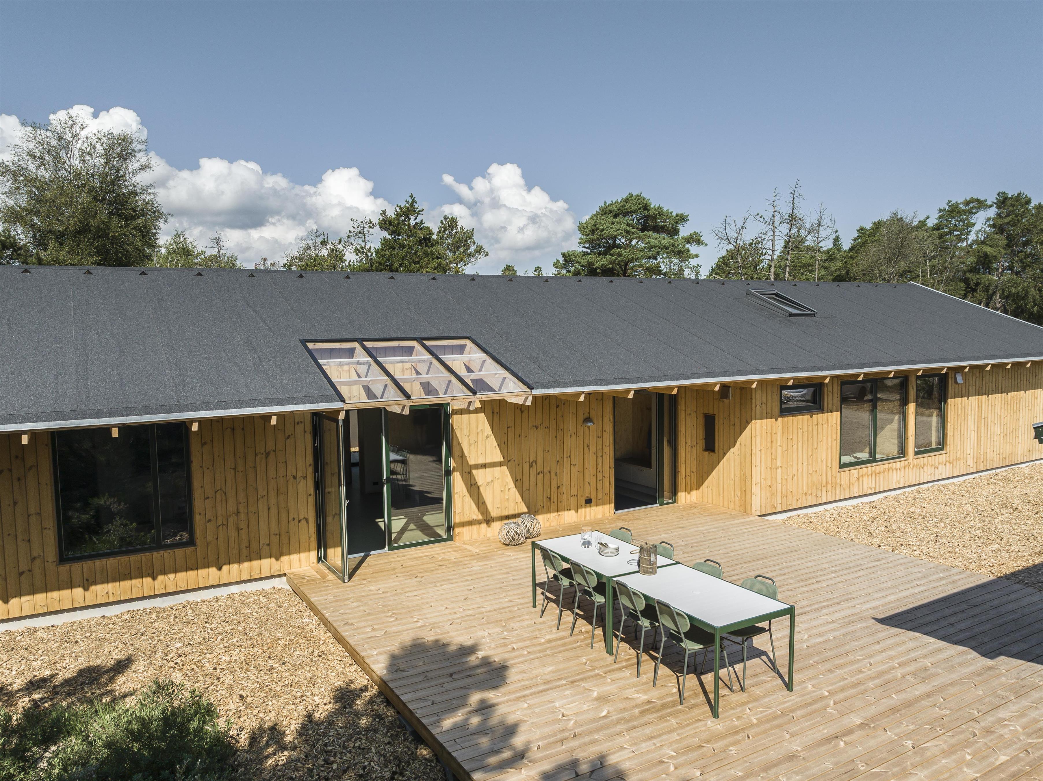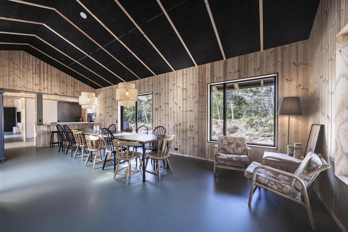 The holiday home is built with an emphasis on quality and eco-friendliness, which is evident in every detail. Inside, you will find four spacious bedrooms and two inviting alcoves, providing accommodation for up to 14 guests. Large windows allow abundant natural light to enter while creating a beautiful connection to the surrounding landscape.