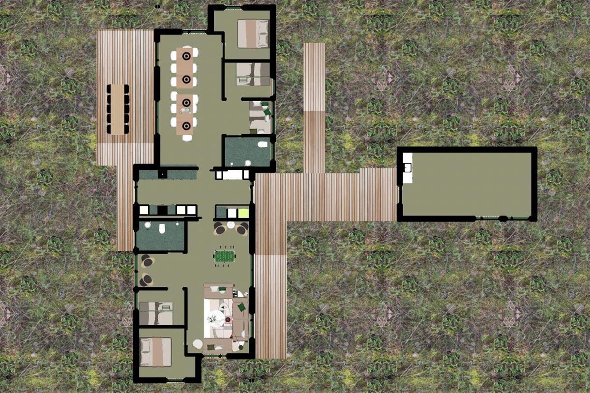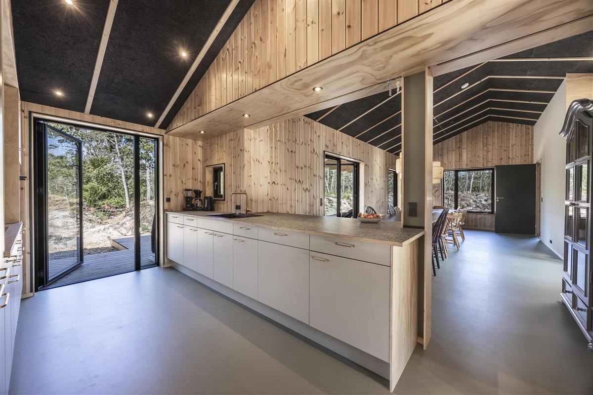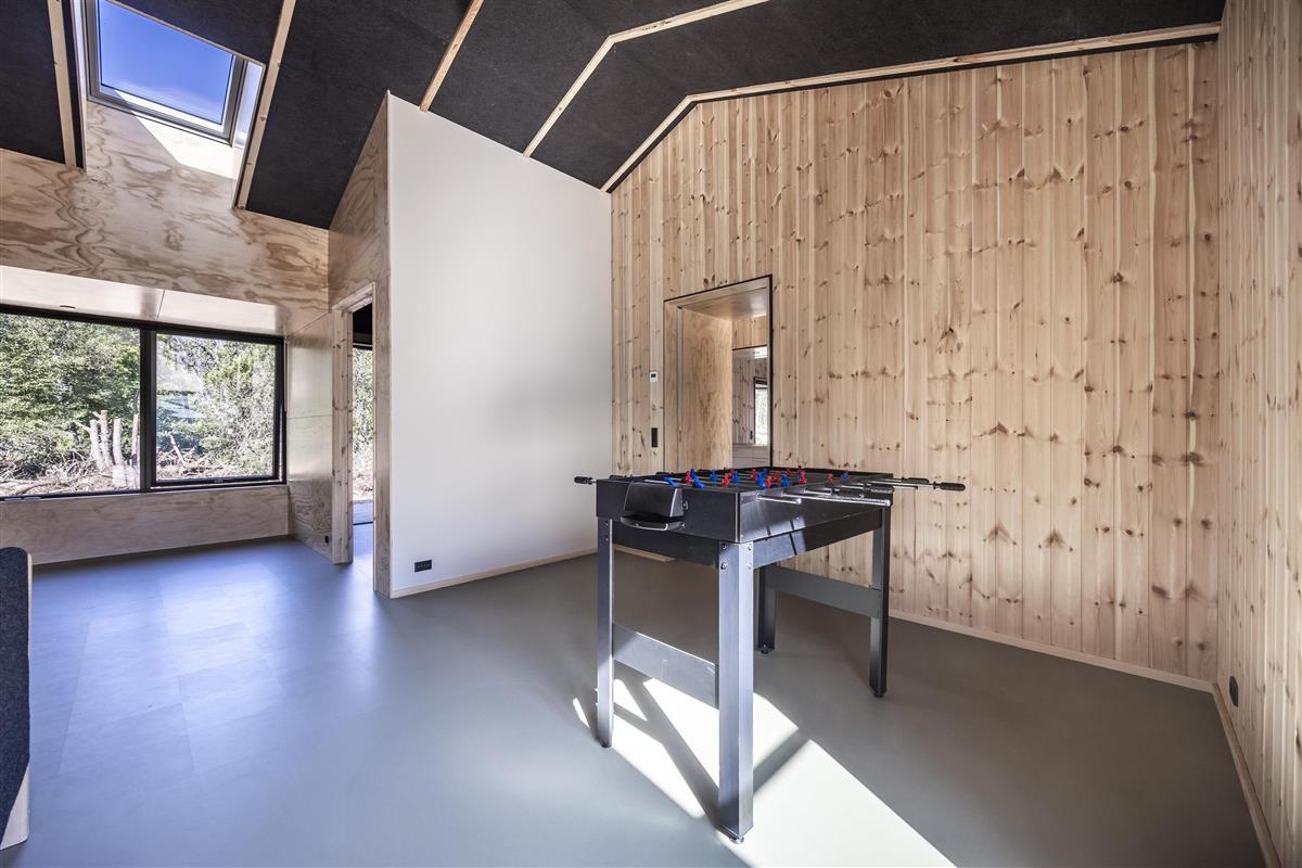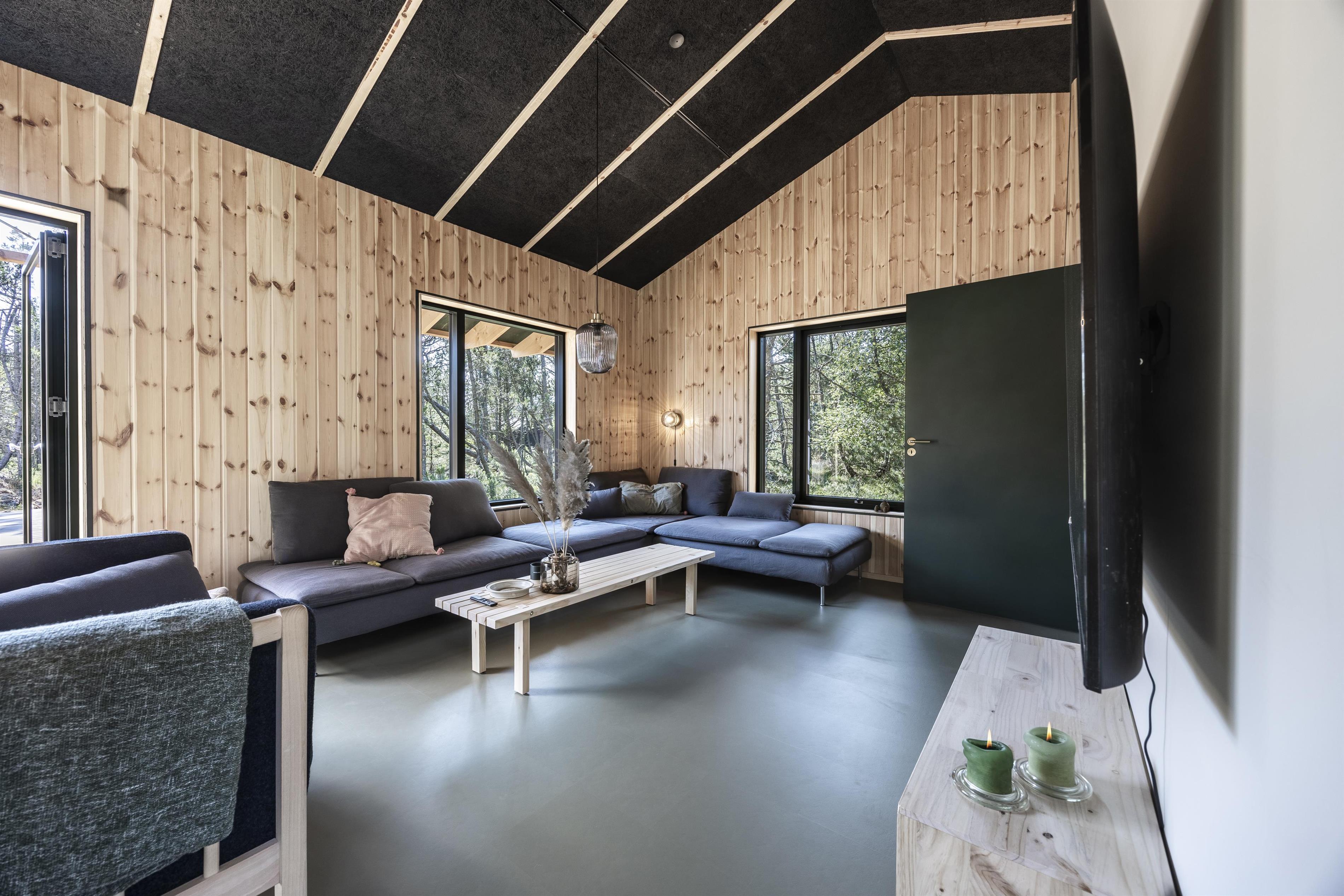 The holiday home is built with an emphasis on quality and eco-friendliness, which is evident in every detail. Inside, you will find four spacious bedrooms and two inviting alcoves, providing accommodation for up to 14 guests. Large windows allow abundant natural light to enter while creating a beautiful connection to the surrounding landscape.