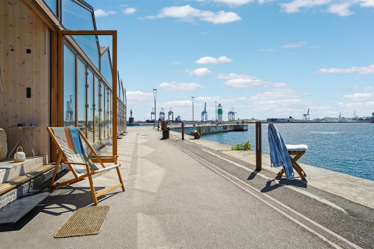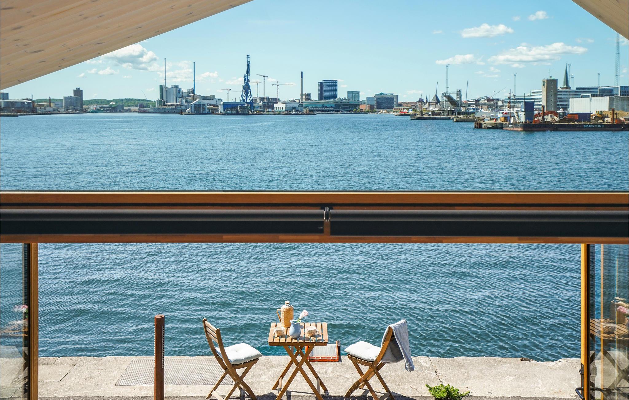 Moderne studio in Aarhus Ø met panoramisch uitzicht op het water en comfortabele voorzieningen.