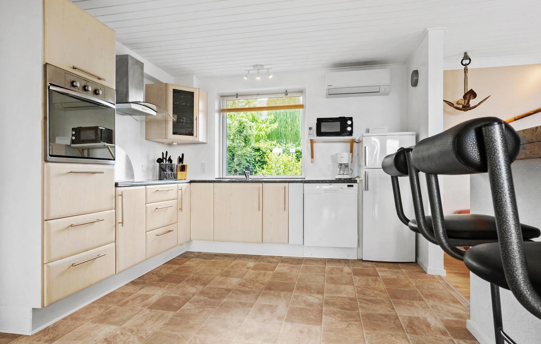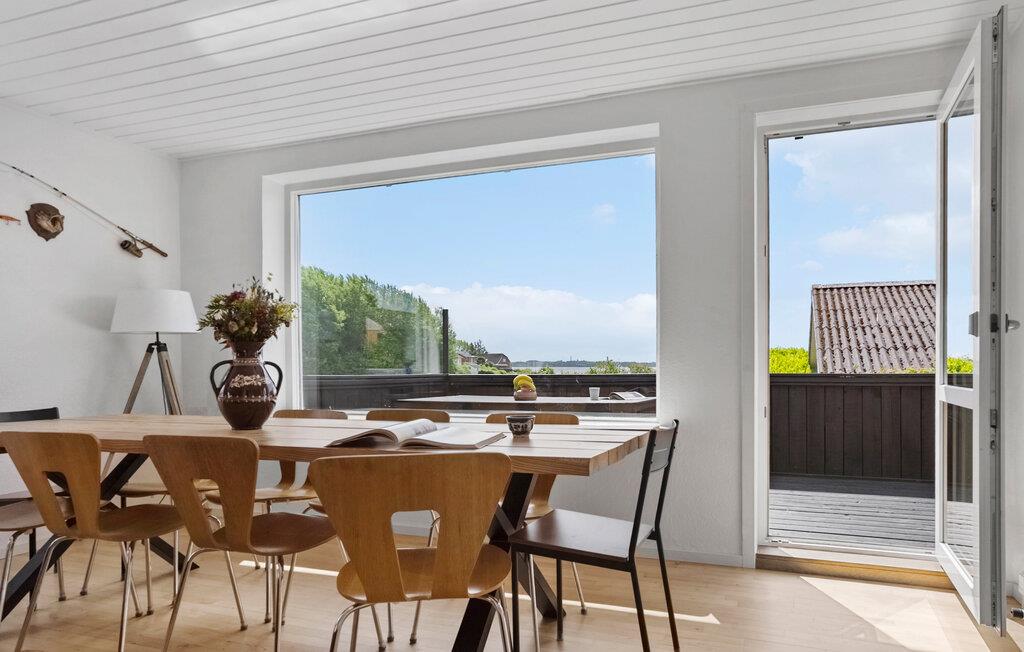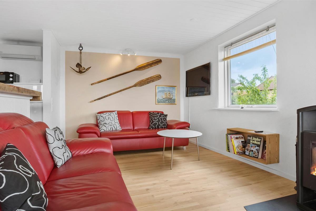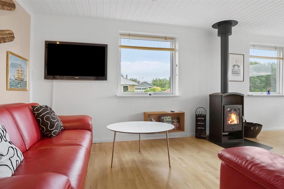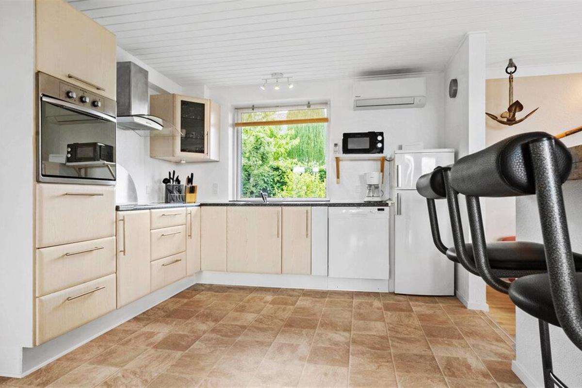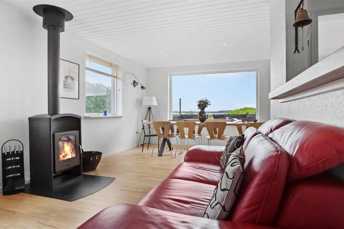 Omgeven door een prachtig landschap en met een prachtig uitzicht op het water, is dit charmante vakantiehuis op Adsbøl Strand de ideale plek om te ontsnappen aan het leven van alledag. Laat je betoveren door de rustige omgeving en geniet van ontspannen dagen aan zee. De open woonkamer met grote ramen zorgt voor veel licht en een uitnodigende sfeer. Maak het jezelf gemakkelijk op de bank, waar de open haard voor gezellige warmte zorgt op koelere dagen. In de goed uitgeruste keuken met aanrecht kun je samen koken en genieten van je maaltijden aan de grote houten eettafel. Het open ontwerp creëert een harmonieuze combinatie van koken, eten en ontspannen.
