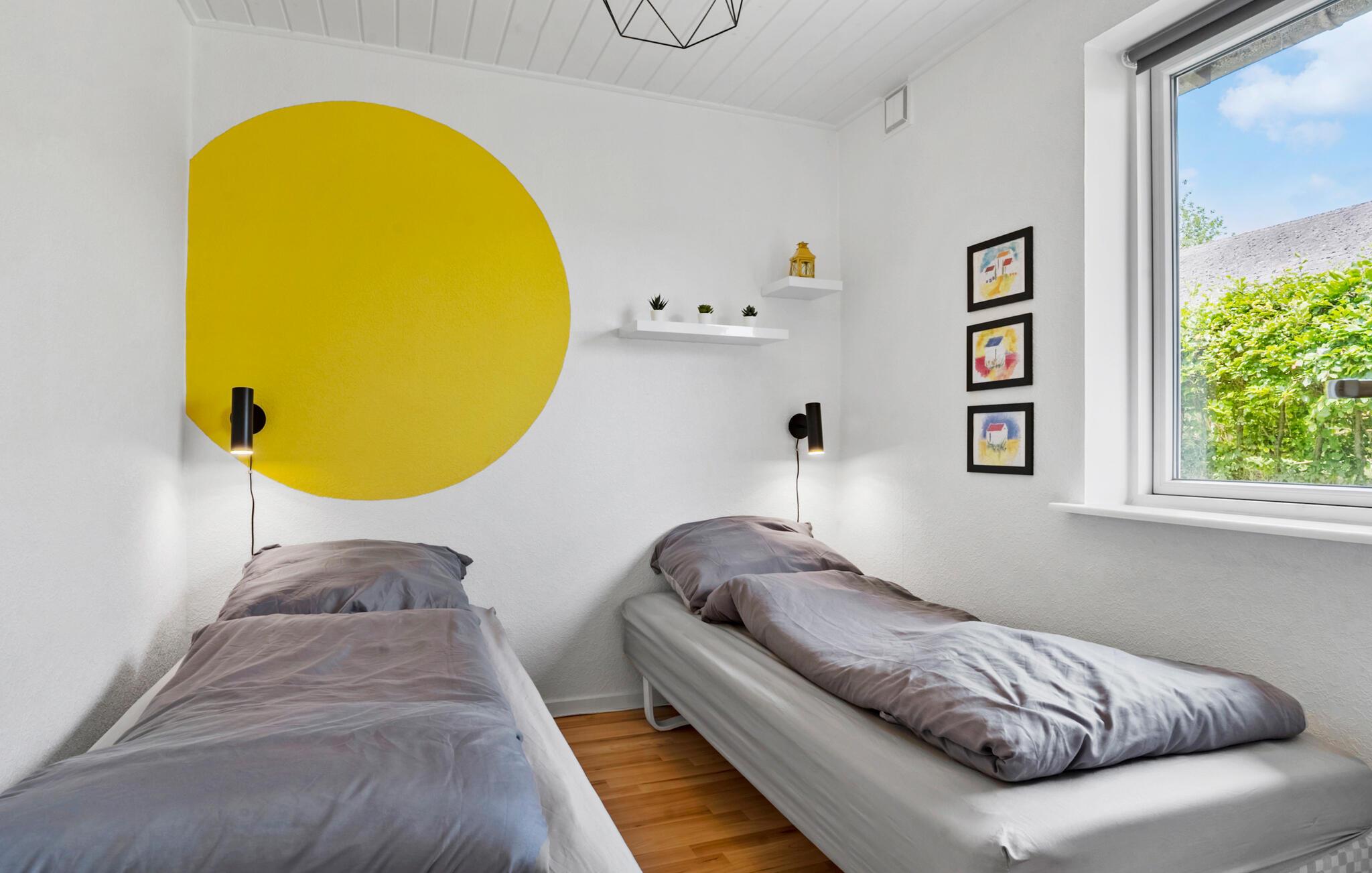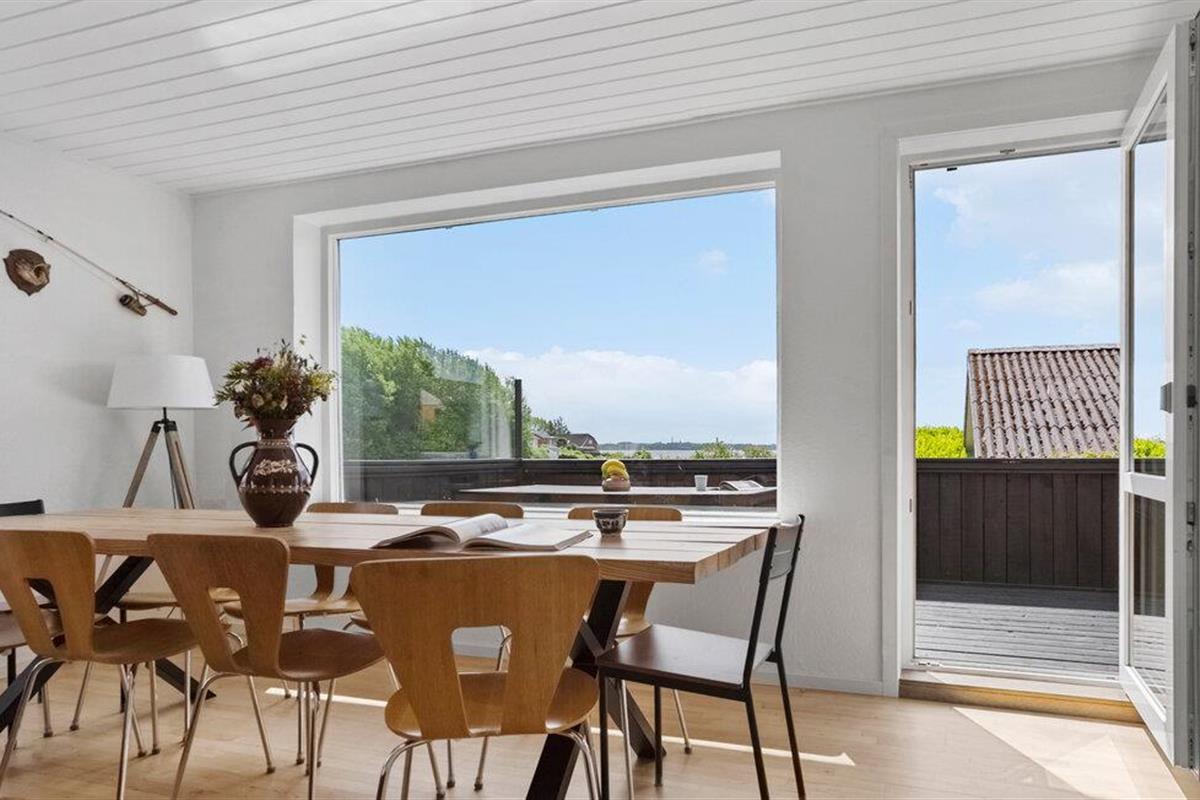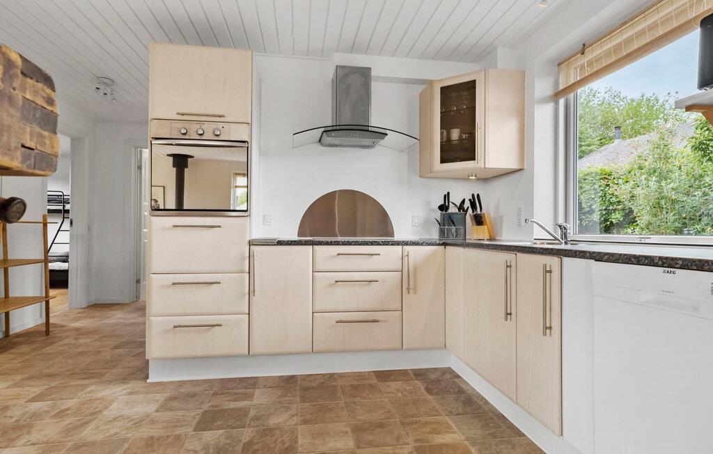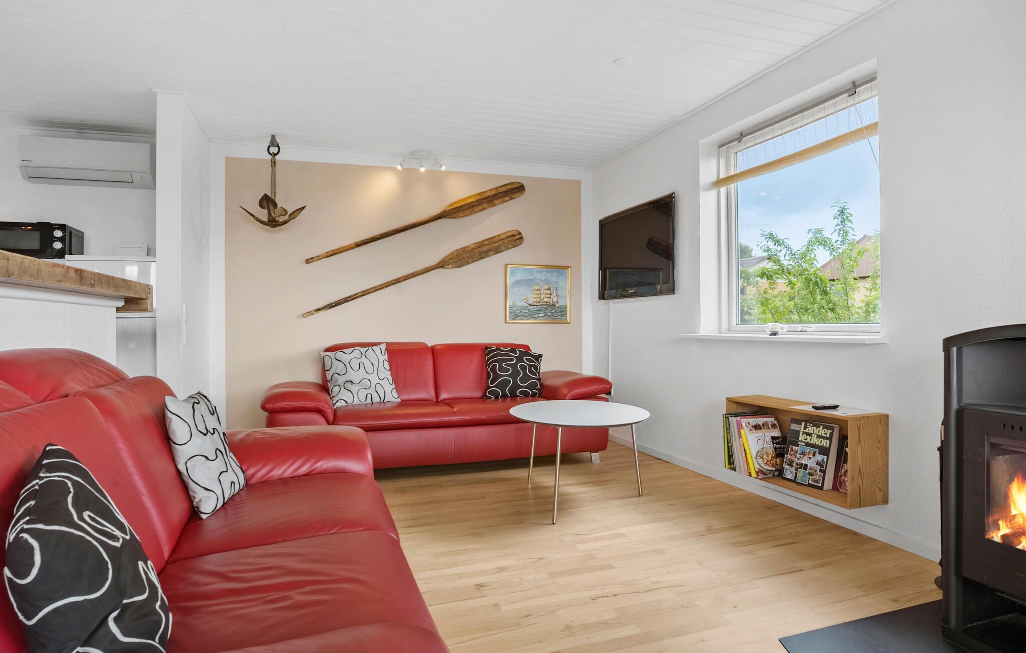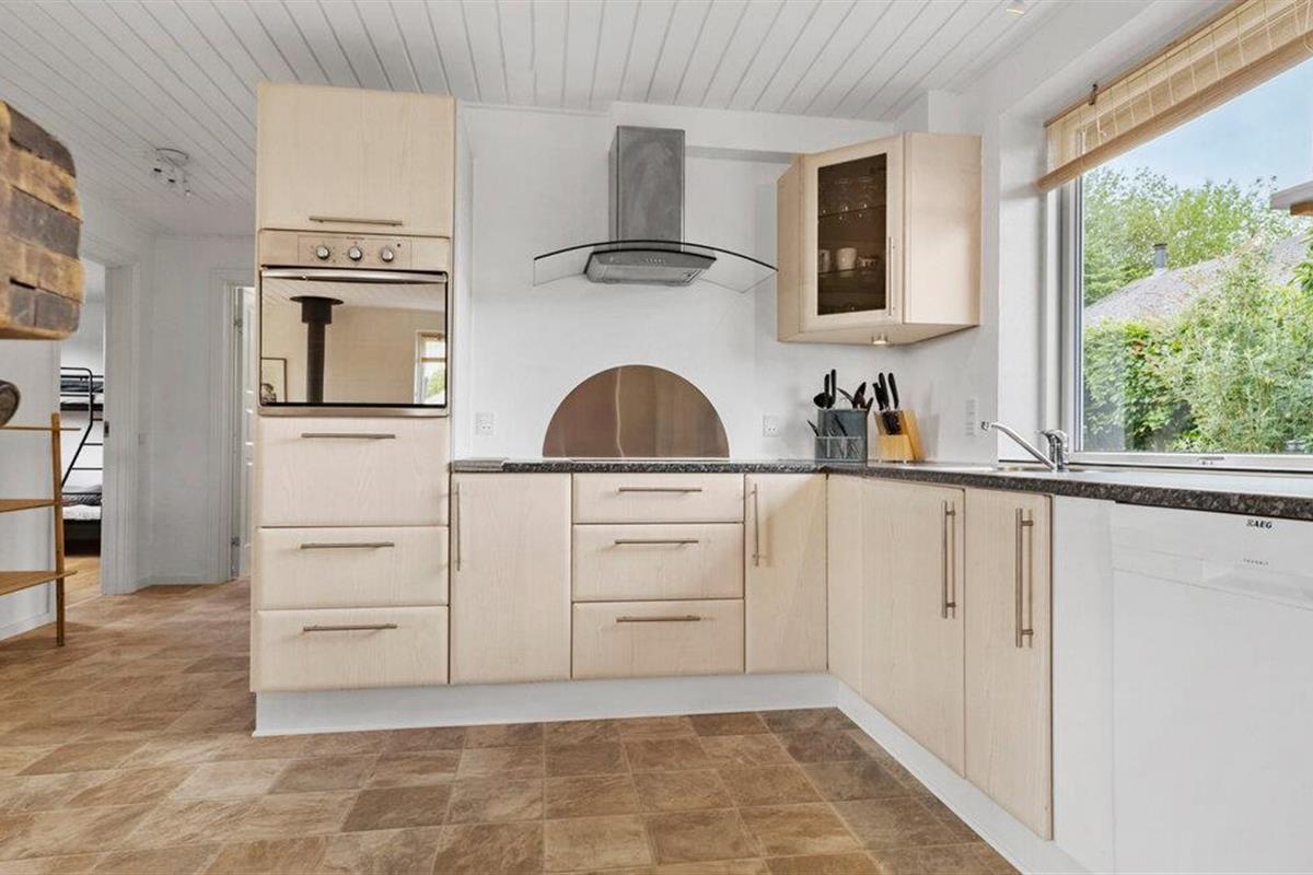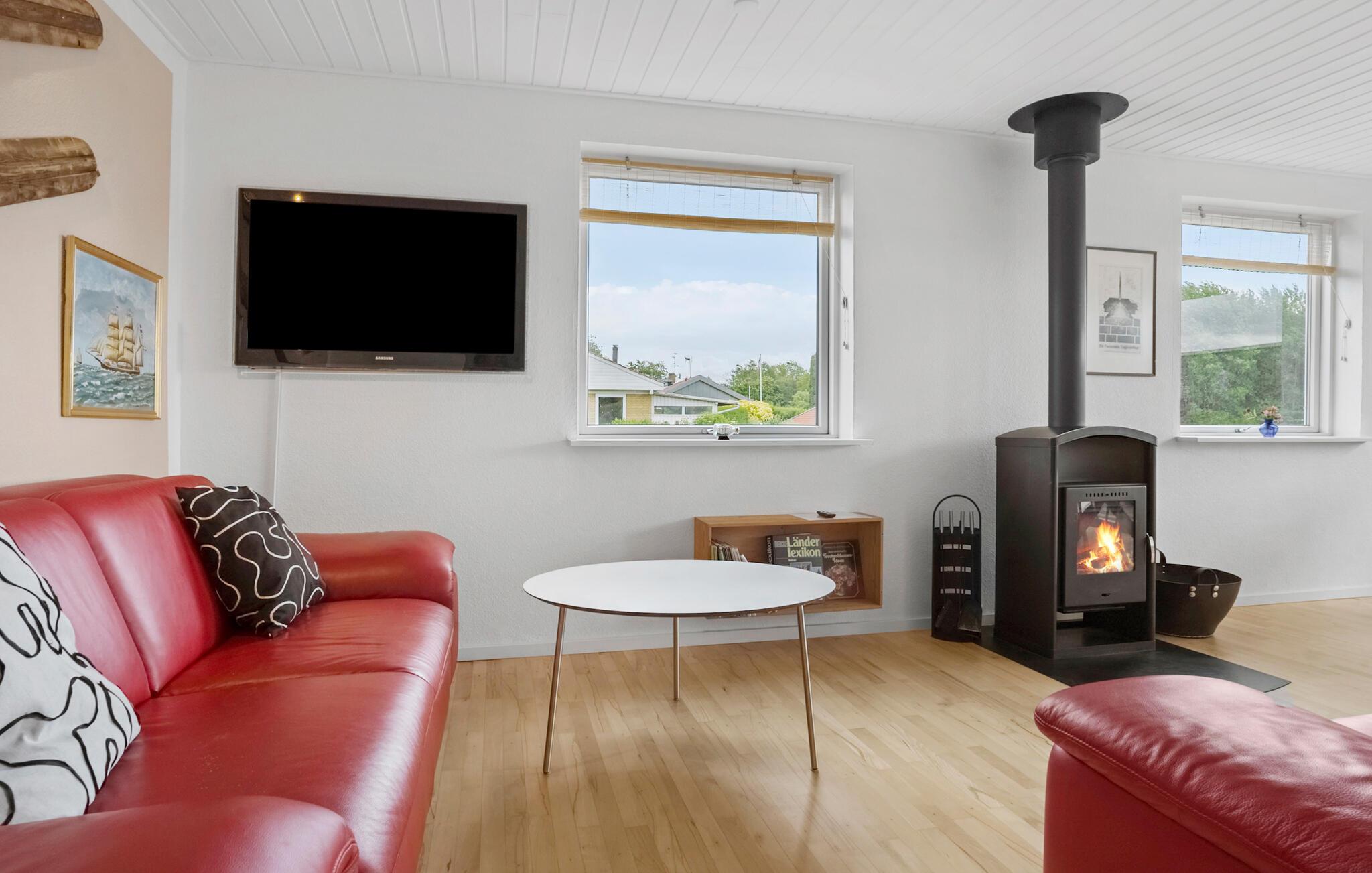 Omgeven door een prachtig landschap en met een prachtig uitzicht op het water, is dit charmante vakantiehuis op Adsbøl Strand de ideale plek om te ontsnappen aan het leven van alledag. Laat je betoveren door de rustige omgeving en geniet van ontspannen dagen aan zee. De open woonkamer met grote ramen zorgt voor veel licht en een uitnodigende sfeer. Maak het jezelf gemakkelijk op de bank, waar de open haard voor gezellige warmte zorgt op koelere dagen. In de goed uitgeruste keuken met aanrecht kun je samen koken en genieten van je maaltijden aan de grote houten eettafel. Het open ontwerp creëert een harmonieuze combinatie van koken, eten en ontspannen.