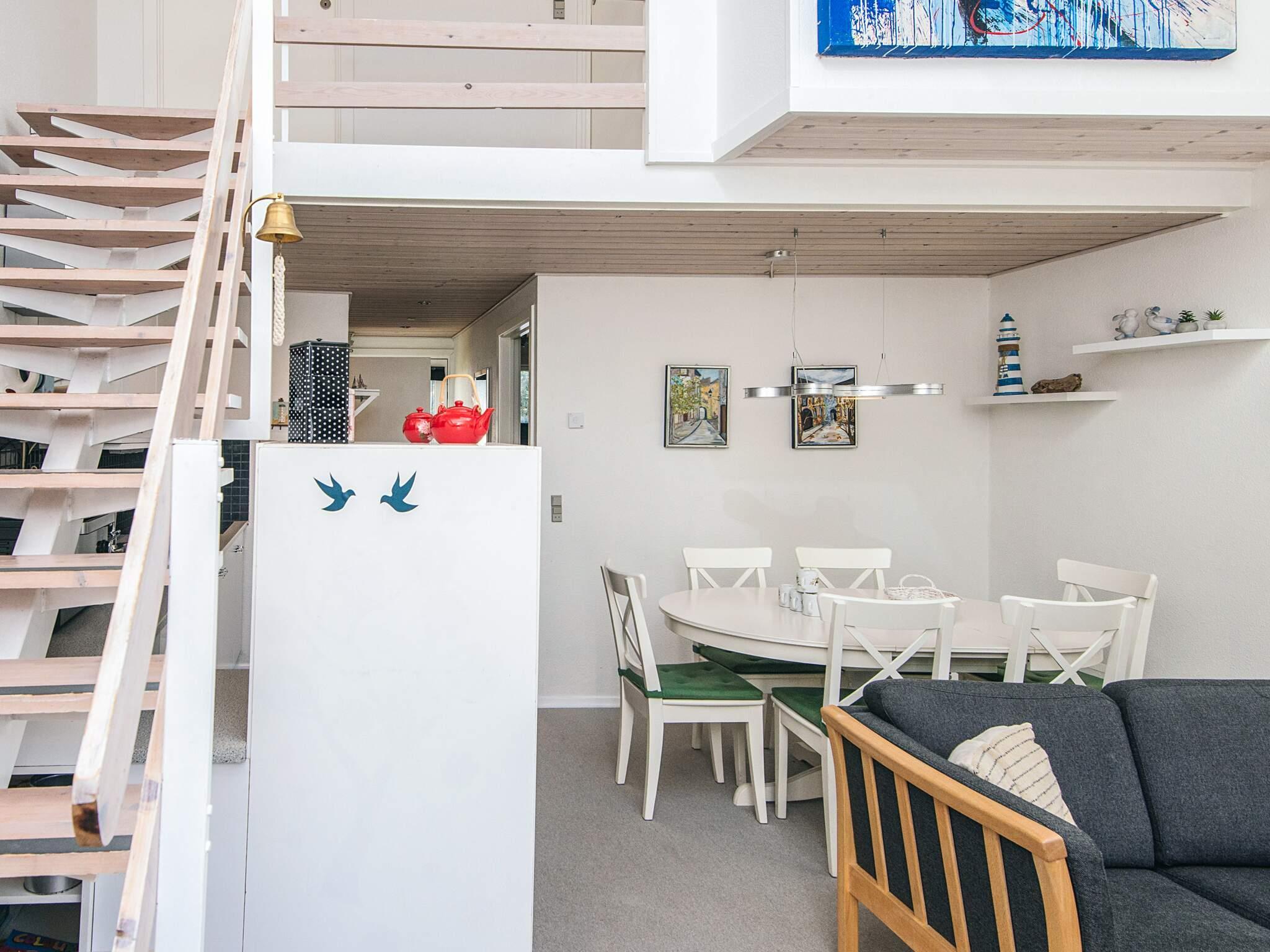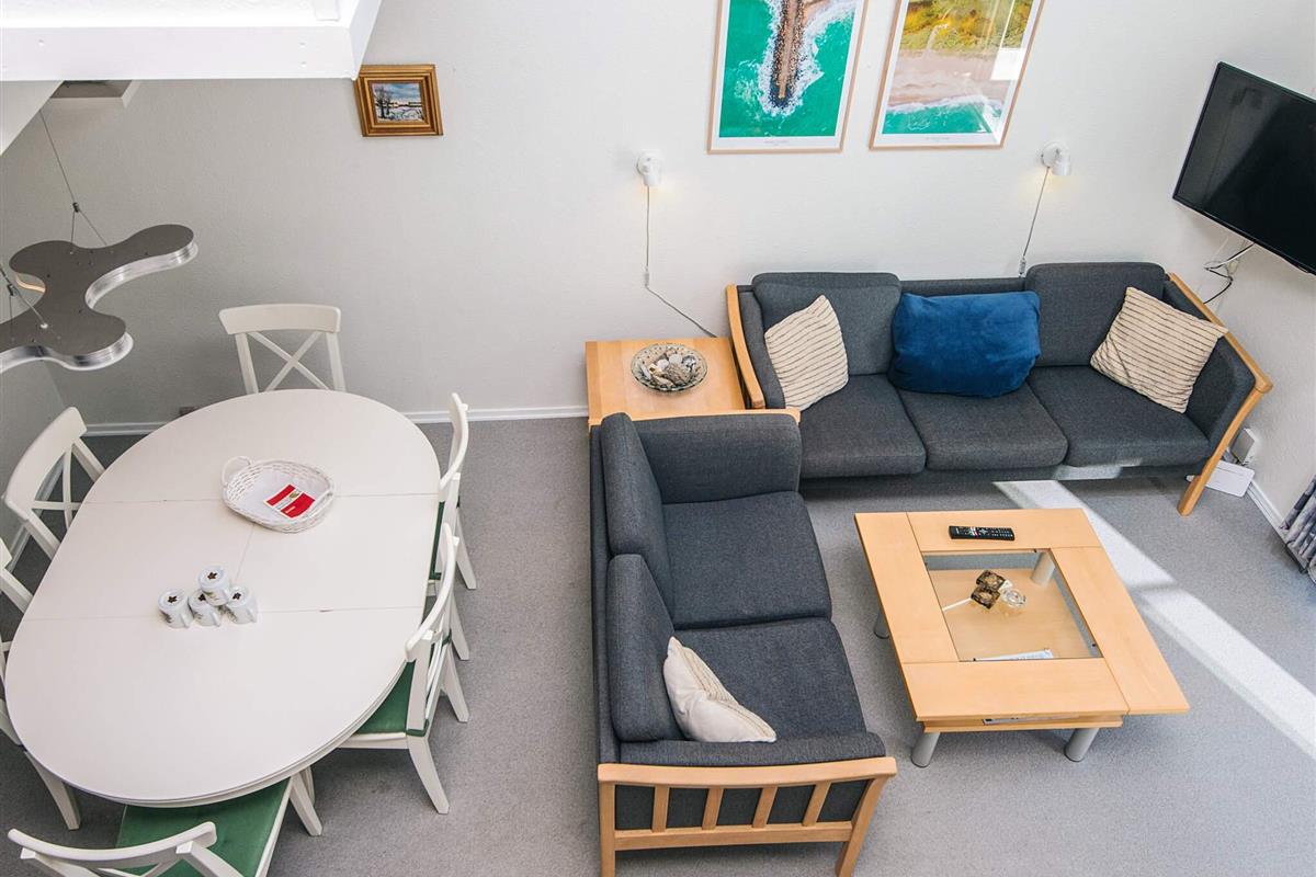 Das Herzstück der Wohnung bildet der offene Küchen- und Wohnbereich – ein einladender Raum, in dem Kochen, Essen und Entspannen harmonisch ineinander übergehen. Die Dachschräge des Wohnzimmers schafft eine luftige und großzügige Atmosphäre, die durch großzügige Terrassentüren mit viel Tageslicht noch verstärkt wird. Von hier aus haben Sie direkten Zugang zur Terrasse mit Essbereich, wo Sie Ihre Mahlzeiten an der frischen Seeluft genießen oder nach einem erlebnisreichen Tag einfach entspannen können.