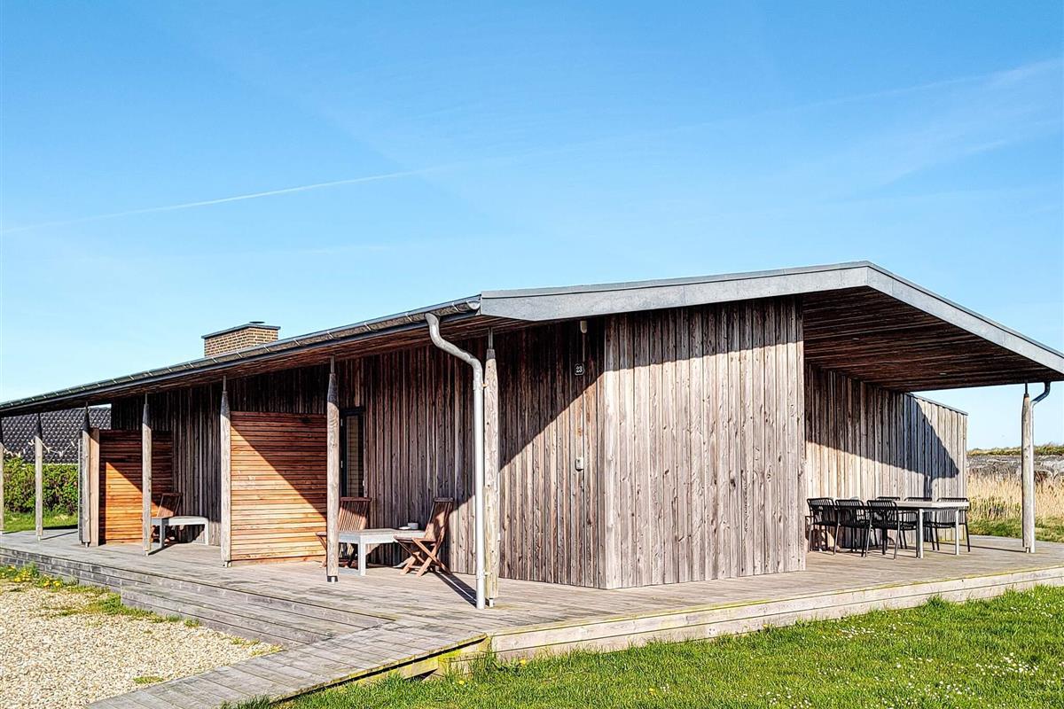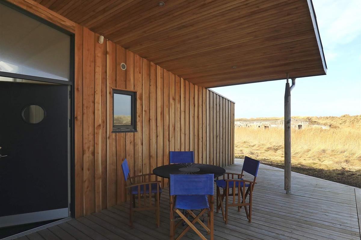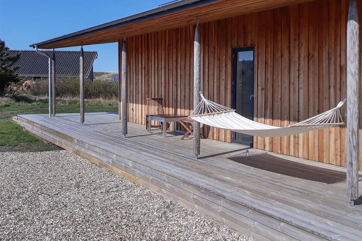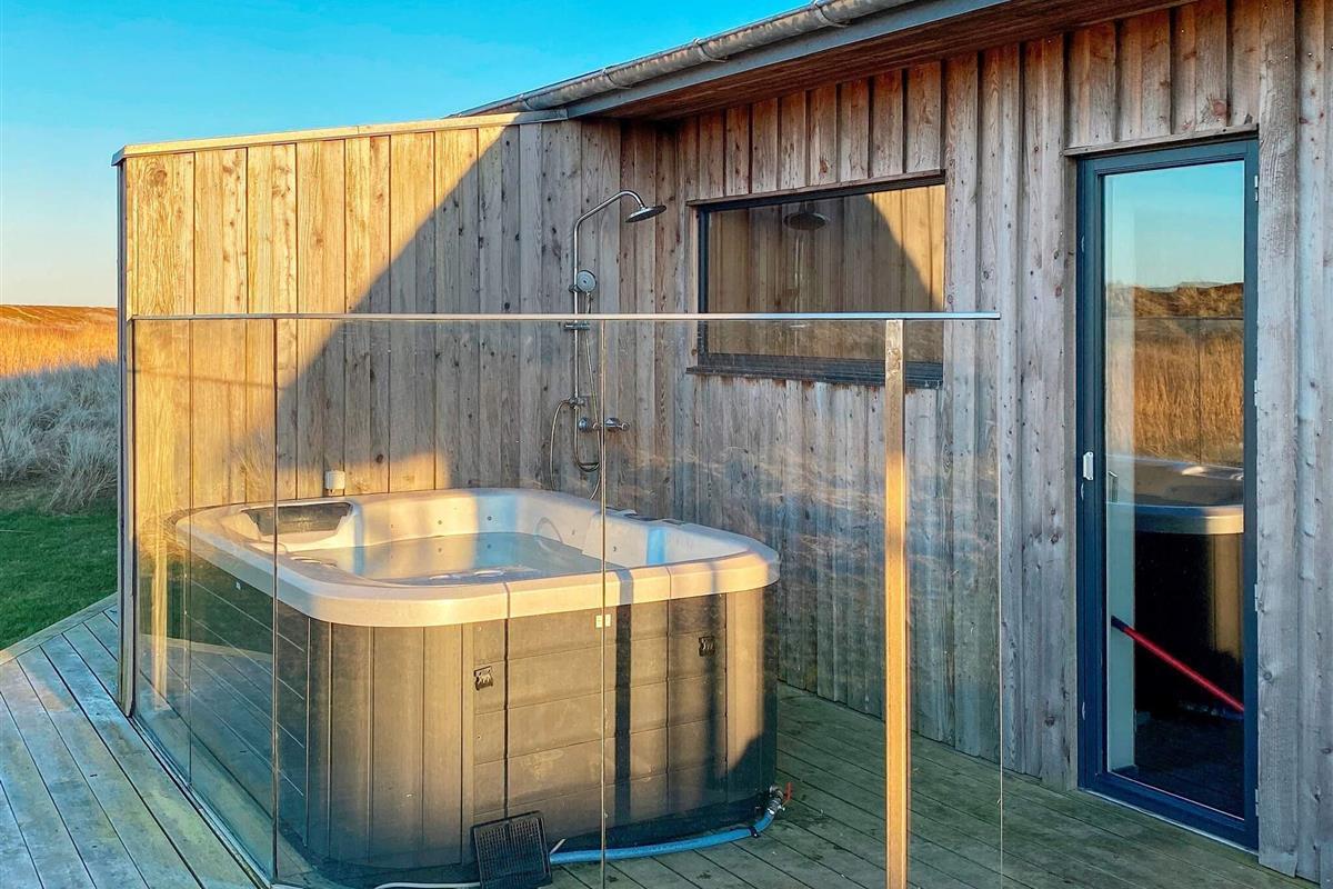 Dieses helle, einladende Ferienhaus mit großer Terrassenfläche hat einige Besonderheiten zu bieten. Dazu zählen auch ein abgesenkter Außenwhirlpool mit schützender Glaswand und Ausblick zur Dünenlandschaft sowie eine praktische Außendusche. Außerdem steht im Badezimmer des Hauses eine Sauna für kühlere Tage bereit.